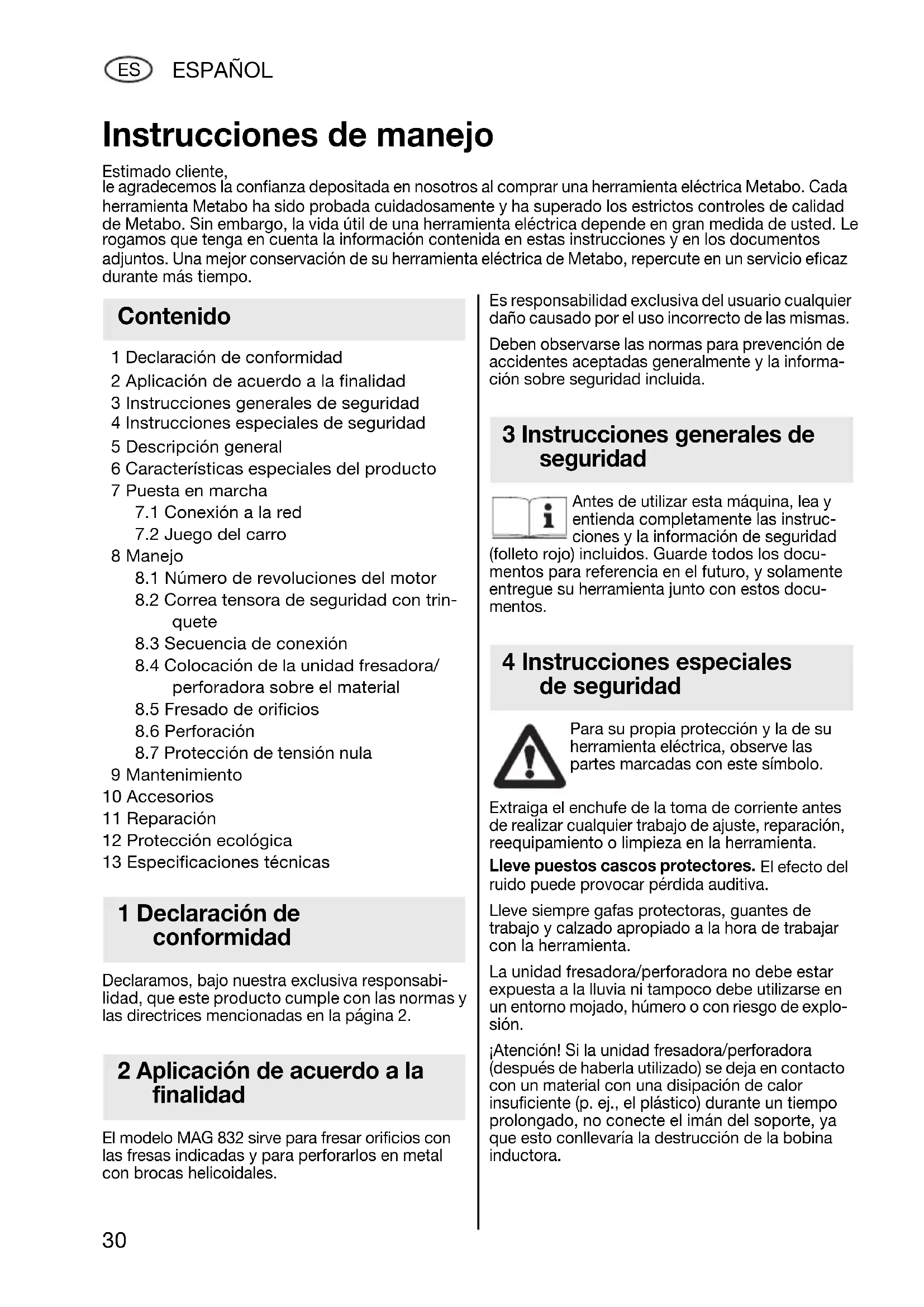 1 Declaración de conformidad 2 Aplicación de acuerdo a la finalidad 3 Instrucciones generales de seguridad 4 Instrucciones especiales de seguridad 5 Descripción general 6 Características especiales del producto 7 Puesta en marcha
