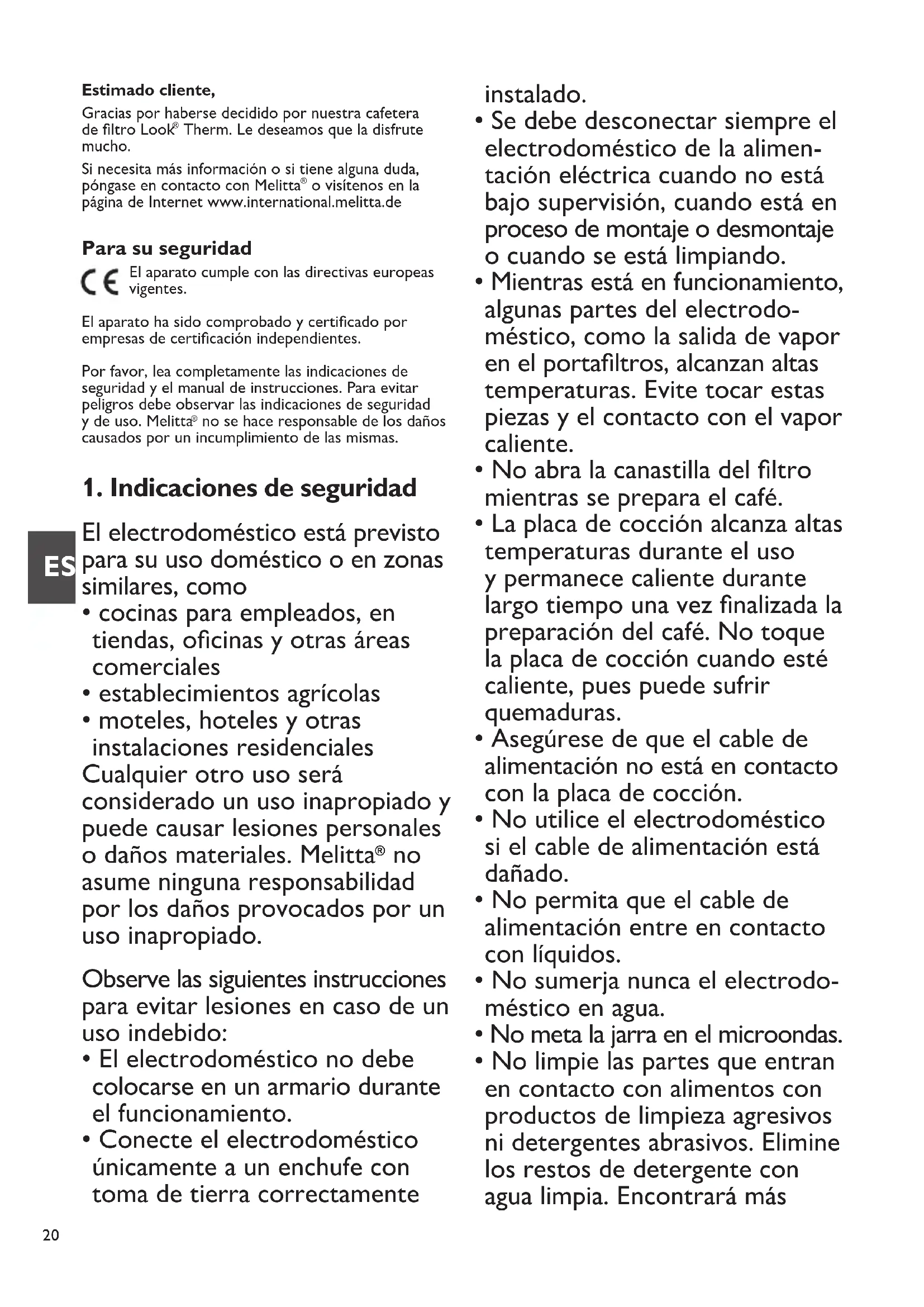 El aparato cumple con las directivas europeas vigentes. El aparato ha sido comprobado y certificado por empresas de certificación independientes. Por favor, lea completamente las indicaciones de seguridad y el manual de instrucciones. Para evitar peligros debe observar las indicaciones de seguridad y de uso. Melitta