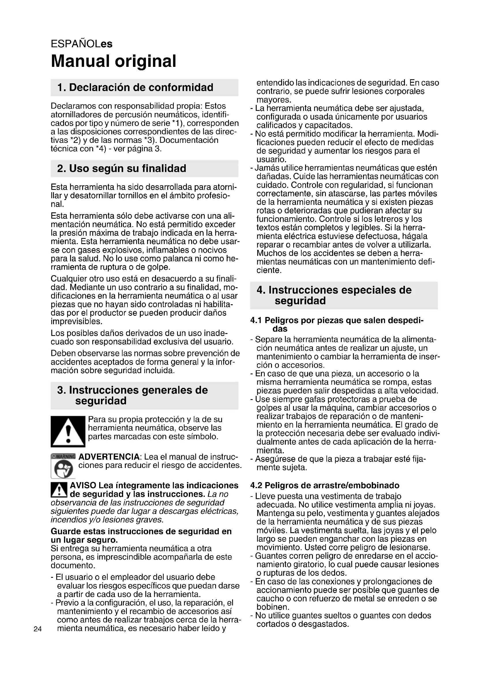 Declaramos con responsabilidad propia: Estos atornilladores de percusión neumáticos, identificados por tipo y número de série 1), corresponden a las dispositions correspondentes de las directivas 2) y de las normas 3). Documentación技术水平 con 4) - ver頁目 3.