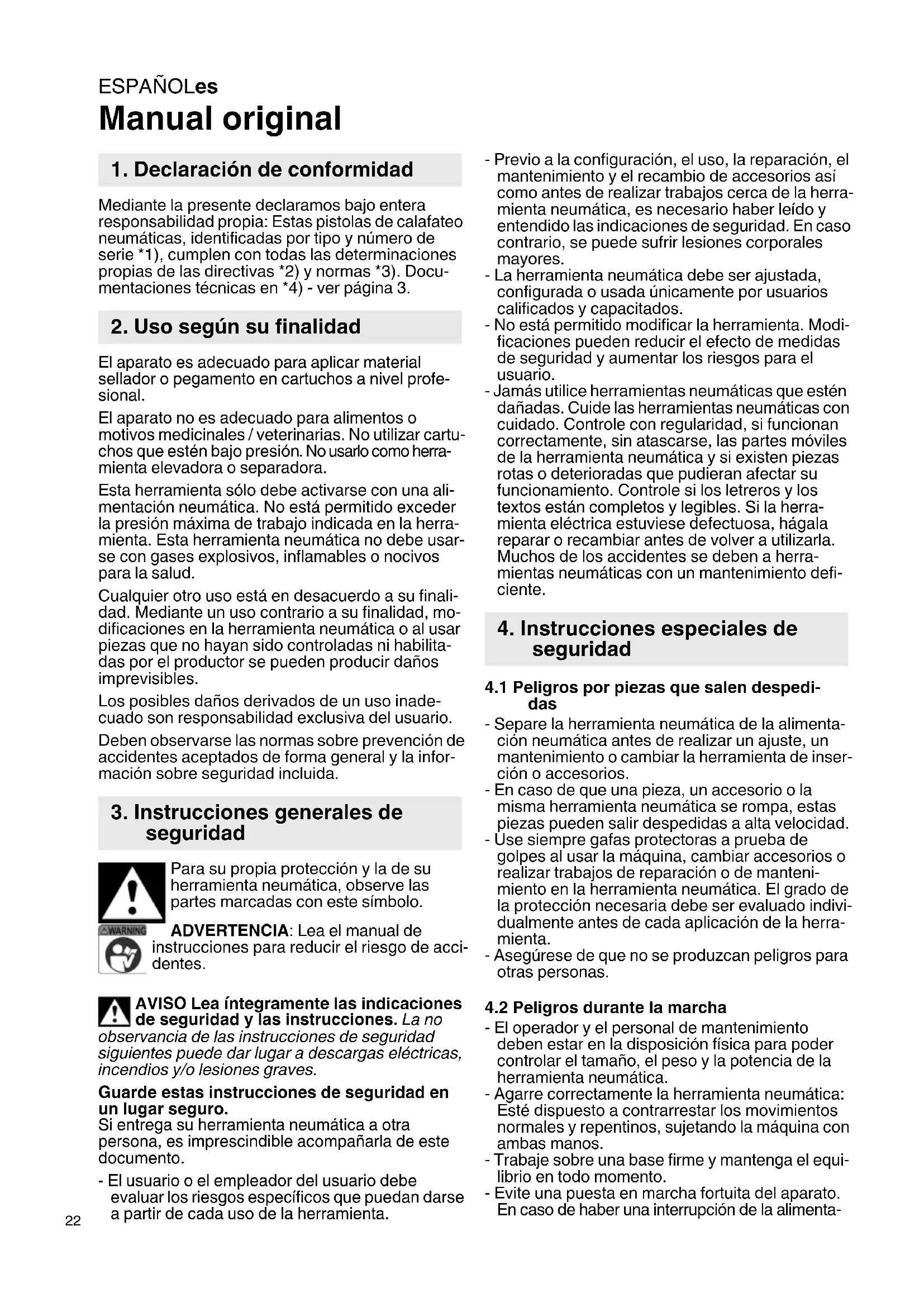 Manual original Mediante la presente declaramos bajo entera responsabilidad propia: Estas pistolas de calafateo neumáticas, identificadas por tipo y número de serie *1), cumplen con todas las determinaciones propias de las directivas *2) y normas *3). Docu- mentaciones técnicas en *4) - ver página 3. El aparato es adecuado para aplicar material sellador o pegamento en cartuchos a nivel profe- sional. El aparato no es adecuado para alimentos o motivos medicinales / veterinarias. No utilizar cartu- chos que estén bajo presión. No usarlo como herra- mienta elevadora o separadora. Esta herramienta sólo debe activarse con una ali- mentación neumática. No está permitido exceder la presión máxima de trabajo indicada en la herra- mienta. Esta herramienta neumática no debe usar- se con gases explosivos, inflamables o nocivos para la salud. Cualquier otro uso está en desacuerdo a su finali- dad. Mediante un uso contrario a su finalidad, mo- dificaciones en la herramienta neumática o al usar piezas que no hayan sido controladas ni habilita- das por el productor se pueden producir daños imprevisibles. Los posibles daños derivados de un uso inade- cuado son responsabilidad exclusiva del usuario. Deben observarse las normas sobre prevención de accidentes aceptados de forma general y la infor- mación sobre seguridad incluida. Para su propia protección y la de su herramienta neumática, observe las partes marcadas con este símbolo. ADVERTENCIA: Lea el manual de instrucciones para reducir el riesgo de acci- dentes. AVISO Lea íntegramente las indicaciones de seguridad y las instrucciones. La no observancia de las instrucciones de seguridad siguientes puede dar lugar a descargas eléctricas, incendios y/o lesiones graves. Guarde estas instrucciones de seguridad en un lugar seguro. Si entrega su herramienta neumática a otra persona, es imprescindible acompañarla de este documento. - El usuario o el empleador del usuario debe evaluar los riesgos específicos que puedan darse a partir de cada uso de la herramienta. - Previo a la configuración, el uso, la reparación, el mantenimiento y el recambio de accesorios así como antes de realizar trabajos cerca de la herra- mienta neumática, es necesario haber leído y entendido las indicaciones de seguridad. En caso contrario, se puede sufrir lesiones corporales mayores. - La herramienta neumática debe ser ajustada, configurada o usada únicamente por usuarios calificados y capacitados. - No está permitido modificar la herramienta. Modi- ficaciones pueden reducir el efecto de medidas de seguridad y aumentar los riesgos para el usuario. - Jamás utilice herramientas neumáticas que estén dañadas. Cuide las herramientas neumáticas con cuidado. Controle con regularidad, si funcionan correctamente, sin atascarse, las partes móviles de la herramienta neumática y si existen piezas rotas o deterioradas que pudieran afectar su funcionamiento. Controle si los letreros y los textos están completos y legibles. Si la herra- mienta eléctrica estuviese defectuosa, hágala reparar o recambiar antes de volver a utilizarla. Muchos de los accidentes se deben a herra- mientas neumáticas con un mantenimiento defi- ciente.