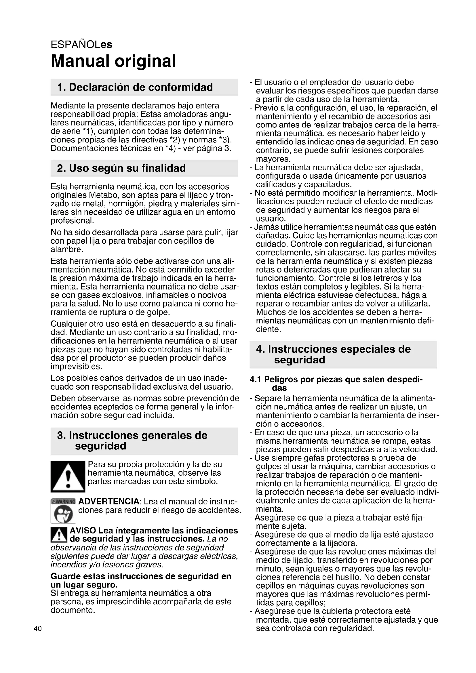 Manual original Mediante la presente declaramos bajo entera responsabilidad propia: Estas amoladoras angu- lares neumáticas, identificadas por tipo y número de serie *1), cumplen con todas las determina- ciones propias de las directivas *2) y normas *3). Documentaciones técnicas en *4) - ver página 3. Esta herramienta neumática, con los accesorios originales Metabo, son aptas para el lijado y tron- zado de metal, hormigón, piedra y materiales simi- lares sin necesidad de utilizar agua en un entorno profesional. No ha sido desarrollada para usarse para pulir, lijar con papel lija o para trabajar con cepillos de alambre. Esta herramienta sólo debe activarse con una ali- mentación neumática. No está permitido exceder la presión máxima de trabajo indicada en la herra- mienta. Esta herramienta neumática no debe usar- se con gases explosivos, inflamables o nocivos para la salud. No lo use como palanca ni como he- rramienta de ruptura o de golpe. Cualquier otro uso está en desacuerdo a su finali- dad. Mediante un uso contrario a su finalidad, mo- dificaciones en la herramienta neumática o al usar piezas que no hayan sido controladas ni habilita- das por el productor se pueden producir daños imprevisibles. Los posibles daños derivados de un uso inade- cuado son responsabilidad exclusiva del usuario. Deben observarse las normas sobre prevención de accidentes aceptados de forma general y la infor- mación sobre seguridad incluida. Para su propia protección y la de su herramienta neumática, observe las partes marcadas con este símbolo. ADVERTENCIA: Lea el manual de instruc- ciones para reducir el riesgo de accidentes. AVISO Lea íntegramente las indicaciones de seguridad y las instrucciones. La no observancia de las instrucciones de seguridad siguientes puede dar lugar a descargas eléctricas, incendios y/o lesiones graves. Guarde estas instrucciones de seguridad en un lugar seguro. Si entrega su herramienta neumática a otra persona, es imprescindible acompañarla de este documento. - El usuario o el empleador del usuario debe evaluar los riesgos específicos que puedan darse a partir de cada uso de la herramienta. - Previo a la configuración, el uso, la reparación, el mantenimiento y el recambio de accesorios así como antes de realizar trabajos cerca de la herra- mienta neumática, es necesario haber leído y entendido las indicaciones de seguridad. En caso contrario, se puede sufrir lesiones corporales mayores. - La herramienta neumática debe ser ajustada, configurada o usada únicamente por usuarios calificados y capacitados. - No está permitido modificar la herramienta. Modi- ficaciones pueden reducir el efecto de medidas de seguridad y aumentar los riesgos para el usuario. - Jamás utilice herramientas neumáticas que estén dañadas. Cuide las herramientas neumáticas con cuidado. Controle con regularidad, si funcionan correctamente, sin atascarse, las partes móviles de la herramienta neumática y si existen piezas rotas o deterioradas que pudieran afectar su funcionamiento. Controle si los letreros y los textos están completos y legibles. Si la herra- mienta eléctrica estuviese defectuosa, hágala reparar o recambiar antes de volver a utilizarla. Muchos de los accidentes se deben a herra- mientas neumáticas con un mantenimiento defi- ciente.