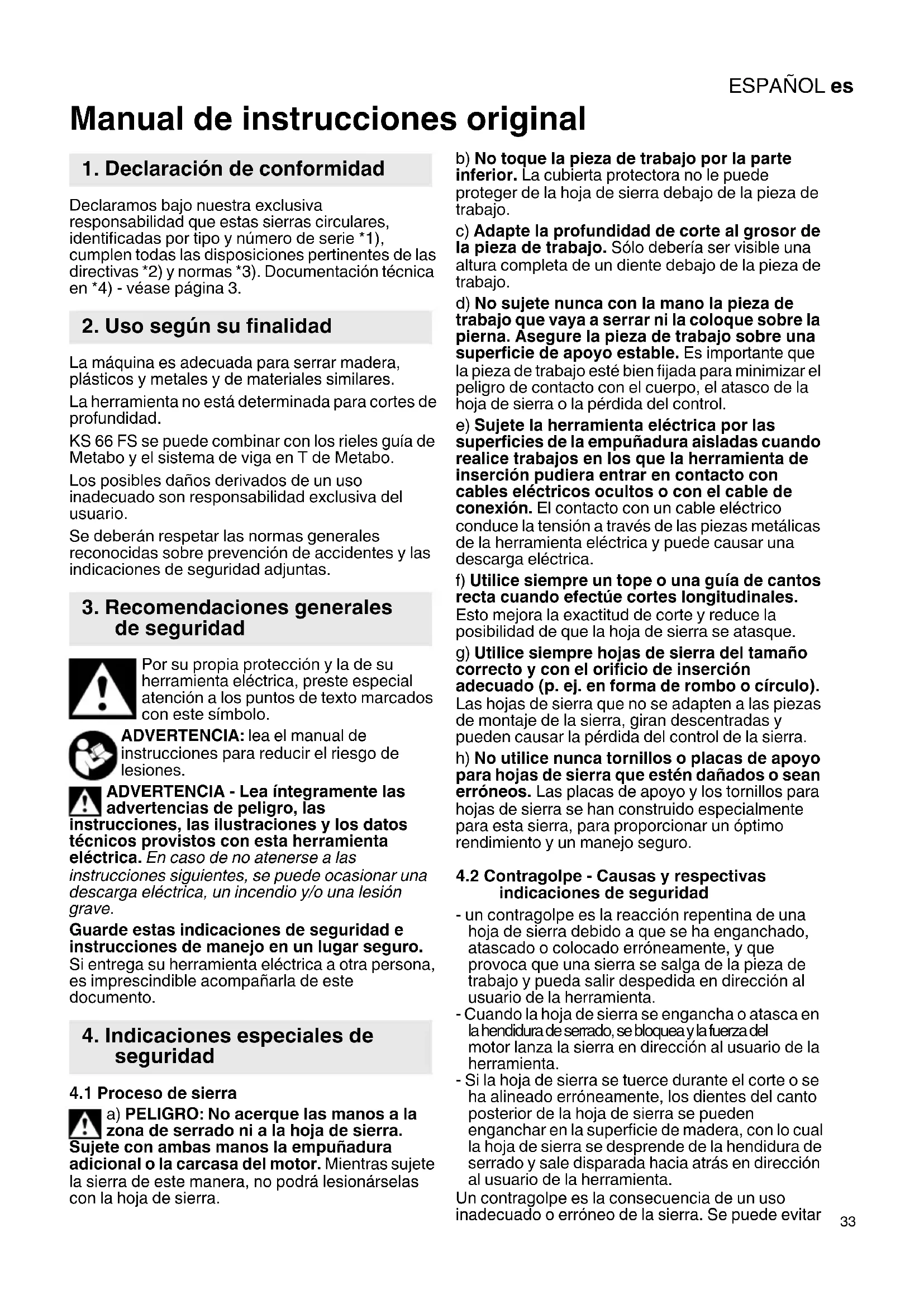 Manual de instrucciones original Declaramos bajo nuestra exclusiva responsabilidad que estas sierras circulares, identificadas por tipo y número de serie *1), cumplen todas las disposiciones pertinentes de las directivas *2) y normas *3). Documentación técnica en *4) - véase página 3. La máquina es adecuada para serrar madera, plásticos y metales y de materiales similares. La herramienta no está determinada para cortes de profundidad. KS 66 FS se puede combinar con los rieles guía de Metabo y el sistema de viga en T de Metabo. Los posibles daños derivados de un uso inadecuado son responsabilidad exclusiva del usuario. Se deberán respetar las normas generales reconocidas sobre prevención de accidentes y las indicaciones de seguridad adjuntas. Por su propia protección y la de su herramienta eléctrica, preste especial atención a los puntos de texto marcados con este símbolo. ADVERTENCIA: lea el manual de instrucciones para reducir el riesgo de lesiones. ADVERTENCIA - Lea íntegramente las advertencias de peligro, las instrucciones, las ilustraciones y los datos técnicos provistos con esta herramienta eléctrica. En caso de no atenerse a las instrucciones siguientes, se puede ocasionar una descarga eléctrica, un incendio y/o una lesión grave. Guarde estas indicaciones de seguridad e instrucciones de manejo en un lugar seguro. Si entrega su herramienta eléctrica a otra persona, es imprescindible acompañarla de este documento.
