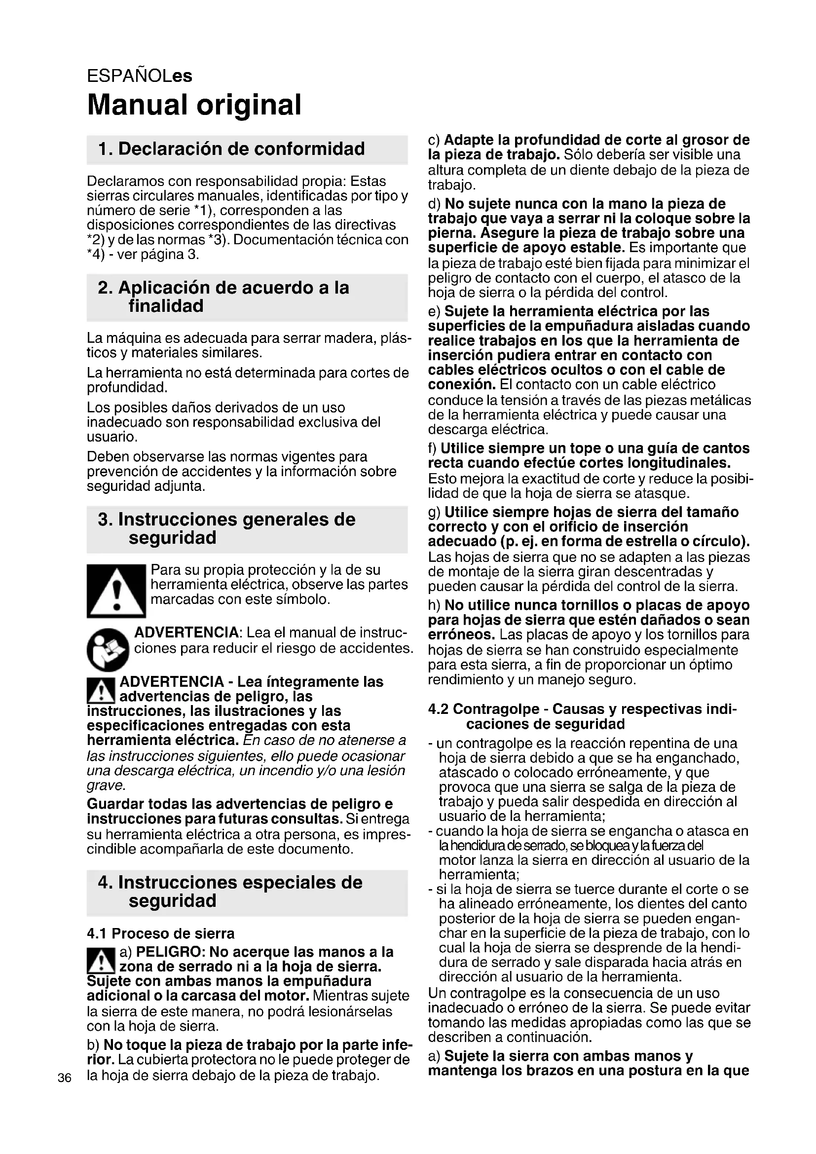 Manual original Declaramos con responsabilidad propia: Estas sierras circulares manuales, identificadas por tipo y número de serie *1), corresponden a las disposiciones correspondientes de las directivas *2) y de las normas *3). Documentación técnica con *4) - ver página 3. La máquina es adecuada para serrar madera, plás- ticos y materiales similares. La herramienta no está determinada para cortes de profundidad. Los posibles daños derivados de un uso inadecuado son responsabilidad exclusiva del usuario. Deben observarse las normas vigentes para prevención de accidentes y la información sobre seguridad adjunta. Para su propia protección y la de su herramienta eléctrica, observe las partes marcadas con este símbolo. ADVERTENCIA: Lea el manual de instruc- ciones para reducir el riesgo de accidentes. ADVERTENCIA - Lea íntegramente las advertencias de peligro, las instrucciones, las ilustraciones y las especificaciones entregadas con esta herramienta eléctrica. En caso de no atenerse a las instrucciones siguientes, ello puede ocasionar una descarga eléctrica, un incendio y/o una lesión grave. Guardar todas las advertencias de peligro e instrucciones para futuras consultas. Si entrega su herramienta eléctrica a otra persona, es impres- cindible acompañarla de este documento.