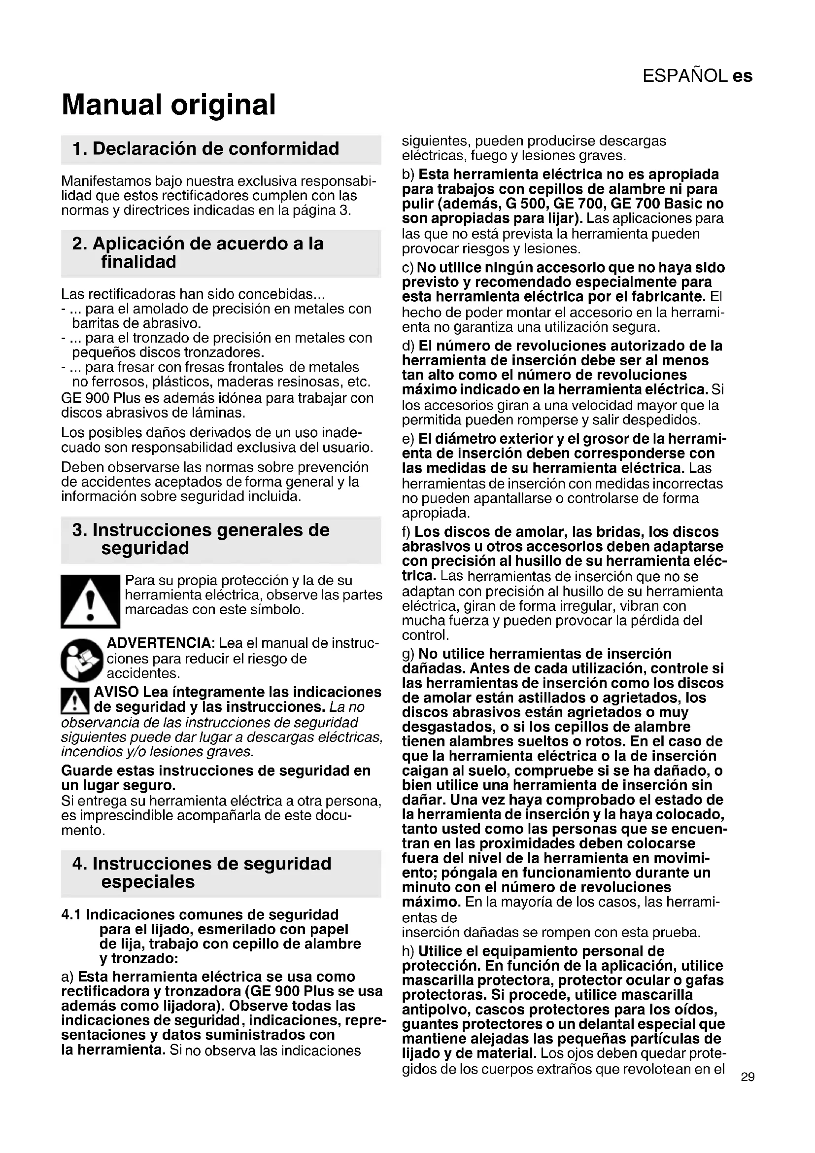 para el lijado, esmerilado con papel de lija, trabajo con cepillo de alambre y tronzado: a) E sta herramienta eléctrica se usa como rectificadora y tronzadora (GE 900 Plus se usa además como lijadora). Observe todas las indicaciones de seguridad , indicaciones, repre- sentaciones y datos suministrados con la herramienta. Si no observa las indicaciones siguientes, pueden producirse descargas eléctricas, fuego y le siones graves. b) Esta he rramienta eléctrica no es apropiada para trabajos con cepillos de alambre ni para pulir (además, G 500, GE 700, GE 700 Basic no son apropiadas para lijar). Las aplicaciones para las que no está prevista la herramienta pueden provocar riesgos y lesiones.