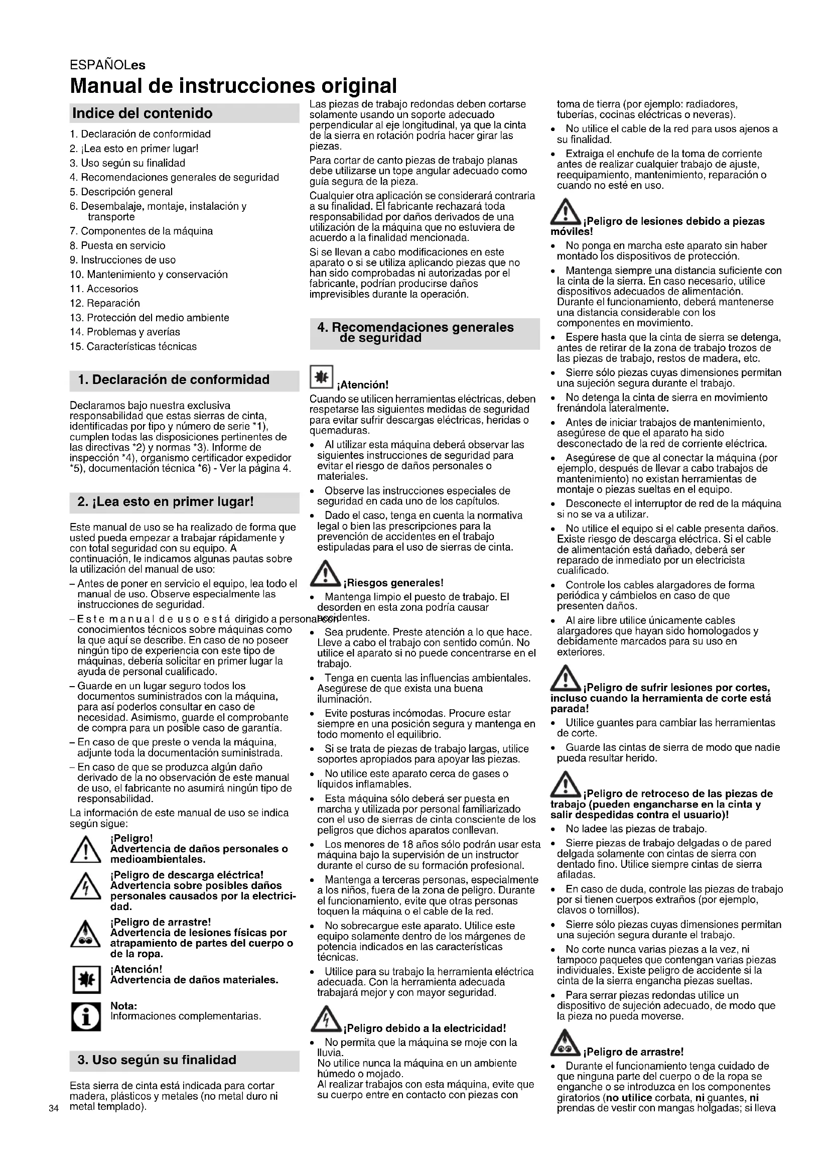 Declaramos bajo nuestra exclusiva responsabilidad que estas sierras de cinta, identificadas por tipo y número de serie *1), cumplen todas las disposiciones pertinentes de las directivas *2) y normas *3). Informe de inspección *4), organismo certificador expedidor *5), documentación técnica *6) - Ver la página 4. Este manual de uso se ha realizado de forma que usted pueda empezar a trabajar rápidamente y con total seguridad con su equipo. A continuación, le indicamos algunas pautas sobre la utilización del manual de uso: – Antes de poner en servicio el equipo, lea todo el manual de uso. Observe especialmente las instrucciones de seguridad. –Este manual de uso está dirigido a personal con conocimientos técnicos sobre máquinas como la que aquí se describe. En caso de no poseer ningún tipo de experiencia con este tipo de máquinas, debería solicitar en primer lugar la ayuda de personal cualificado. – Guarde en un lugar seguro todos los documentos suministrados con la máquina, para así poderlos consultar en caso de necesidad. Asimismo, guarde el comprobante de compra para un posible caso de garantía. – En caso de que preste o venda la máquina, adjunte toda la documentación suministrada. – En caso de que se produzca algún daño derivado de la no observación de este manual de uso, el fabricante no asumirá ningún tipo de responsabilidad. La información de este manual de uso se indica según sigue: ¡Peligro! Advertencia de daños personales o medioambientales. ¡Peligro de descarga eléctrica! Advertencia sobre posibles daños personales causados por la electrici- dad. ¡Peligro de arrastre! Advertencia de lesiones físicas por atrapamiento de partes del cuerpo o de la ropa. ¡Atención! Advertencia de daños materiales. Nota: Informaciones complementarias. Esta sierra de cinta está indicada para cortar madera, plásticos y metales (no metal duro ni metal templado). Las piezas de trabajo redondas deben cortarse solamente usando un soporte adecuado perpendicular al eje longitudinal, ya que la cinta de la sierra en rotación podría hacer girar las piezas. Para cortar de canto piezas de trabajo planas debe utilizarse un tope angular adecuado como guía segura de la pieza. Cualquier otra aplicación se considerará contraria a su finalidad. El fabricante rechazará toda responsabilidad por daños derivados de una utilización de la máquina que no estuviera de acuerdo a la finalidad mencionada. Si se llevan a cabo modificaciones en este aparato o si se utiliza aplicando piezas que no han sido comprobadas ni autorizadas por el fabricante, podrían producirse daños imprevisibles durante la operación. ¡Atención! Cuando se utilicen herramientas eléctricas, deben respetarse las siguientes medidas de seguridad para evitar sufrir descargas eléctricas, heridas o quemaduras. Al utilizar esta máquina deberá observar las siguientes instrucciones de seguridad para evitar el riesgo de daños personales o materiales. Observe las instrucciones especiales de seguridad en cada uno de los capítulos. Dado el caso, tenga en cuenta la normativa legal o bien las prescripciones para la prevención de accidentes en el trabajo estipuladas para el uso de sierras de cinta. ¡Riesgos generales! Mantenga limpio el puesto de trabajo. El desorden en esta zona podría causar accidentes. Sea prudente. Preste atención a lo que hace. Lleve a cabo el trabajo con sentido común. No utilice el aparato si no puede concentrarse en el trabajo. Tenga en cuenta las influencias ambientales. Asegúrese de que exista una buena iluminación. Evite posturas incómodas. Procure estar siempre en una posición segura y mantenga en todo momento el equilibrio. Si se trata de piezas de trabajo largas, utilice soportes apropiados para apoyar las piezas. No utilice este aparato cerca de gases o líquidos inflamables. Esta máquina sólo deberá ser puesta en marcha y utilizada por personal familiarizado con el uso de sierras de cinta consciente de los peligros que dichos aparatos conllevan. Los menores de 18 años sólo podrán usar esta máquina bajo la supervisión de un instructor durante el curso de su formación profesional. Mantenga a terceras personas, especialmente a los niños, fuera de la zona de peligro. Durante el funcionamiento, evite que otras personas toquen la máquina o el cable de la red. No sobrecargue este aparato. Utilice este equipo solamente dentro de los márgenes de potencia indicados en las características técnicas. Utilice para su trabajo la herramienta eléctrica adecuada. Con la herramienta adecuada trabajará mejor y con mayor seguridad. ¡Peligro debido a la electricidad! No permita que la máquina se moje con la lluvia. No utilice nunca la máquina en un ambiente húmedo o mojado. Al realizar trabajos con esta máquina, evite que su cuerpo entre en contacto con piezas con toma de tierra (por ejemplo: radiadores, tuberías, cocinas eléctricas o neveras). No utilice el cable de la red para usos ajenos a su finalidad. Extraiga el enchufe de la toma de corriente antes de realizar cualquier trabajo de ajuste, reequipamiento, mantenimiento, reparación o cuando no esté en uso. ¡Peligro de lesiones debido a piezas móviles! No ponga en marcha este aparato sin haber montado los dispositivos de protección. Mantenga siempre una distancia suficiente con la cinta de la sierra. En caso necesario, utilice dispositivos adecuados de alimentación. Durante el funcionamiento, deberá mantenerse una distancia considerable con los componentes en movimiento. Espere hasta que la cinta de sierra se detenga, antes de retirar de la zona de trabajo trozos de las piezas de trabajo, restos de madera, etc. Sierre sólo piezas cuyas dimensiones permitan una sujeción segura durante el trabajo. No detenga la cinta de sierra en movimiento frenándola lateralmente. Antes de iniciar trabajos de mantenimiento, asegúrese de que el aparato ha sido desconectado de la red de corriente eléctrica. Asegúrese d