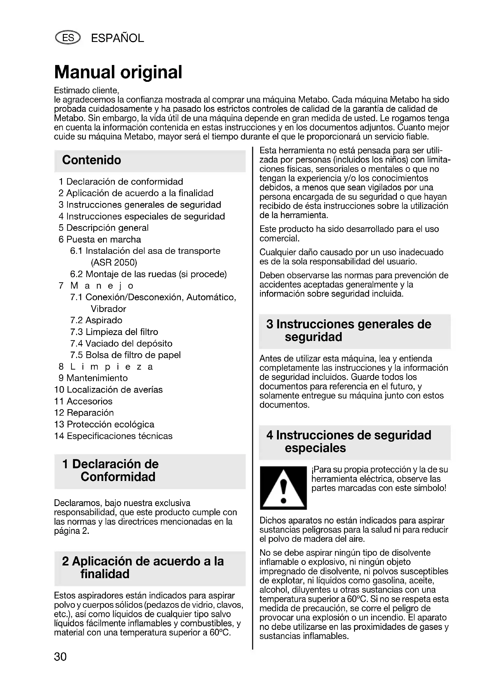 8Limpieza 9 Mantenimiento 10 Localización de averías 11 Accesorios 12 Reparación 13 Protección ecológica 14 Especificaciones técnicas Declaramos, bajo nuestra exclusiva responsabilidad, que este producto cumple con las normas y las directrices mencionadas en la página 2. Estos aspiradores están indicados para aspirar polvo y cuerpos sólidos (pedazos de vidrio, clavos, etc.), así como líquidos de cualquier tipo salvo líquidos fácilmente inflamables y combustibles, y material con una temperatura superior a 60ºC. Esta herramienta no está pensada para ser utili- zada por personas (incluidos los niños) con limita- ciones físicas, sensoriales o mentales o que no tengan la experiencia y/o los conocimientos debidos, a menos que sean vigilados por una persona encargada de su seguridad o que hayan recibido de ésta instrucciones sobre la utilización de la herramienta. Este producto ha sido desarrollado para el uso comercial. Cualquier daño causado por un uso inadecuado es de la sola responsabilidad del usuario. Deben observarse las normas para prevención de accidentes aceptadas generalmente y la información sobre seguridad incluida. Antes de utilizar esta máquina, lea y entienda completamente las instrucciones y la información de seguridad incluidos. Guarde todos los documentos para referencia en el futuro, y solamente entregue su máquina junto con estos documentos. ¡Para su propia protección y la de su herramienta eléctrica, observe las partes marcadas con este símbolo! Dichos aparatos no están indicados para aspirar sustancias peligrosas para la salud ni para reducir el polvo de madera del aire. No se debe aspirar ningún tipo de disolvente inflamable o explosivo, ni ningún objeto impregnado de disolvente, ni polvos susceptibles de explotar, ni líquidos como gasolina, aceite, alcohol, diluyentes u otras sustancias con una temperatura superior a 60ºC. Si no se respeta esta medida de precaución, se corre el peligro de provocar una explosión o un incendio. El aparato no debe utilizarse en las proximidades de gases y sustancias inflamables. Manual original Estimado cliente, le agradecemos la confianza mostrada al comprar una máquina Metabo. Cada máquina Metabo ha sido probada cuidadosamente y ha pasado los estrictos controles de calidad de la garantía de calidad de Metabo. Sin embargo, la vida útil de una máquina depende en gran medida de usted. Le rogamos tenga en cuenta la información contenida en estas instrucciones y en los documentos adjuntos. Cuanto mejor cuide su máquina Metabo, mayor será el tiempo durante el que le proporcionará un servicio fiable. Contenido 1 Declaración de Conformidad 2 Aplicación de acuerdo a la finalidad 3 Instrucciones generales de seguridad 4 Instrucciones de seguridad especiales 17026696_0810 ASR 2025 und ASR 2050.book Seite 30 Mittwoch, 18. August 2010 5:10 17ESPAÑOL