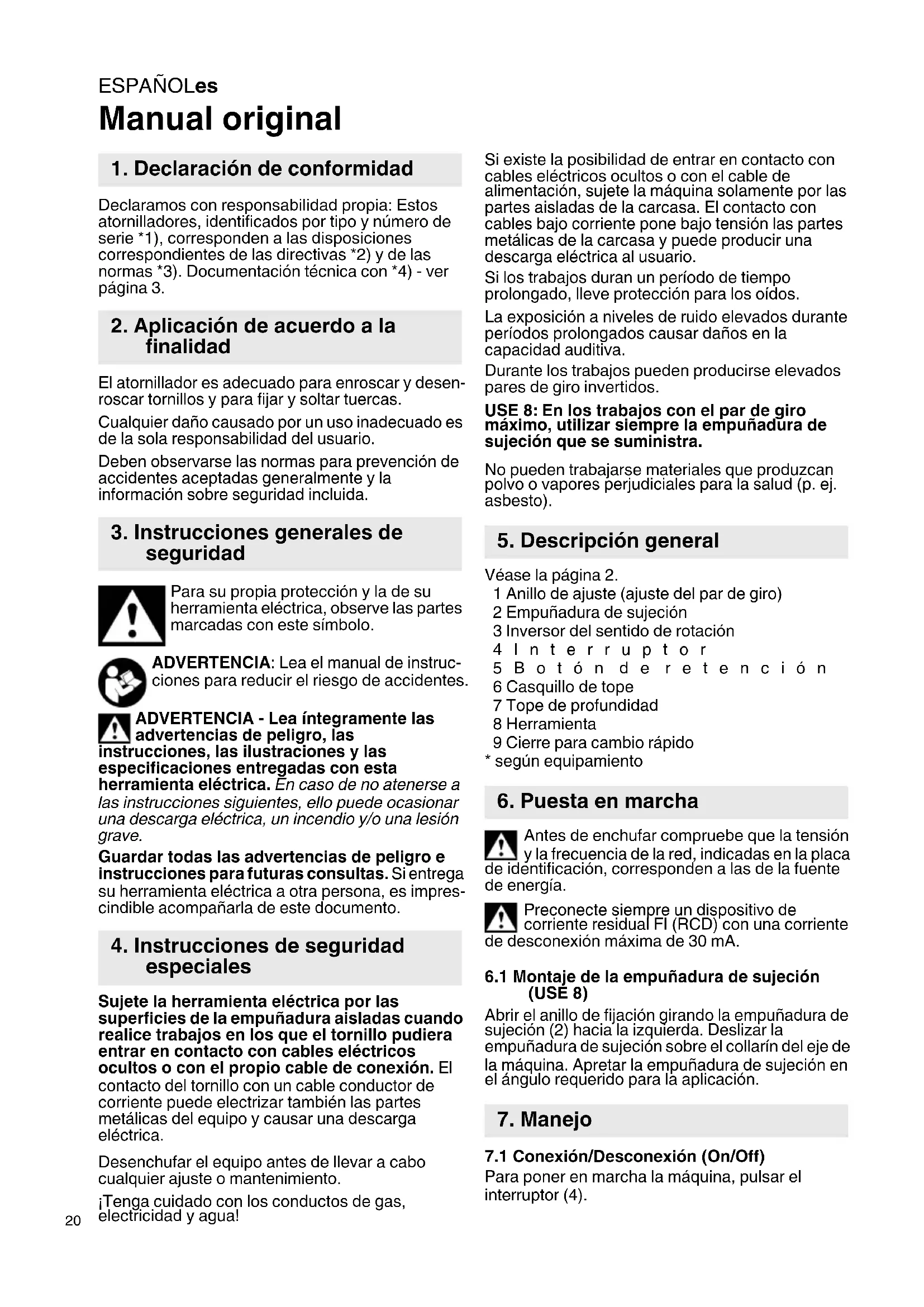 Manual original Declaramos con responsabilidad propia: Estos atornilladores, identificados por tipo y número de serie *1), corresponden a las disposiciones correspondientes de las directivas *2) y de las normas *3). Documentación técnica con *4) - ver página 3. El atornillador es adecuado para enroscar y desen- roscar tornillos y para fijar y soltar tuercas. Cualquier daño causado por un uso inadecuado es de la sola responsabilidad del usuario. Deben observarse las normas para prevención de accidentes aceptadas generalmente y la información sobre seguridad incluida. Para su propia protección y la de su herramienta eléctrica, observe las partes marcadas con este símbolo. ADVERTENCIA: Lea el manual de instruc- ciones para reducir el riesgo de accidentes. ADVERTENCIA - Lea íntegramente las advertencias de peligro, las instrucciones, las ilustraciones y las especificaciones entregadas con esta herramienta eléctrica. En caso de no atenerse a las instrucciones siguientes, ello puede ocasionar una descarga eléctrica, un incendio y/o una lesión grave. Guardar todas las advertencias de peligro e instrucciones para futuras consultas. Si entrega su herramienta eléctrica a otra persona, es impres- cindible acompañarla de este documento. Sujete la herramienta eléctrica por las superficies de la empuñadura aisladas cuando realice trabajos en los que el tornillo pudiera entrar en contacto con cables eléctricos ocultos o con el propio cable de conexión. El contacto del tornillo con un cable conductor de corriente puede electrizar también las partes metálicas del equipo y causar una descarga eléctrica. Desenchufar el equipo antes de llevar a cabo cualquier ajuste o mantenimiento. ¡Tenga cuidado con los conductos de gas, electricidad y agua! Si existe la posibilidad de entrar en contacto con cables eléctricos ocultos o con el cable de alimentación, sujete la máquina solamente por las partes aisladas de la carcasa. El contacto con cables bajo corriente pone bajo tensión las partes metálicas de la carcasa y puede producir una descarga eléctrica al usuario. Si los trabajos duran un período de tiempo prolongado, lleve protección para los oídos. La exposición a niveles de ruido elevados durante períodos prolongados causar daños en la capacidad auditiva. Durante los trabajos pueden producirse elevados pares de giro invertidos. USE 8: En los trabajos con el par de giro máximo, utilizar siempre la empuñadura de sujeción que se suministra. No pueden trabajarse materiales que produzcan polvo o vapores perjudiciales para la salud (p. ej. asbesto). Véase la página 2. 1 Anillo de ajuste (ajuste del par de giro) 2 Empuñadura de sujeción 3 Inversor del sentido de rotación 4Interruptor 5Botón de retención 6 Casquillo de tope 7 Tope de profundidad 8 Herramienta 9 Cierre para cambio rápido