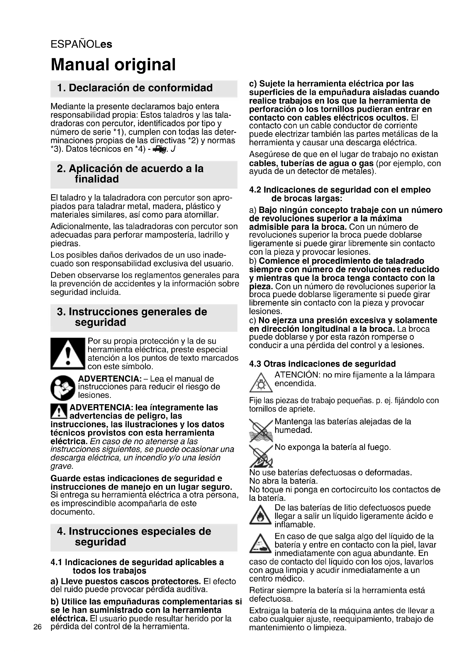 Mediante la presente declaramos bajo entera responsabilidad propia: Estos taladros y las tala- dradoras con percutor, identificados por tipo y número de serie *1), cumplen con todas las deter- minaciones propias de las directivas *2) y normas *3). Datos técnicos en *4) - Fig. J El taladro y la taladradora con percutor son apro- piados para taladrar metal, madera, plástico y materiales similares, así como para atornillar. Adicionalmente, las taladradoras con percutor son adecuadas para perforar mampostería, ladrillo y piedras. Los posibles daños derivados de un uso inade- cuado son responsabilidad exclusiva del usuario. Deben observarse los reglamentos generales para la prevención de accidentes y la información sobre seguridad incluida. Por su propia protección y la de su herramienta eléctrica, preste especial atención a los puntos de texto marcados con este símbolo. ADVERTENCIA: – Lea el manual de instrucciones para reducir el riesgo de lesiones. ADVERTENCIA: lea íntegramente las advertencias de peligro, las instrucciones, las ilustraciones y los datos técnicos provistos con esta herramienta eléctrica. En caso de no atenerse a las instrucciones siguientes, se puede ocasionar una descarga eléctrica, un incendio y/o una lesión grave. Guarde estas indicaciones de seguridad e instrucciones de manejo en un lugar seguro. Si entrega su herramienta eléctrica a otra persona, es imprescindible acompañarla de este documento.