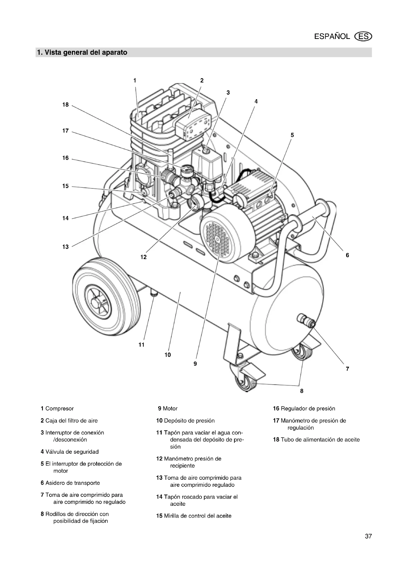 1 Compresor 2 Caja del filtro de aire 3 Interruptor de conexión /desconexión 4 Válvula de seguridad 5 El interruptor de protección de motor 6 Asidero de transporte 7 Toma de aire comprimido para aire comprimido no regulado 8 Rodillos de dirección con posibilidad de fijación 9 Motor 10 Depósito de presión 11 Tapón para vaciar el agua con- densada del depósito de pre- sión 12 Manómetro presión de recipiente 13 Toma de aire comprimido para aire comprimido regulado 14 Tapón roscado para vaciar el aceite 15 Mirilla de control del aceite 16 Regulador de presión 17 Manómetro de presión de regulación 18 Tubo de alimentación de aceite XK0022S.fm Manual de uso ESPAÑOL38 ESPAÑOL