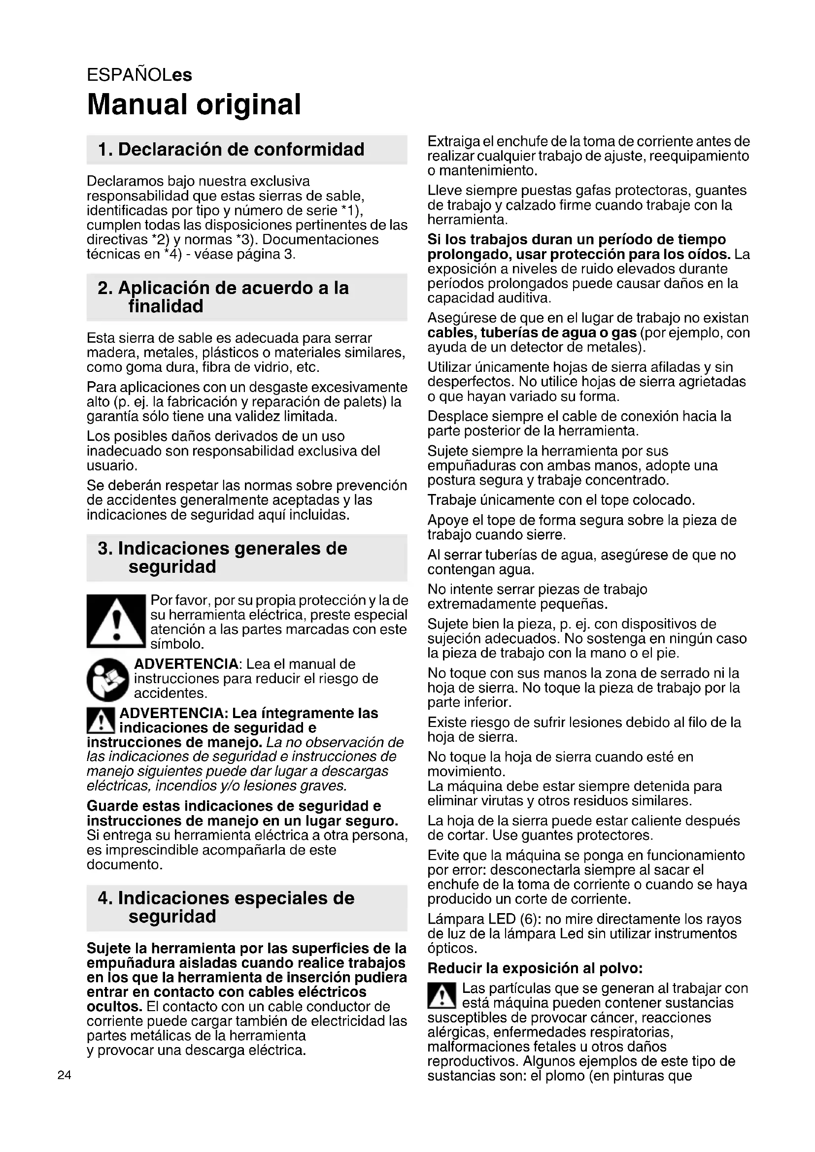 Manual original Declaramos bajo nuestra exclusiva responsabilidad que estas sierras de sable, identificadas por tipo y número de serie *1), cumplen todas las disposiciones pertinentes de las directivas *2) y normas *3). Documentaciones técnicas en *4) - véase página 3. Esta sierra de sable es adecuada para serrar madera, metales, plásticos o materiales similares, como goma dura, fibra de vidrio, etc. Para aplicaciones con un desgaste excesivamente alto (p. ej. la fabricación y reparación de palets) la garantía sólo tiene una validez limitada. Los posibles daños derivados de un uso inadecuado son responsabilidad exclusiva del usuario. Se deberán respetar las normas sobre prevención de accidentes generalmente aceptadas y las indicaciones de seguridad aquí incluidas. Por favor, por su propia protección y la de su herramienta eléctrica, preste especial atención a las partes marcadas con este símbolo. ADVERTENCIA: Lea el manual de instrucciones para reducir el riesgo de accidentes. ADVERTENCIA: Lea íntegramente las indicaciones de seguridad e instrucciones de manejo. La no observación de las indicaciones de seguridad e instrucciones de manejo siguientes puede dar lugar a descargas eléctricas, incendios y/o lesiones graves. Guarde estas indicaciones de seguridad e instrucciones de manejo en un lugar seguro. Si entrega su herramienta eléctrica a otra persona, es imprescindible acompañarla de este documento. Sujete la herramienta por las superficies de la empuñadura aisladas cuando realice trabajos en los que la herramienta de inserción pudiera entrar en contacto con cables eléctricos ocultos. El contacto con un cable conductor de corriente puede cargar también de electricidad las partes metálicas de la herramienta y provocar una descarga eléctrica. Extraiga el enchufe de la toma de corriente antes de realizar cualquier trabajo de ajuste, reequipamiento o mantenimiento. Lleve siempre puestas gafas protectoras, guantes de trabajo y calzado firme cuando trabaje con la herramienta. Si los trabajos duran un período de tiempo prolongado, usar protección para los oídos. La exposición a niveles de ruido elevados durante períodos prolongados puede causar daños en la capacidad auditiva. Asegúrese de que en el lugar de trabajo no existan cables, tuberías de agua o gas (por ejemplo, con ayuda de un detector de metales). Utilizar únicamente hojas de sierra afiladas y sin desperfectos. No utilice hojas de sierra agrietadas o que hayan variado su forma. Desplace siempre el cable de conexión hacia la parte posterior de la herramienta. Sujete siempre la herramienta por sus empuñaduras con ambas manos, adopte una postura segura y trabaje concentrado. Trabaje únicamente con el tope colocado. Apoye el tope de forma segura sobre la pieza de trabajo cuando sierre. Al serrar tuberías de agua, asegúrese de que no contengan agua. No intente serrar piezas de trabajo extremadamente pequeñas. Sujete bien la pieza, p. ej. con dispositivos de sujeción adecuados. No sostenga en ningún caso la pieza de trabajo con la mano o el pie. No toque con sus manos la zona de serrado ni la hoja de sierra. No toque la pieza de trabajo por la parte inferior. Existe riesgo de sufrir lesiones debido al filo de la hoja de sierra. No toque la hoja de sierra cuando esté en movimiento. La máquina debe estar siempre detenida para eliminar virutas y otros residuos similares. La hoja de la sierra puede estar caliente después de cortar. Use guantes protectores. Evite que la máquina se ponga en funcionamiento por error: desconectarla siempre al sacar el enchufe de la toma de corriente o cuando se haya producido un corte de corriente. Lámpara LED (6): no mire directamente los rayos de luz de la lámpara Led sin utilizar instrumentos ópticos. Reducir la exposición al polvo: Las partículas que se generan al trabajar con está máquina pueden contener sustancias susceptibles de provocar cáncer, reacciones alérgicas, enfermedades respiratorias, malformaciones fetales u otros daños reproductivos. Algunos ejemplos de este tipo de sustancias son: el plomo (en pinturas que