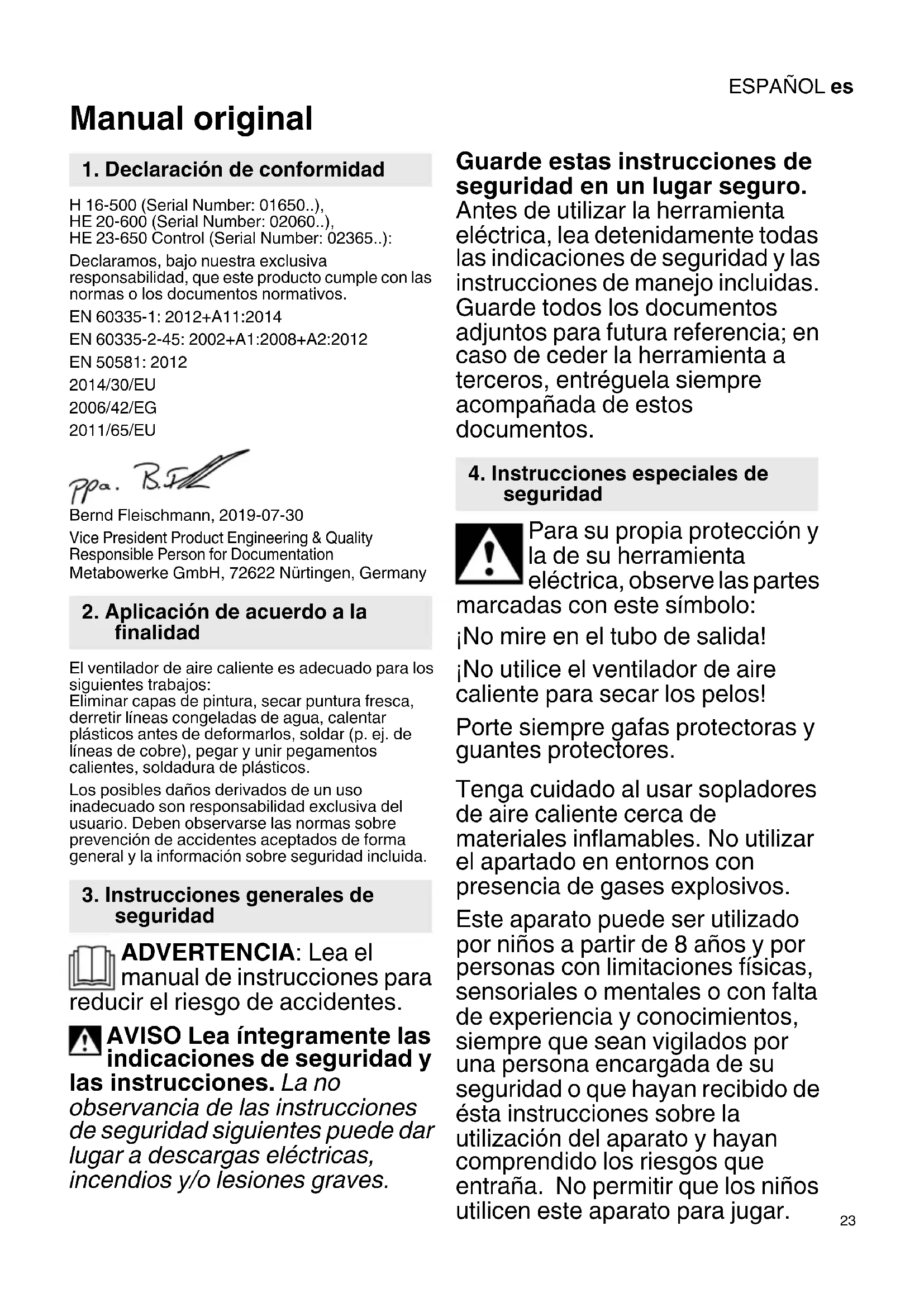 Manual original H 16-500 (Serial Number: 01650..), HE 20-600 (Serial Number: 02060..), HE 23-650 Control (Serial Number: 02365..): Declaramos, bajo nuestra exclusiva responsabilidad, que este producto cumple con las normas o los documentos normativos. EN 60335-1: 2012+A11:2014 EN 60335-2-45: 2002+A1:2008+A2:2012 EN 50581: 2012 2014/30/EU 2006/42/EG 2011/65/EU Bernd Fleischmann, 2019-07-30 Vice President Product Engineering & Quality Responsible Person for Documentation Metabowerke GmbH, 72622 Nürtingen, Germany El ventilador de aire caliente es adecuado para los siguientes trabajos: Eliminar capas de pintura, secar puntura fresca, derretir líneas congeladas de agua, calentar plásticos antes de deformarlos, soldar (p. ej. de líneas de cobre), pegar y unir pegamentos calientes, soldadura de plásticos. Los posibles daños derivados de un uso inadecuado son responsabilidad exclusiva del usuario. Deben observarse las normas sobre prevención de accidentes aceptados de forma general y la información sobre seguridad incluida. ADVERTENCIA: Lea el manual de instrucciones para reducir el riesgo de accidentes. AVISO Lea íntegramente las indicaciones de seguridad y las instrucciones. La no observancia de las instrucciones de seguridad siguientes puede dar lugar a descargas eléctricas, incendios y/o lesiones graves. Guarde estas instrucciones de seguridad en un lugar seguro. Antes de utilizar la herramienta eléctrica, lea detenidamente todas las indicaciones de seguridad y las instrucciones de manejo incluidas. Guarde todos los documentos adjuntos para futura referencia; en caso de ceder la herramienta a terceros, entréguela siempre acompañada de estos documentos. Para su propia protección y la de su herramienta eléctrica, observe las partes marcadas con este símbolo: ¡No mire en el tubo de salida! ¡No utilice el ventilador de aire caliente para secar los pelos! Porte siempre gafas protectoras y guantes protectores. Tenga cuidado al usar sopladores de aire caliente cerca de materiales inflamables. No utilizar el apartado en entornos con presencia de gases explosivos. Este aparato puede ser utilizado por niños a partir de 8 años y por personas con limitaciones físicas, sensoriales o mentales o con falta de experiencia y conocimientos, siempre que sean vigilados por una persona encargada de su seguridad o que hayan recibido de ésta instrucciones sobre la utilización del aparato y hayan comprendido los riesgos que entraña. No permitir que los niños utilicen este aparato para jugar.