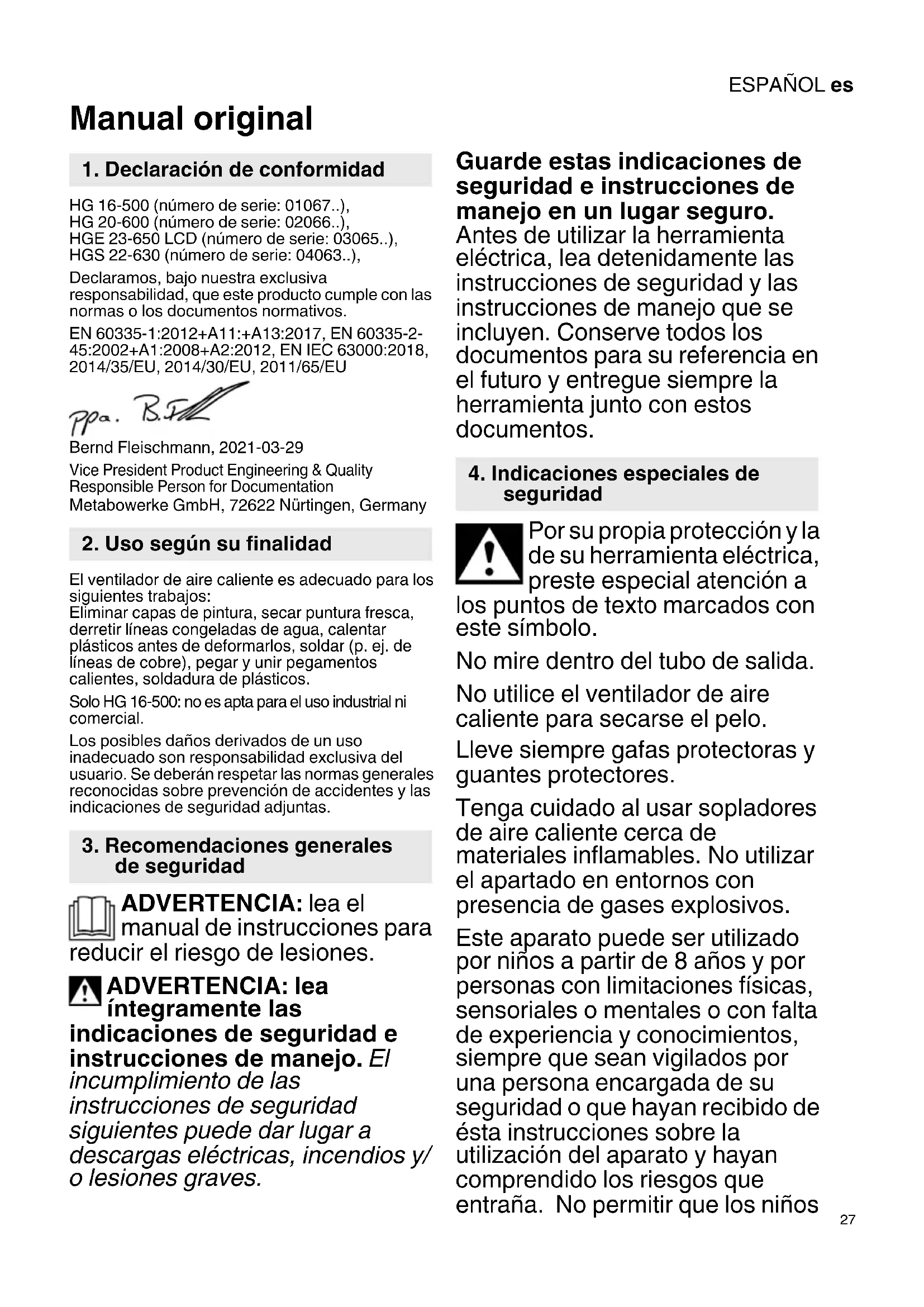 Manual original HG 16-500 (número de serie: 01067..), HG 20-600 (número de serie: 02066..), HGE 23-650 LCD (número de serie: 03065..), HGS 22-630 (número de serie: 04063..), Declaramos, bajo nuestra exclusiva responsabilidad, que este producto cumple con las normas o los documentos normativos. EN 60335-1:2012+A11:+A13:2017, EN 60335-2- 45:2002+A1:2008+A2:2012, EN IEC 63000:2018, 2014/35/EU, 2014/30/EU, 2011/65/EU Bernd Fleischmann, 2021-03-29 Vice President Product Engineering & Quality Responsible Person for Documentation Metabowerke GmbH, 72622 Nürtingen, Germany El ventilador de aire caliente es adecuado para los siguientes trabajos: Eliminar capas de pintura, secar puntura fresca, derretir líneas congeladas de agua, calentar plásticos antes de deformarlos, soldar (p. ej. de líneas de cobre), pegar y unir pegamentos calientes, soldadura de plásticos. Solo HG 16-500: no es apta para el uso industrial ni comercial. Los posibles daños derivados de un uso inadecuado son responsabilidad exclusiva del usuario. Se deberán respetar las normas generales reconocidas sobre prevención de accidentes y las indicaciones de seguridad adjuntas. ADVERTENCIA: lea el manual de instrucciones para reducir el riesgo de lesiones. ADVERTENCIA: lea íntegramente las indicaciones de seguridad e instrucciones de manejo. El incumplimiento de las instrucciones de seguridad siguientes puede dar lugar a descargas eléctricas, incendios y/ o lesiones graves. Guarde estas indicaciones de seguridad e instrucciones de manejo en un lugar seguro. Antes de utilizar la herramienta eléctrica, lea detenidamente las instrucciones de seguridad y las instrucciones de manejo que se incluyen. Conserve todos los documentos para su referencia en el futuro y entregue siempre la herramienta junto con estos documentos. Por su propia protección y la de su herramienta eléctrica, preste especial atención a los puntos de texto marcados con este símbolo. No mire dentro del tubo de salida. No utilice el ventilador de aire caliente para secarse el pelo. Lleve siempre gafas protectoras y guantes protectores. Tenga cuidado al usar sopladores de aire caliente cerca de materiales inflamables. No utilizar el apartado en entornos con presencia de gases explosivos. Este aparato puede ser utilizado por niños a partir de 8 años y por personas con limitaciones físicas, sensoriales o mentales o con falta de experiencia y conocimientos, siempre que sean vigilados por una persona encargada de su seguridad o que hayan recibido de ésta instrucciones sobre la utilización del aparato y hayan comprendido los riesgos que entraña. No permitir que los niños