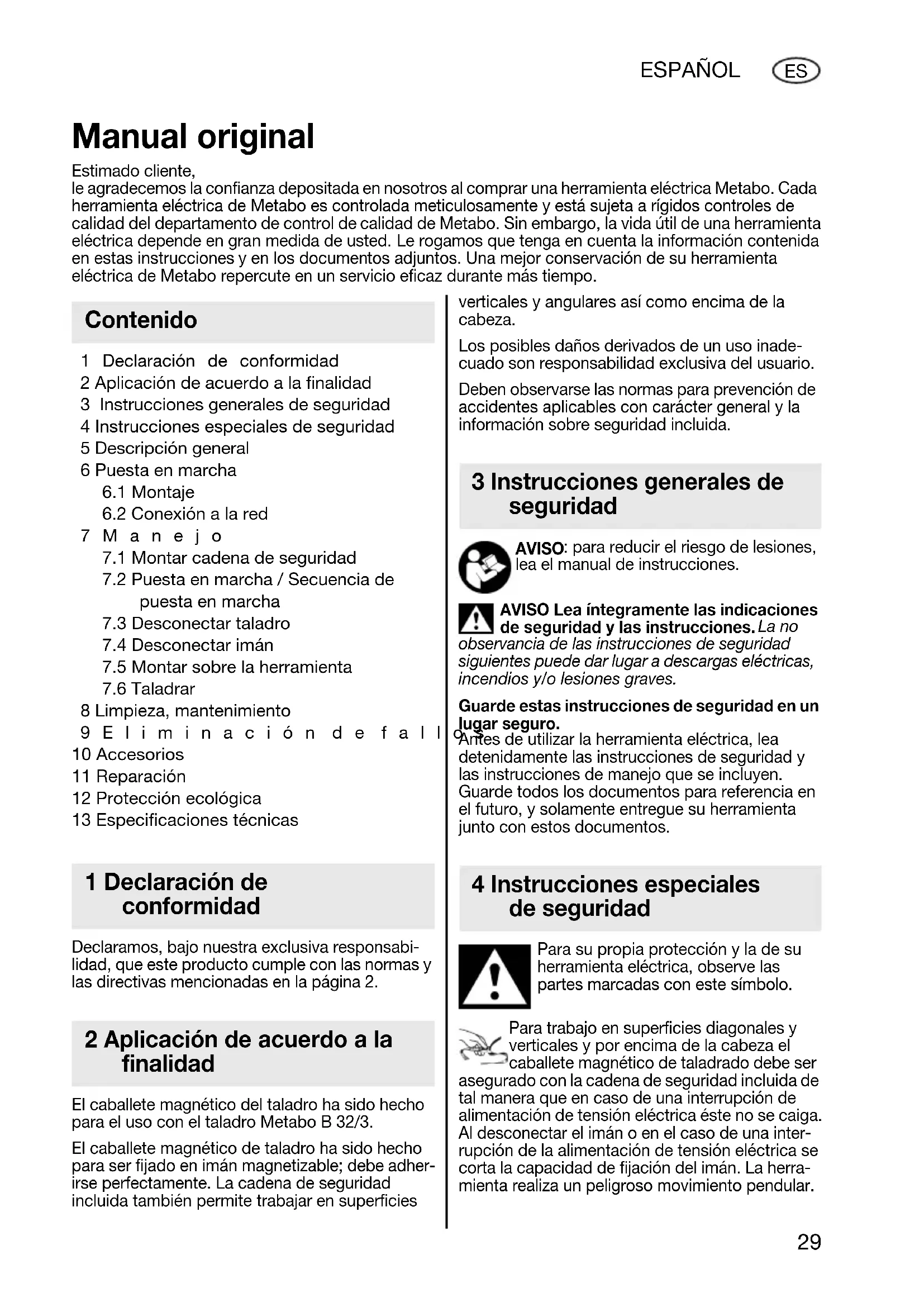 8 Limpieza, mantenimiento 9Eliminación de fallos 10 Accesorios 11 Reparación 12 Protección ecológica 13 Especificaciones técnicas Declaramos, bajo nuestra exclusiva responsabi- lidad, que este producto cumple con las normas y las directivas mencionadas en la página 2. El caballete magnético del taladro ha sido hecho para el uso con el taladro Metabo B 32/3. El caballete magnético de taladro ha sido hecho para ser fijado en imán magnetizable; debe adher- irse perfectamente. La cadena de seguridad incluida también permite trabajar en superficies verticales y angulares así como encima de la cabeza. Los posibles daños derivados de un uso inade- cuado son responsabilidad exclusiva del usuario. Deben observarse las normas para prevención de accidentes aplicables con carácter general y la información sobre seguridad incluida. AVISO : para reducir el riesgo de lesiones, lea el manual de instrucciones. AVISO Lea íntegramente las indicaciones de seguridad y las instrucciones. La no observancia de las instrucciones de seguridad siguientes puede dar lugar a descargas eléctricas, incendios y/o lesiones graves. Guarde estas instrucciones de seguridad en un lugar seguro. Antes de utilizar la herramienta eléctrica, lea detenidamente las instrucciones de seguridad y las instrucciones de manejo que se incluyen. Guarde todos los documentos para referencia en el futuro, y solamente entregue su herramienta junto con estos documentos. Para su propia protección y la de su herramienta eléctrica, observe las partes marcadas con este símbolo. Para trabajo en superficies diagonales y verticales y por encima de la cabeza el caballete magnético de taladrado debe ser asegurado con la cadena de seguridad incluida de tal manera que en caso de una interrupción de alimentación de tensión eléctrica éste no se caiga. Al desconectar el imán o en el caso de una inter- rupción de la alimentación de tensión eléctrica se corta la capacidad de fijación del imán. La herra- mienta realiza un peligroso movimiento pendular. Manual original Estimado cliente, le agradecemos la confianza depositada en nosotros al comprar una herramienta eléctrica Metabo. Cada herramienta eléctrica de Metabo es controlada meticulosamente y está sujeta a rígidos controles de calidad del departamento de control de calidad de Metabo. Sin embargo, la vida útil de una herramienta eléctrica depende en gran medida de usted. Le rogamos que tenga en cuenta la información contenida en estas instrucciones y en los documentos adjuntos. Una mejor conservación de su herramienta eléctrica de Metabo repercute en un servicio eficaz durante más tiempo. Contenido 1 Declaración de conformidad 2 Aplicación de acuerdo a la finalidad 3 Instrucciones generales de seguridad 4 Instrucciones especiales de seguridad 17026927_0411 M 100.book Seite 29 Dienstag, 26. April 2011 10:28 1030 ESPAÑOL
