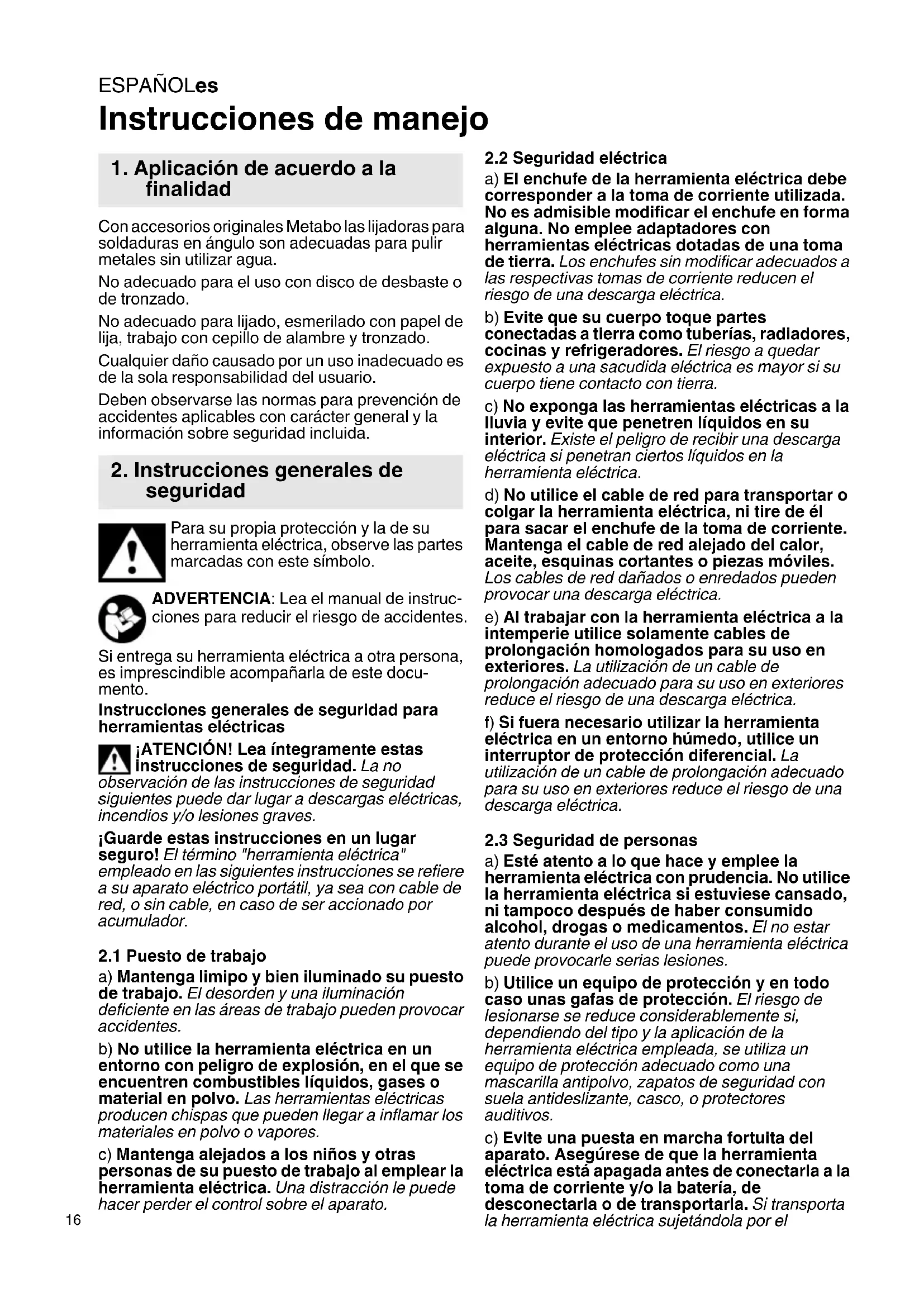 Instrucciones de manejo Con accesorios originales Metabo las lijadoras para soldaduras en ángulo son adecuadas para pulir metales sin utilizar agua. No adecuado para el uso con disco de desbaste o de tronzado. No adecuado para lijado, esmerilado con papel de lija, trabajo con cepillo de alambre y tronzado. Cualquier daño causado por un uso inadecuado es de la sola responsabilidad del usuario. Deben observarse las normas para prevención de accidentes aplicables con carácter general y la información sobre seguridad incluida. Para su propia protección y la de su herramienta eléctrica, observe las partes marcadas con este símbolo. ADVERTENCIA: Lea el manual de instruc- ciones para reducir el riesgo de accidentes. Si entrega su herramienta eléctrica a otra persona, es imprescindible acompañarla de este docu- mento. Instrucciones generales de seguridad para herramientas eléctricas ¡ATENCIÓN! Lea íntegramente estas instrucciones de seguridad. La no observación de las instrucciones de seguridad siguientes puede dar lugar a descargas eléctricas, incendios y/o lesiones graves. ¡Guarde estas instrucciones en un lugar seguro! El término "herramienta eléctrica" empleado en las siguientes instrucciones se refiere a su aparato eléctrico portátil, ya sea con cable de red, o sin cable, en caso de ser accionado por acumulador.