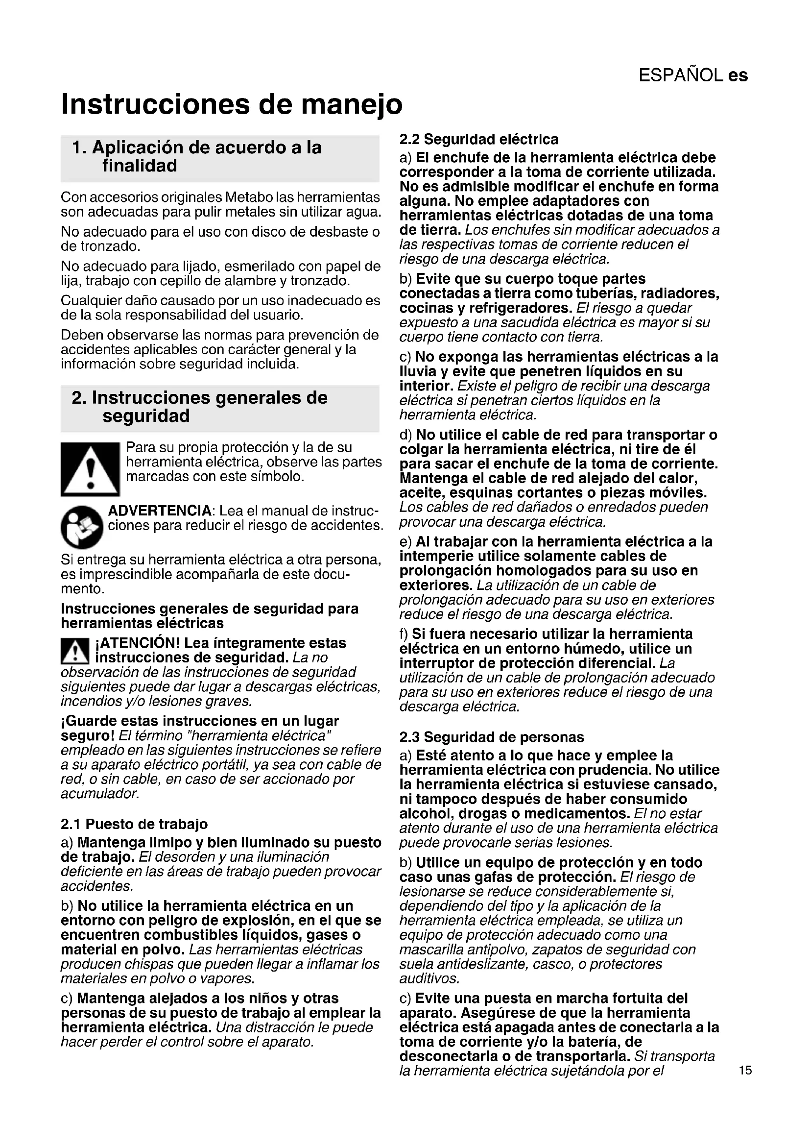 Instrucciones de manejo Con accesorios originales Metabo las herramientas son adecuadas para pulir metales sin utilizar agua. No adecuado para el uso con disco de desbaste o de tronzado. No adecuado para lijado, esmerilado con papel de lija, trabajo con cepillo de alambre y tronzado. Cualquier daño causado por un uso inadecuado es de la sola responsabilidad del usuario. Deben observarse las normas para prevención de accidentes aplicables con carácter general y la información sobre seguridad incluida. Para su propia protección y la de su herramienta eléctrica, observe las partes marcadas con este símbolo. ADVERTENCIA: Lea el manual de instruc- ciones para reducir el riesgo de accidentes. Si entrega su herramienta eléctrica a otra persona, es imprescindible acompañarla de este docu- mento. Instrucciones generales de seguridad para herramientas eléctricas ¡ATENCIÓN! Lea íntegramente estas instrucciones de seguridad. La no observación de las instrucciones de seguridad siguientes puede dar lugar a descargas eléctricas, incendios y/o lesiones graves. ¡Guarde estas instrucciones en un lugar seguro! El término "herramienta eléctrica" empleado en las siguientes instrucciones se refiere a su aparato eléctrico portátil, ya sea con cable de red, o sin cable, en caso de ser accionado por acumulador.