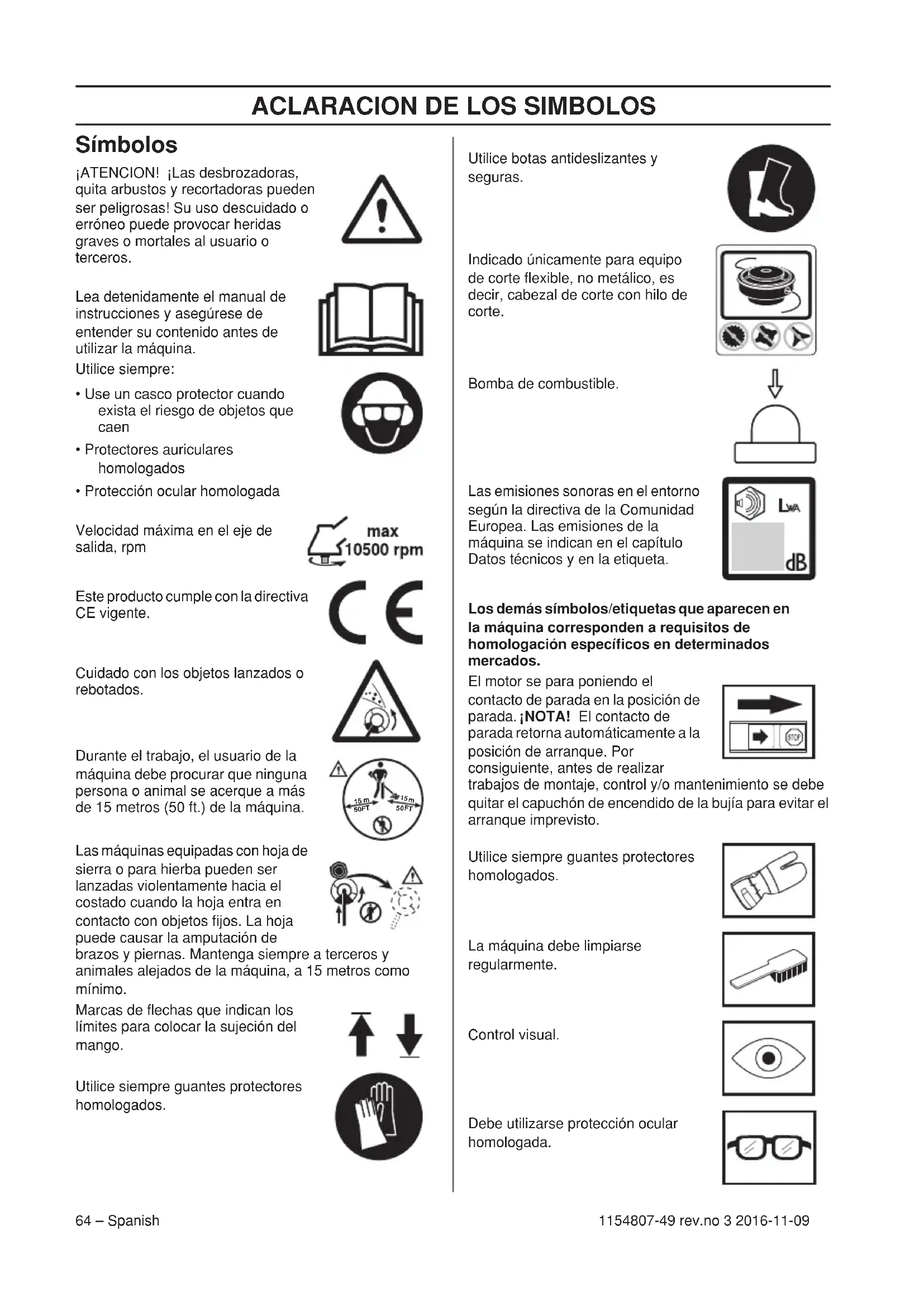 - Protección ocular homologada Velocidad máxima en el eje de salida, rpm Este producto cumple con la directiva CE vigente. Cuidado con los objetos lanzados o rebotados. Durante el trabajo, el usuario de la máquina debe procurar que ninguna persona o animal se acerque a más de 15 metros (50 ft.) de la máquina. Las máquinas equipadas con hoja de sierra o para hierba pueden ser lanzadas violentamente hacia el costado cuando la hoja entra en contacto con objetos fijos. La hoja puede causar la amputación de brazos y piernas. Mantenga siempre a terceros y animales alejados de la máquina, a 15 metros como mínimo. Marcas de flechas que indican los límites para colocar la sujeción del mango. Utilice siempre guantes protectores homologados. Utilice botas antideslizantes y seguras. Indicado únicamente para equipo de corte flexible, no metálico, es decir, cabezal de corte con hilo de corte. Bomba de combustible. Las emisiones sonoras en el entorno según la directiva de la Comunidad Europea. Las emisiones de la máquina se indican en el capítulo Datos técnicos y en la etiqueta. Los demás símbolos/etiquetas que aparecen en la máquina corresponden a requisitos de homologación específicos en determinados mercados. El motor se para poniendo el contacto de parada en la posición de parada. ¡NOTA! El contacto de parada retorna automáticamente a la posición de arranque. Por consiguiente, antes de realizar trabajos de montaje, control y/o mantenimiento se debe quitar el capuchón de encendido de la bujía para evitar el arranque imprevisto. Utilice siempre guantes protectores homologados. La máquina debe limpiarse regularmente. Control visual. Debe utilizarse protección ocular homologada.