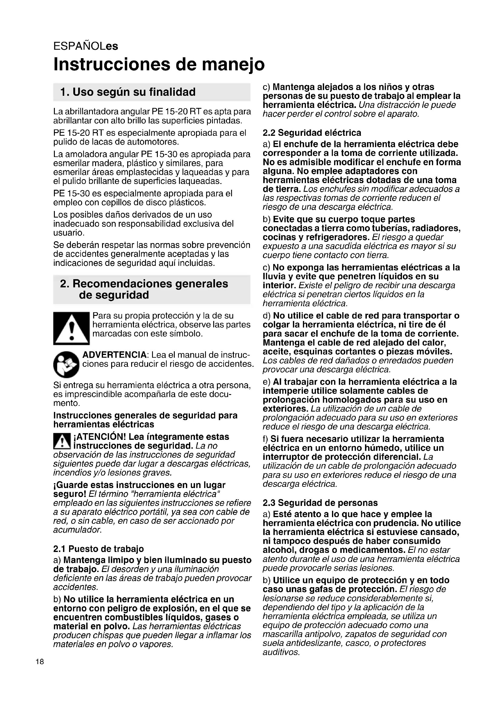 Instrucciones de manejo La abrillantadora angular PE 15-20 RT es apta para abrillantar con alto brillo las superficies pintadas. PE 15-20 RT es especialmente apropiada para el pulido de lacas de automotores. La amoladora angular PE 15-30 es apropiada para esmerilar madera, plástico y similares, para esmerilar áreas emplastecidas y laqueadas y para el pulido brillante de superficies laqueadas. PE 15-30 es especialmente apropiada para el empleo con cepillos de disco plásticos. Los posibles daños derivados de un uso inadecuado son responsabilidad exclusiva del usuario. Se deberán respetar las normas sobre prevención de accidentes generalmente aceptadas y las indicaciones de seguridad aquí incluidas. Para su propia protección y la de su herramienta eléctrica, observe las partes marcadas con este símbolo. ADVERTENCIA: Lea el manual de instruc- ciones para reducir el riesgo de accidentes. Si entrega su herramienta eléctrica a otra persona, es imprescindible acompañarla de este docu- mento. Instrucciones generales de seguridad para herramientas eléctricas ¡ATENCIÓN! Lea íntegramente estas instrucciones de seguridad. La no observación de las instrucciones de seguridad siguientes puede dar lugar a descargas eléctricas, incendios y/o lesiones graves. ¡Guarde estas instrucciones en un lugar seguro! El término "herramienta eléctrica" empleado en las siguientes instrucciones se refiere a su aparato eléctrico portátil, ya sea con cable de red, o sin cable, en caso de ser accionado por acumulador.