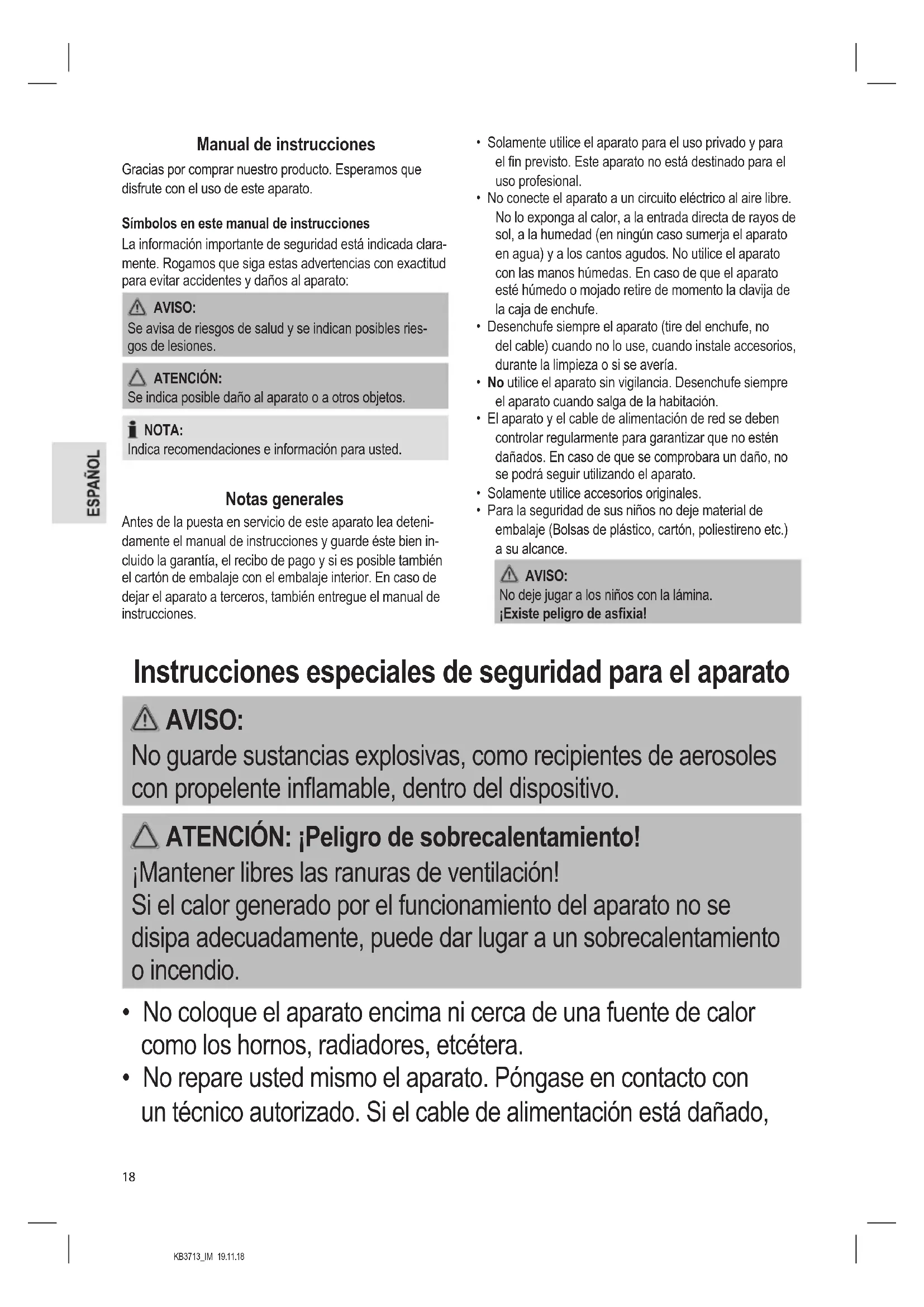 - No repare usted mismo el aparato. Póngase en contacto con un técnico autorizado. Si el cable de alimentación está dañado,KB3713_IM 19.11.18