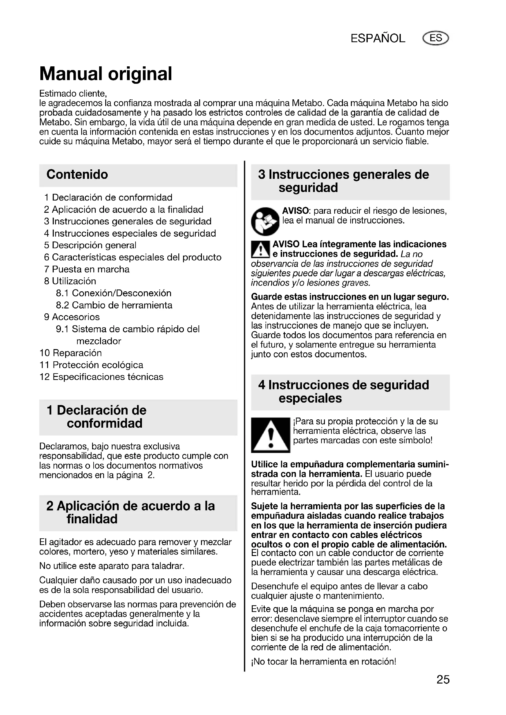 mezclador 10 Reparación 11 Protección ecológica 12 Especificaciones técnicas Declaramos, bajo nuestra exclusiva responsabilidad, que este producto cumple con las normas o los documentos normativos mencionados en la página 2. El agitador es adecuado para remover y mezclar colores, mortero, yeso y materiales similares. No utilice este aparato para taladrar. Cualquier daño causado por un uso inadecuado es de la sola responsabilidad del usuario. Deben observarse las normas para prevención de accidentes aceptadas generalmente y la información sobre seguridad incluida. AVISO : para reducir el riesgo de lesiones, lea el manual de instrucciones. AVISO Lea íntegramente las indicaciones e instrucciones de seguridad. La no observancia de las instrucciones de seguridad siguientes puede dar lugar a descargas eléctricas, incendios y/o lesiones graves. Guarde estas instrucciones en un lugar seguro. Antes de utilizar la herramienta eléctrica, lea detenidamente las instrucciones de seguridad y las instrucciones de manejo que se incluyen. Guarde todos los documentos para referencia en el futuro, y solamente entregue su herramienta junto con estos documentos. ¡Para su propia protección y la de su herramienta eléctrica, observe las partes marcadas con este símbolo! Utilice la empuñadura complementaria sumini- strada con la herramienta. El usuario puede resultar herido por la pérdida del control de la herramienta. Sujete la herramienta por las superficies de la empuñadura aisladas cuando realice trabajos en los que la herramienta de inserción pudiera entrar en contacto con cables eléctricos ocultos o con el propio cable de alimentación. El contacto con un cable conductor de corriente puede electrizar también las partes metálicas de la herramienta y causar una descarga eléctrica. Desenchufe el equipo antes de llevar a cabo cualquier ajuste o mantenimiento. Evite que la máquina se ponga en marcha por error: desenclave siempre el interruptor cuando se desenchufe el enchufe de la caja tomacorriente o bien si se ha producido una interrupción de la corriente de la red de alimentación. ¡No tocar la herramienta en rotación! Manual original Estimado cliente, le agradecemos la confianza mostrada al comprar una máquina Metabo. Cada máquina Metabo ha sido probada cuidadosamente y ha pasado los estrictos controles de calidad de la garantía de calidad de Metabo. Sin embargo, la vida útil de una máquina depende en gran medida de usted. Le rogamos tenga en cuenta la información contenida en estas instrucciones y en los documentos adjuntos. Cuanto mejor cuide su máquina Metabo, mayor será el tiempo durante el que le proporcionará un servicio fiable. Contenido 1 Declaración de conformidad 2 Aplicación de acuerdo a la finalidad 3 Instrucciones generales de seguridad 4 Instrucciones de seguridad especiales 17026753_0513 RWE 1100.book Seite 25 Dienstag, 7. Mai 2013 10:49 1026 ESPAÑOL