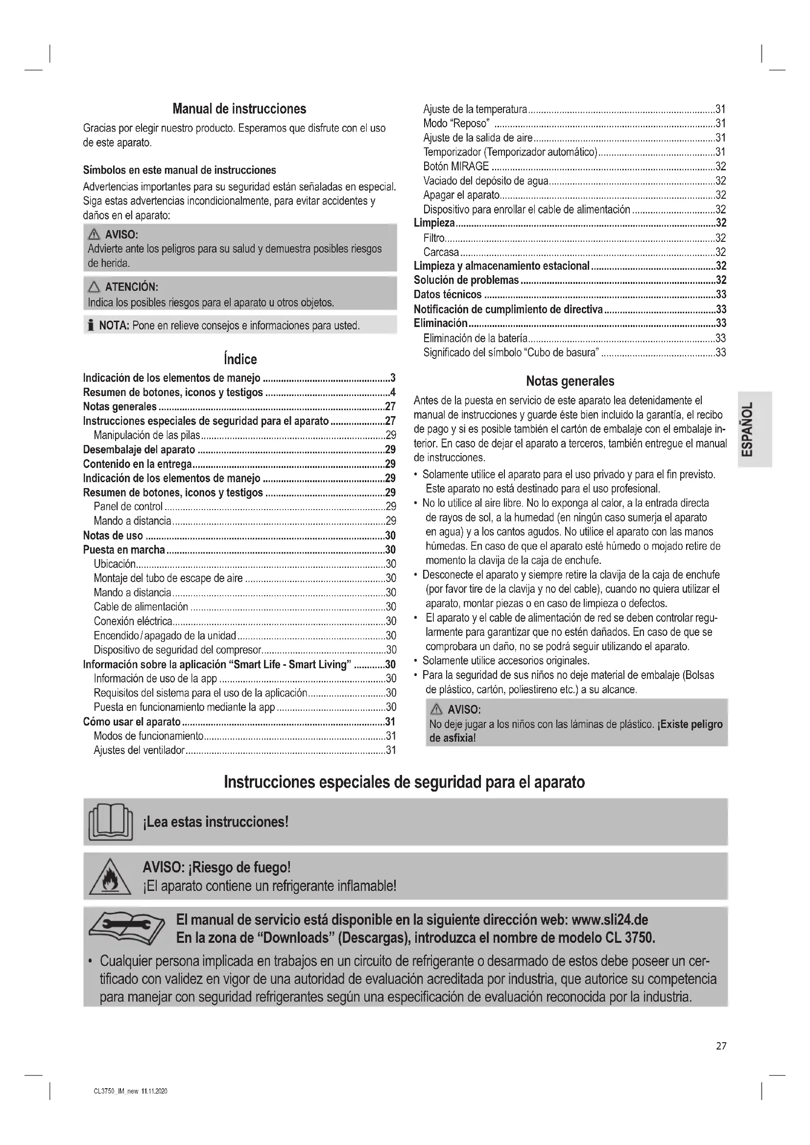 Contenido en la entrega 1 Unidad de aire acondicionado 1 Mando a distancia 2 Pilas 1 Tubo exible de escape de aire 1 Adaptador del tubo de escape de aire (Conexión del aparato) 1 Kit de ventana de 2 piezas 1 Adaptador para el kit de ventana 1 Manguera de agua 2 Tapones (de repuesto) Indicación de los elementos de manejo 1 Salida de aire (aleta pivotante) 2 Panel de control con pantalla 3 Carcasa 4 Salida de agua 5 Asa 6 Dispositivo para enrollar el cable de alimentación 7 Salida de agua 8 Cable de alimentación 9 Soporte de enchufe 10 Adaptador del tubo de escape de aire 11 Tubo exible de escape de aire 12 Adaptador para el kit de ventana 13 Conector del tubo de escape de aire 14 Elemento de ltro 15 Rejilla en la admisión de aire 16 Pantalla en la parte anterior 17 Mando a distancia 18 Kit de ventana de 2 piezas Resumen de botones, iconos y testigos Panel de control 1 Testigo FAN (ventilador) 2 Testigo COOL (refrigeración) 3 Testigo DRY (deshumidicación) 4 Pantalla 5 Testigo MEDIUM (velocidad de ventilador media) 6 Testigo LOW (baja velocidad de ventilador) 7 Testigo HIGH (alta velocidad de ventilador) 8 Testigo POWER 9 Testigo Wi-Fi (conexión WiFi habilitada) 10 Testigo BUCKET FULL (depósito de agua lleno) 11 Testigo POWER (encender / apagar el aparato) 12 Testigo SWING (aleta pivotante oscilante) 13 Botón (ajuste de salida de aire) 14 Botón FAN SPEED (establecer velocidad de ventilador y activar WiFi) 15 Botones y (ajuste de temperatura u hora) 16 Testigo SLEEP (modo reposo) 17 Botón SLEEP (establecer “modo reposo”) 18 Botón MODE (establecer modo de funcionamiento) 19 Botón MIRAGE (encender o apagar la pantalla en la parte anterior del aparato) 20 Testigo MIRAGE (pantalla en la parte anterior del aparato) 21 Botón (establecer temporizador) 22 Testigo TIMER (funcionamiento de temporizador activado) Mando a distancia 1 Icono (conexión WiFi habilitada) 2 Indicador Fan (ventilador) 3 Icono de batería 4 Icono Dry (deshumidicación) 5 Icono °C (unidad de temperatura seleccionada) 6 Icono Hr (horas) 7 Icono °F (unidad de temperatura seleccionada) 8 Icono Sleep (modo reposo) 9 Botones (ajuste de temperatura u hora) 10 Botón (establecer modo de funcionamiento) 11 Botón (establecer velocidad de ventilador) 12 Botón (Cambiar entre ºcelsius y ºfahrenheit) 13 Botón (establecer “modo reposo”) 14 Botón (ajuste de salida de aire), modo SWING) 15 Botón TIMER (establecer temporizador) 16 Botón POWER (encender / apagar el aparato) 17 Icono Ajustar el ventilador a LOW (baja velocidad) Icono Ajustar el ventilador a MEDIUM (media velocidad) Icono Ajustar el ventilador a HIGH (alta velocidad) 18 Testigo Swing (aleta pivotante oscilante) 19 Indicador de temperatura (o indicador de hora cuando se congura el temporizador o cuando se usa el modo de funcionamiento “ventilador” o “deshumidicador”) 20 Icono (funcionamiento de temporizador activado) 21 Testigo Cool (refrigeración)30 CL3750_IM_new 11.11.2020 Notas de uso ATENCIÓN: ¡Importante para el primer uso o después del transporte! Antes del primer uso, se debe colocar la unidad en posición vertical durante, al menos, 3 horas con el n de que el agente refrigerante se asiente. Si no, el compresor resultará dañado. ATENCIÓN: