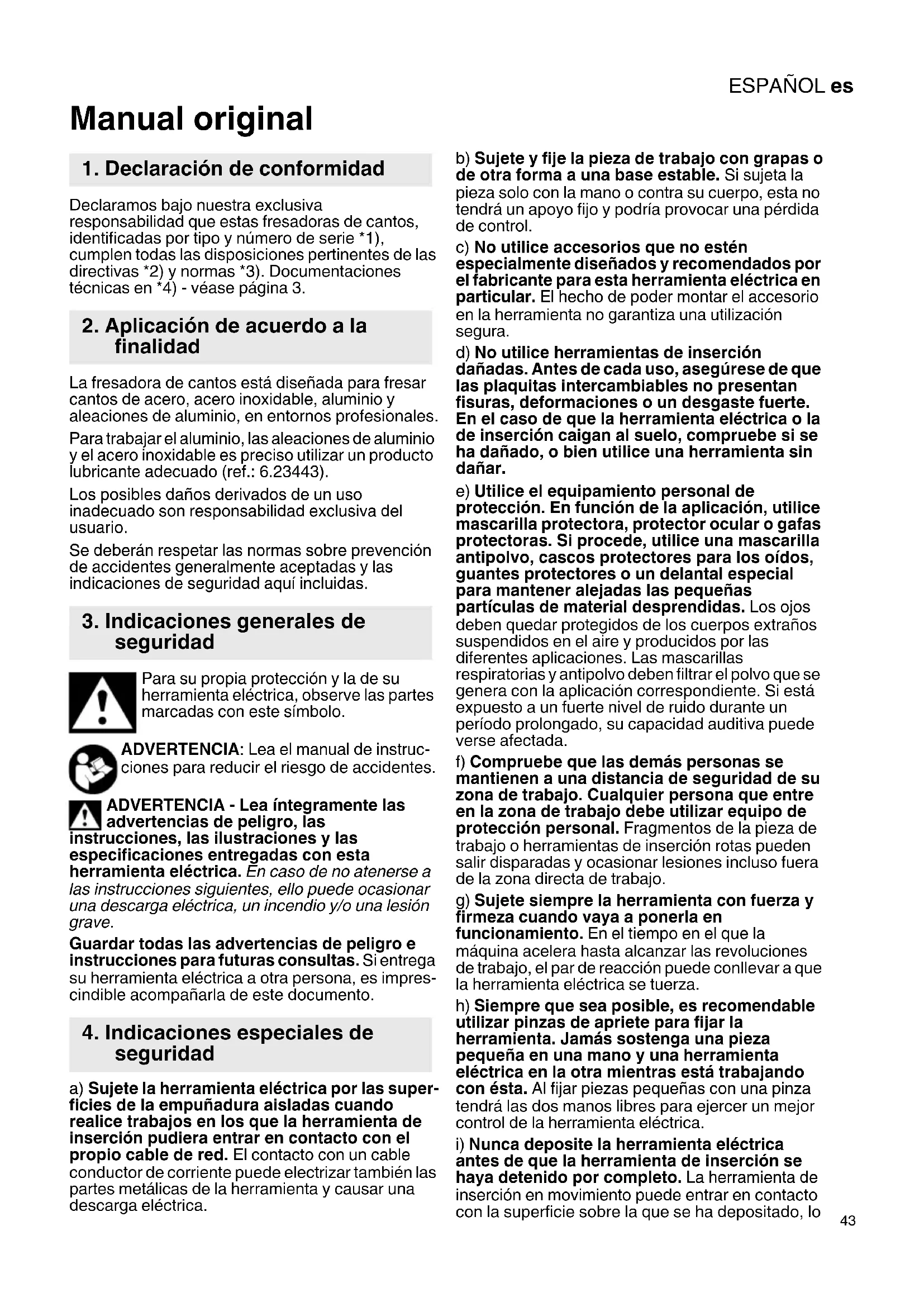 Manual original Declaramos bajo nuestra exclusiva responsabilidad que estas fresadoras de cantos, identificadas por tipo y número de serie *1), cumplen todas las disposiciones pertinentes de las directivas *2) y normas *3). Documentaciones técnicas en *4) - véase página 3. La fresadora de cantos está diseñada para fresar cantos de acero, acero inoxidable, aluminio y aleaciones de aluminio, en entornos profesionales. Para trabajar el aluminio, las aleaciones de aluminio y el acero inoxidable es preciso utilizar un producto lubricante adecuado (ref.: 6.23443). Los posibles daños derivados de un uso inadecuado son responsabilidad exclusiva del usuario. Se deberán respetar las normas sobre prevención de accidentes generalmente aceptadas y las indicaciones de seguridad aquí incluidas. Para su propia protección y la de su herramienta eléctrica, observe las partes marcadas con este símbolo. ADVERTENCIA: Lea el manual de instruc- ciones para reducir el riesgo de accidentes. ADVERTENCIA - Lea íntegramente las advertencias de peligro, las instrucciones, las ilustraciones y las especificaciones entregadas con esta herramienta eléctrica. En caso de no atenerse a las instrucciones siguientes, ello puede ocasionar una descarga eléctrica, un incendio y/o una lesión grave. Guardar todas las advertencias de peligro e instrucciones para futuras consultas. Si entrega su herramienta eléctrica a otra persona, es impres- cindible acompañarla de este documento. a) Sujete la herramienta eléctrica por las super- ficies de la empuñadura aisladas cuando realice trabajos en los que la herramienta de inserción pudiera entrar en contacto con el propio cable de red. El contacto con un cable conductor de corriente puede electrizar también las partes metálicas de la herramienta y causar una descarga eléctrica. b) Sujete y fije la pieza de trabajo con grapas o de otra forma a una base estable. Si sujeta la pieza solo con la mano o contra su cuerpo, esta no tendrá un apoyo fijo y podría provocar una pérdida de control. c) No utilice accesorios que no estén especialmente diseñados y recomendados por el fabricante para esta herramienta eléctrica en particular. El hecho de poder montar el accesorio en la herramienta no garantiza una utilización segura. d) No utilice herramientas de inserción dañadas. Antes de cada uso, asegúrese de que las plaquitas intercambiables no presentan fisuras, deformaciones o un desgaste fuerte. En el caso de que la herramienta eléctrica o la de inserción caigan al suelo, compruebe si se ha dañado, o bien utilice una herramienta sin dañar. e) Utilice el equipamiento personal de protección. En función de la aplicación, utilice mascarilla protectora, protector ocular o gafas protectoras. Si procede, utilice una mascarilla antipolvo, cascos protectores para los oídos, guantes protectores o un delantal especial para mantener alejadas las pequeñas partículas de material desprendidas. Los ojos deben quedar protegidos de los cuerpos extraños suspendidos en el aire y producidos por las diferentes aplicaciones. Las mascarillas respiratorias y antipolvo deben filtrar el polvo que se genera con la aplicación correspondiente. Si está expuesto a un fuerte nivel de ruido durante un período prolongado, su capacidad auditiva puede verse afectada. f) Compruebe que las demás personas se mantienen a una distancia de seguridad de su zona de trabajo. Cualquier persona que entre en la zona de trabajo debe utilizar equipo de protección personal. Fragmentos de la pieza de trabajo o herramientas de inserción rotas pueden salir disparadas y ocasionar lesiones incluso fuera de la zona directa de trabajo. g) Sujete siempre la herramienta con fuerza y firmeza cuando vaya a ponerla en funcionamiento. En el tiempo en el que la máquina acelera hasta alcanzar las revoluciones de trabajo, el par de reacción puede conllevar a que la herramienta eléctrica se tuerza. h) Siempre que sea posible, es recomendable utilizar pinzas de apriete para fijar la herramienta. Jamás sostenga una pieza pequeña en una mano y una herramienta eléctrica en la otra mientras está trabajando con ésta. Al fijar piezas pequeñas con una pinza tendrá las dos manos libres para ejercer un mejor control de la herramienta eléctrica.