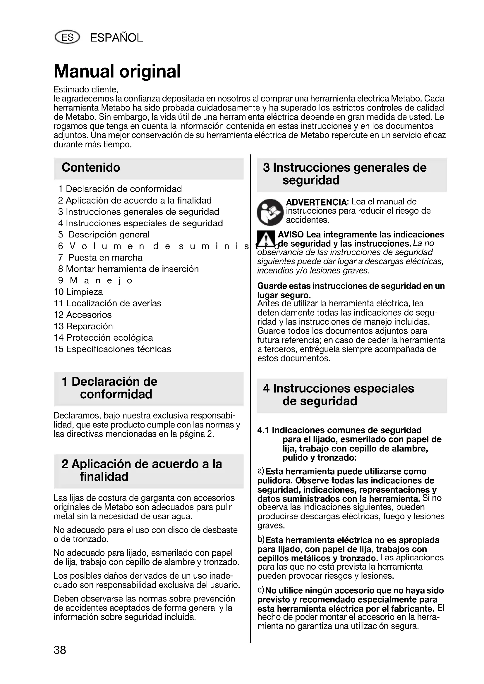 1 Declaración de conformidad 2 Aplicación de acuerdo a la finalidad 3 Instrucciones generales de seguridad 4 Instrucciones especiales de seguridad 5 Descripción general 6Volumen de suministro 7 Puesta en marcha 8 Montar herramienta de inserción 9Manejo 10 Limpieza 11 Localización de averías 12 Accesorios 13 Reparación 14 Protección ecológica 15 Especificaciones técnicas Declaramos, bajo nuestra exclusiva responsabi- lidad, que este producto cumple con las normas y las directivas mencionadas en la página 2. Las lijas de costura de garganta con accesorios originales de Metabo son adecuados para pulir metal sin la necesidad de usar agua. No adecuado para el uso con disco de desbaste o de tronzado. No adecuado para lijado, esmerilado con papel de lija, trabajo con cepillo de alambre y tronzado. Los posibles daños derivados de un uso inade- cuado son responsabilidad exclusiva del usuario. Deben observarse las normas sobre prevención de accidentes aceptados de forma general y la información sobre seguridad incluida. ADVERTENCIA : Lea el manual de instrucciones para reducir el riesgo de accidentes. AVISO Lea íntegramente las indicaciones de seguridad y las instrucciones. La no observancia de las instrucciones de seguridad siguientes puede dar lugar a descargas eléctricas, incendios y/o lesiones graves. Guarde estas instrucciones de seguridad en un lugar seguro. Antes de utilizar la herramienta eléctrica, lea detenidamente todas las indicaciones de segu- ridad y las instrucciones de manejo incluidas. Guarde todos los documentos adjuntos para futura referencia; en caso de ceder la herramienta a terceros, entréguela siempre acompañada de estos documentos.