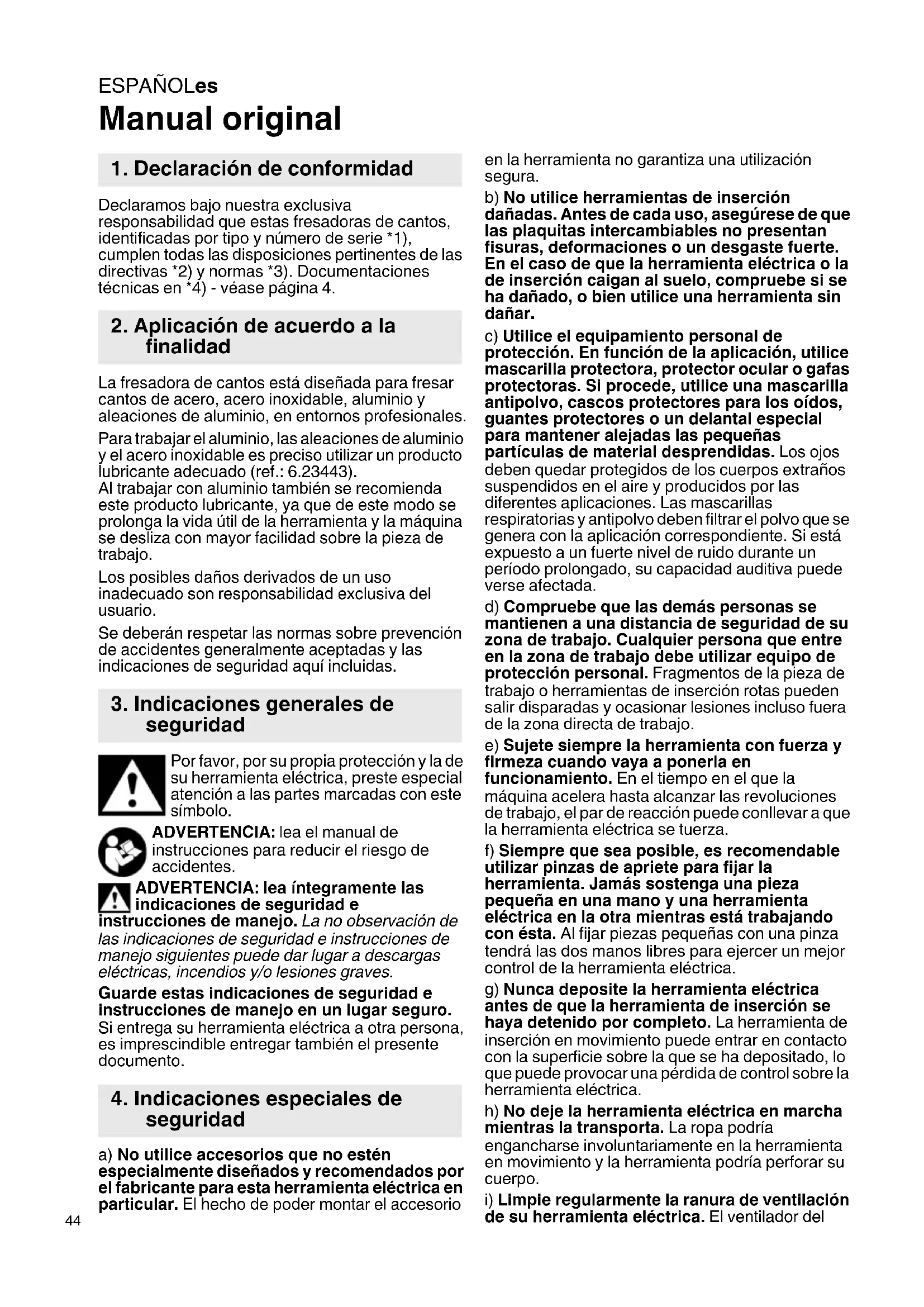 Manual original Declaramos bajo nuestra exclusiva responsabilidad que estas fresadoras de cantos, identificadas por tipo y número de serie *1), cumplen todas las disposiciones pertinentes de las directivas *2) y normas *3). Documentaciones técnicas en *4) - véase página 4. La fresadora de cantos está diseñada para fresar cantos de acero, acero inoxidable, aluminio y aleaciones de aluminio, en entornos profesionales. Para trabajar el aluminio, las aleaciones de aluminio y el acero inoxidable es preciso utilizar un producto lubricante adecuado (ref.: 6.23443). Al trabajar con aluminio también se recomienda este producto lubricante, ya que de este modo se prolonga la vida útil de la herramienta y la máquina se desliza con mayor facilidad sobre la pieza de trabajo. Los posibles daños derivados de un uso inadecuado son responsabilidad exclusiva del usuario. Se deberán respetar las normas sobre prevención de accidentes generalmente aceptadas y las indicaciones de seguridad aquí incluidas. Por favor, por su propia protección y la de su herramienta eléctrica, preste especial atención a las partes marcadas con este símbolo. ADVERTENCIA: lea el manual de instrucciones para reducir el riesgo de accidentes. ADVERTENCIA: lea íntegramente las indicaciones de seguridad e instrucciones de manejo. La no observación de las indicaciones de seguridad e instrucciones de manejo siguientes puede dar lugar a descargas eléctricas, incendios y/o lesiones graves. Guarde estas indicaciones de seguridad e instrucciones de manejo en un lugar seguro. Si entrega su herramienta eléctrica a otra persona, es imprescindible entregar también el presente documento. a) No utilice accesorios que no estén especialmente diseñados y recomendados por el fabricante para esta herramienta eléctrica en particular. El hecho de poder montar el accesorio en la herramienta no garantiza una utilización segura. b) No utilice herramientas de inserción dañadas. Antes de cada uso, asegúrese de que las plaquitas intercambiables no presentan fisuras, deformaciones o un desgaste fuerte. En el caso de que la herramienta eléctrica o la de inserción caigan al suelo, compruebe si se ha dañado, o bien utilice una herramienta sin dañar. c) Utilice el equipamiento personal de protección. En función de la aplicación, utilice mascarilla protectora, protector ocular o gafas protectoras. Si procede, utilice una mascarilla antipolvo, cascos protectores para los oídos, guantes protectores o un delantal especial para mantener alejadas las pequeñas partículas de material desprendidas. Los ojos deben quedar protegidos de los cuerpos extraños suspendidos en el aire y producidos por las diferentes aplicaciones. Las mascarillas respiratorias y antipolvo deben filtrar el polvo que se genera con la aplicación correspondiente. Si está expuesto a un fuerte nivel de ruido durante un período prolongado, su capacidad auditiva puede verse afectada. d) Compruebe que las demás personas se mantienen a una distancia de seguridad de su zona de trabajo. Cualquier persona que entre en la zona de trabajo debe utilizar equipo de protección personal. Fragmentos de la pieza de trabajo o herramientas de inserción rotas pueden salir disparadas y ocasionar lesiones incluso fuera de la zona directa de trabajo. e) Sujete siempre la herramienta con fuerza y firmeza cuando vaya a ponerla en funcionamiento. En el tiempo en el que la máquina acelera hasta alcanzar las revoluciones de trabajo, el par de reacción puede conllevar a que la herramienta eléctrica se tuerza. f) Siempre que sea posible, es recomendable utilizar pinzas de apriete para fijar la herramienta. Jamás sostenga una pieza pequeña en una mano y una herramienta eléctrica en la otra mientras está trabajando con ésta. Al fijar piezas pequeñas con una pinza tendrá las dos manos libres para ejercer un mejor control de la herramienta eléctrica. g) Nunca deposite la herramienta eléctrica antes de que la herramienta de inserción se haya detenido por completo. La herramienta de inserción en movimiento puede entrar en contacto con la superficie sobre la que se ha depositado, lo que puede provocar una pérdida de control sobre la herramienta eléctrica. h) No deje la herramienta eléctrica en marcha mientras la transporta. La ropa podría engancharse involuntariamente en la herramienta en movimiento y la herramienta podría perforar su cuerpo.