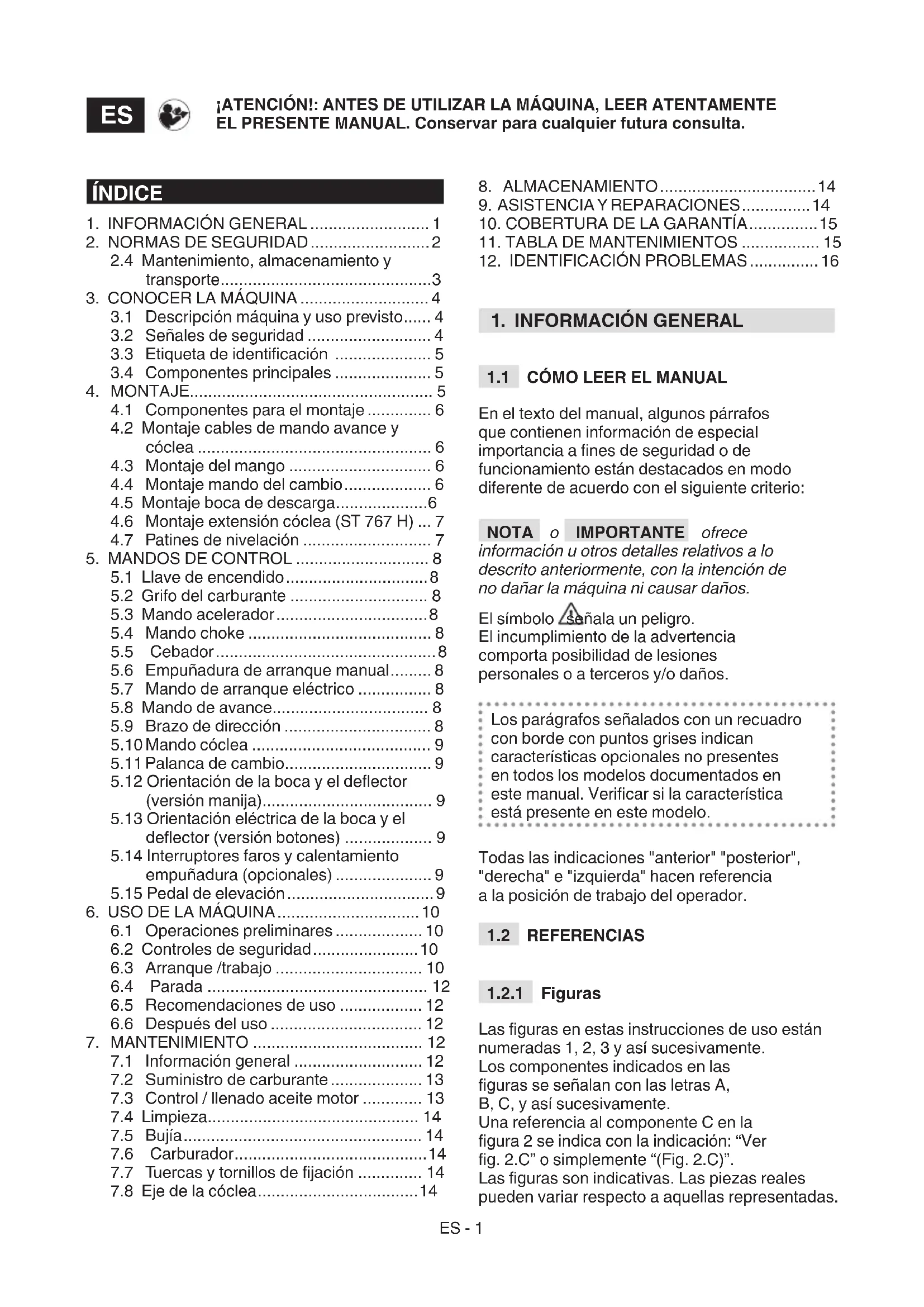 Las guras en estas instrucciones de uso están numeradas 1, 2, 3 y así sucesivamente. Los componentes indicados en las guras se señalan con las letras A, B, C, y así sucesivamente. Una referencia al componente C en la gura 2 se indica con la indicación: “Ver g. 2.C” o simplemente “(Fig. 2.C)”. Las guras son indicativas. Las piezas reales pueden variar respecto a aquellas representadas. ¡ATENCIÓN!: ANTES DE UTILIZAR LA MÁQUINA, LEER ATENTAMENTE EL PRESENTE MANUAL. Conservar para cualquier futura consulta.