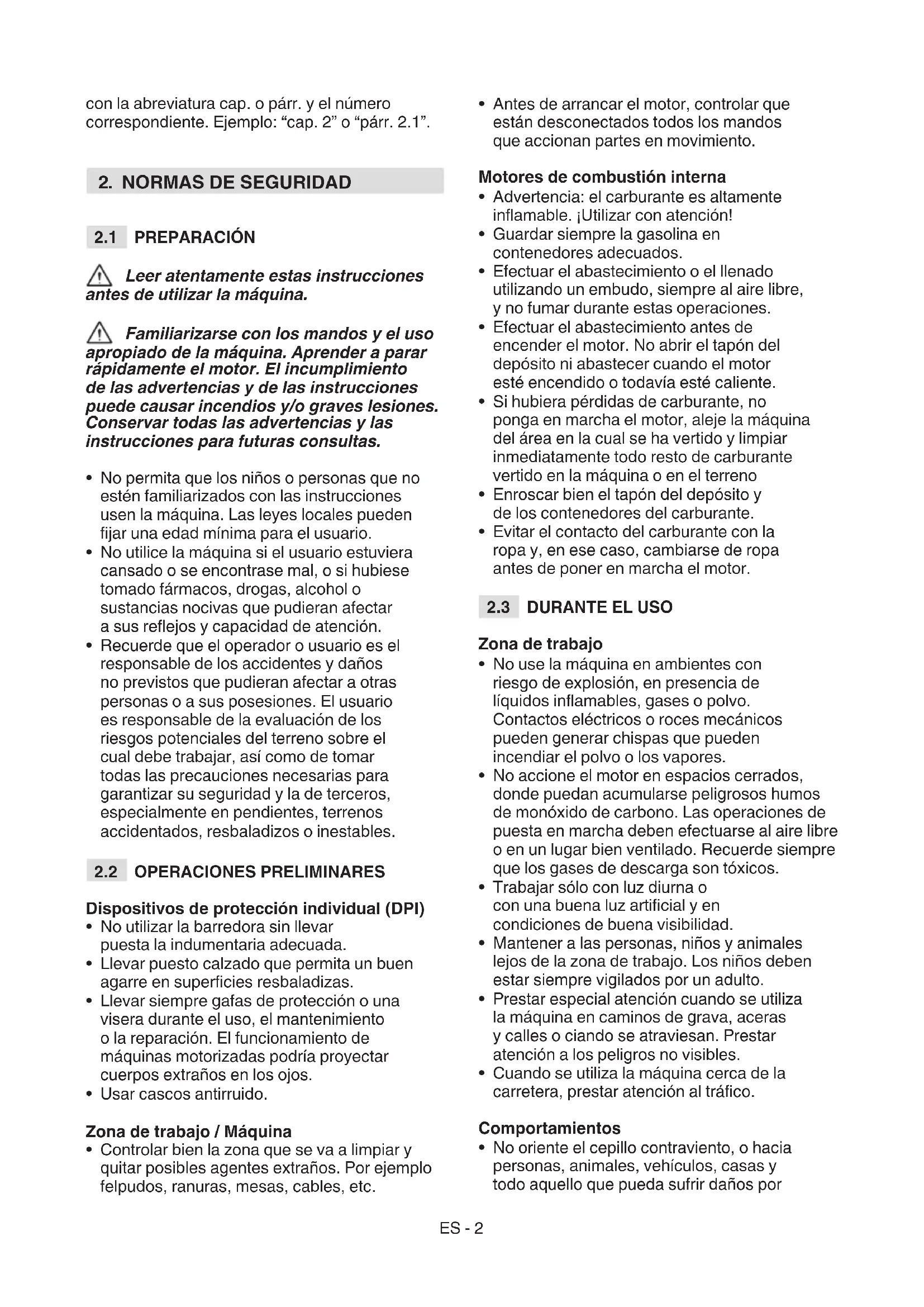 - No oriente el cepillo contraviento, o hacia personas, animales, vehículos, casas y todo aquello que pueda sufrir daños porES - 3 los materiales barridos. No permita que nadie pare delante de la máquina.