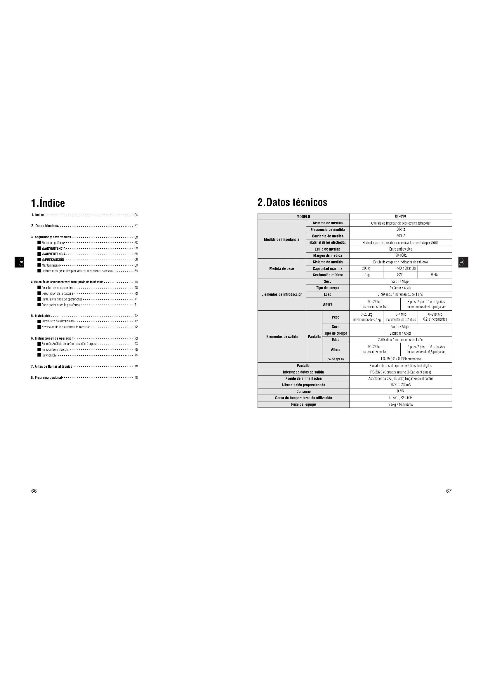 2.Datos técnicos MODELO BF-350 Medida de impedancia Medida de peso Sistema de medida Análisis de impedancia bioeléctrica tetrapolar Frecuencia de medida 50kHz Corriente de medida 500µA Material de los electrodos Electrodos para los pies de acero inoxidable de contacto por presión Estilo de medida Entre ambos pies Margen de medida 150~900Ω Sistema de medida Célula de carga con indicador de esfuerzo Capacidad máxima Graduación mínima Varón / Mujer Elementos de introducción Elementos de salida Pantalla Pantalla Peso Sexo Estándar / Atleta Tipo de cuerpo 7~99 años / incrementos de 1 año Edad 90~249cm incrementos de 1cm Varón / Mujer 3 pies~7 pies 11,5 pulgadas incrementos de 0,5 pulgadas Altura Sexo Estándar / Atleta Tipo de cuerpo 7~99 años / incrementos de 1 año Edad 90~249cm incrementos de 1cm Pantalla de cristal líquido de 2 filas de 5 dígitos 3 pies~7 pies 11,5 pulgadas incrementos de 0,5 pulgadas Altura % de grasa 1.0~75.0% / 0.1% incrementos Interfaz de datos de salida RS-232C (Conector macho D-Sub de 9 pines) Fuente de alimentación Adaptador de CA (incluido) Negativo en el centro Alimentación proporcionada 9V CC, 200mA Consumo 0.7W Gama de temperaturas de utilización 0~35˚C/32~95˚F Peso del equipo 7,5kg / 16,5 libras