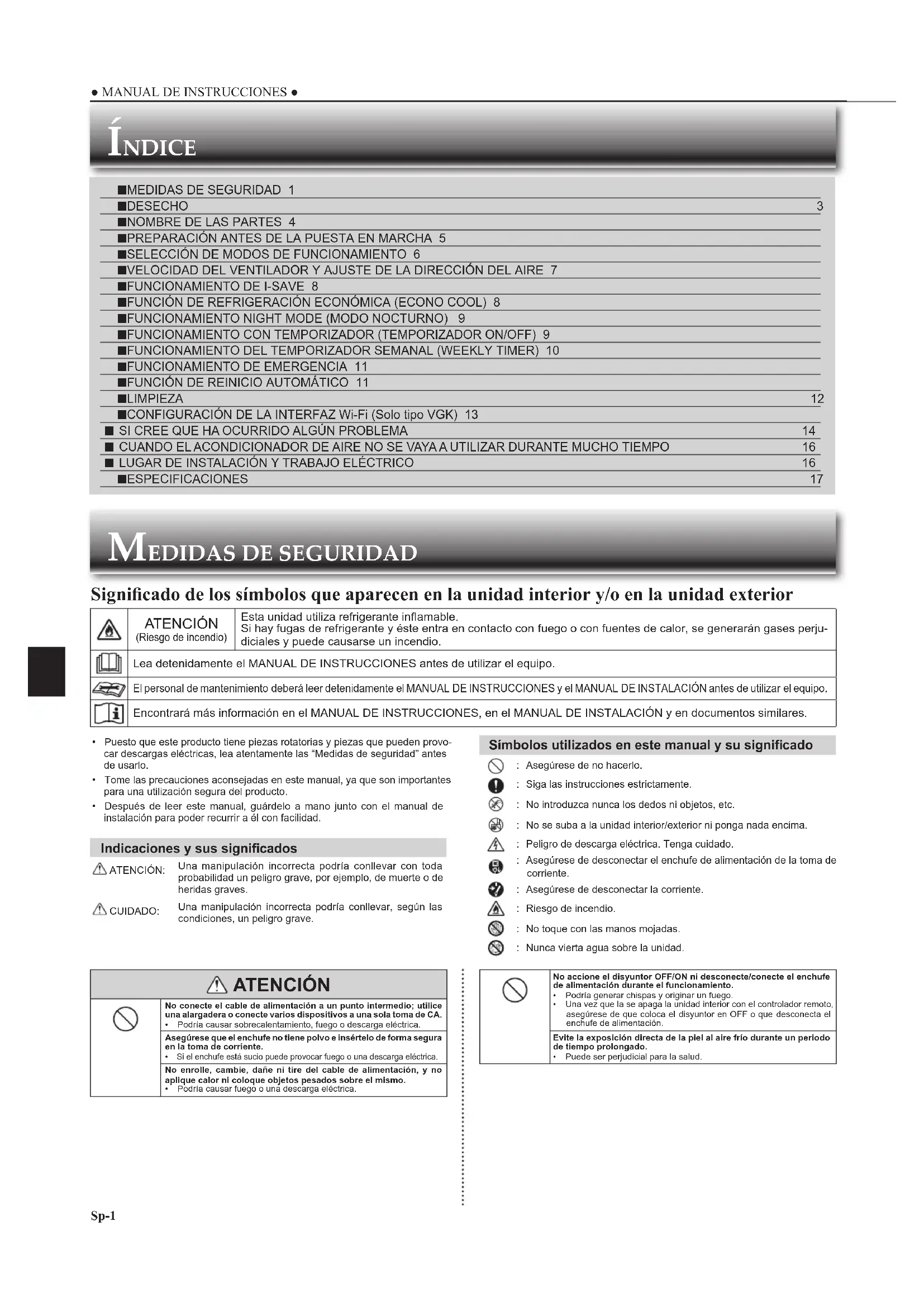 ÍNDICE ■ MEDIDAS DE SEGURIDAD 1 ■ DESECHO 3 ■ NOMBRE DE LAS PARTES 4 ■ PREPARACIÓN ANTES DE LA PUESTA EN MARCHA 5 ■ SELECCIÓN DE MODOS DE FUNCIONAMIENTO 6 ■ VELOCIDAD DEL VENTILADOR Y AJUSTE DE LA DIRECCIÓN DEL AIRE 7 ■ FUNCIONAMIENTO DE I-SAVE 8 ■ FUNCIÓN DE REFRIGERACIÓN ECONÓMICA (ECONO COOL) 8 ■ FUNCIONAMIENTO NIGHT MODE (MODO NOCTURNO) 9 ■ FUNCIONAMIENTO CON TEMPORIZADOR (TEMPORIZADOR ON/OFF) 9 ■ FUNCIONAMIENTO DEL TEMPORIZADOR SEMANAL (WEEKLY TIMER) 10 ■ FUNCIONAMIENTO DE EMERGENCIA 11 ■ FUNCIÓN DE REINICIO AUTOMÁTICO 11 ■ LIMPIEZA 12 ■ CONFIGURACIÓN DE LA INTERFAZ Wi-Fi (Solo tipo VGK) 13 ■ SI CREE QUE HA OCURRIDO ALGÚN PROBLEMA 14 ■ CUANDO EL ACONDICIONADOR DE AIRE NO SE VAYA A UTILIZAR DURANTE MUCHO TIEMPO 16 ■ LUGAR DE INSTALACIÓN Y TRABAJO ELÉCTRICO 16 ■ ESPECIFICACIONES 17 ATENCIÓN No conecte el cable de alimentación a un punto intermedio; utilice una alargadera o conecte varios dispositivos a una sola toma de CA.• Podría causar sobrecalentamiento, fuego o descarga eléctrica.Asegúrese que el enchufe no tiene polvo e insértelo de forma segura en la toma de corriente. Si el enchufe está sucio puede provocar fuego o una descarga eléctrica.No enrolle, cambie, dañe ni tire del cable de alimentación, y no aplique calor ni coloque objetos pesados sobre el mismo.• Podría causar fuego o una descarga eléctrica.• Puesto que este producto tiene piezas rotatorias y piezas que pueden provo-car descargas eléctricas, lea atentamente las “Medidas de seguridad” antes de usarlo.• Tome las precauciones aconsejadas en este manual, ya que son importantes para una utilización segura del producto.