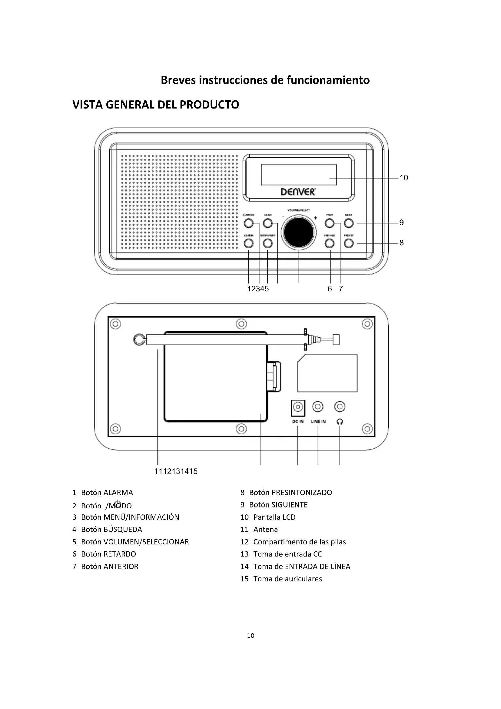 1 Botón ALARMA 2 Botón /MODO 3 Botón MENÚ/INFORMACIÓN 4 Botón BÚSQUEDA 5 Botón VOLUMEN/SELECCIONAR 6 Botón RETARDO 7 Botón ANTERIOR 8 Botón PRESINTONIZADO 9 Botón SIGUIENTE 10 Pantalla LCD 11 Antena 12 Compartimento de las pilas 13 Toma de entrada CC 14 Toma de ENTRADA DE LÍNEA 15 Toma de auriculares