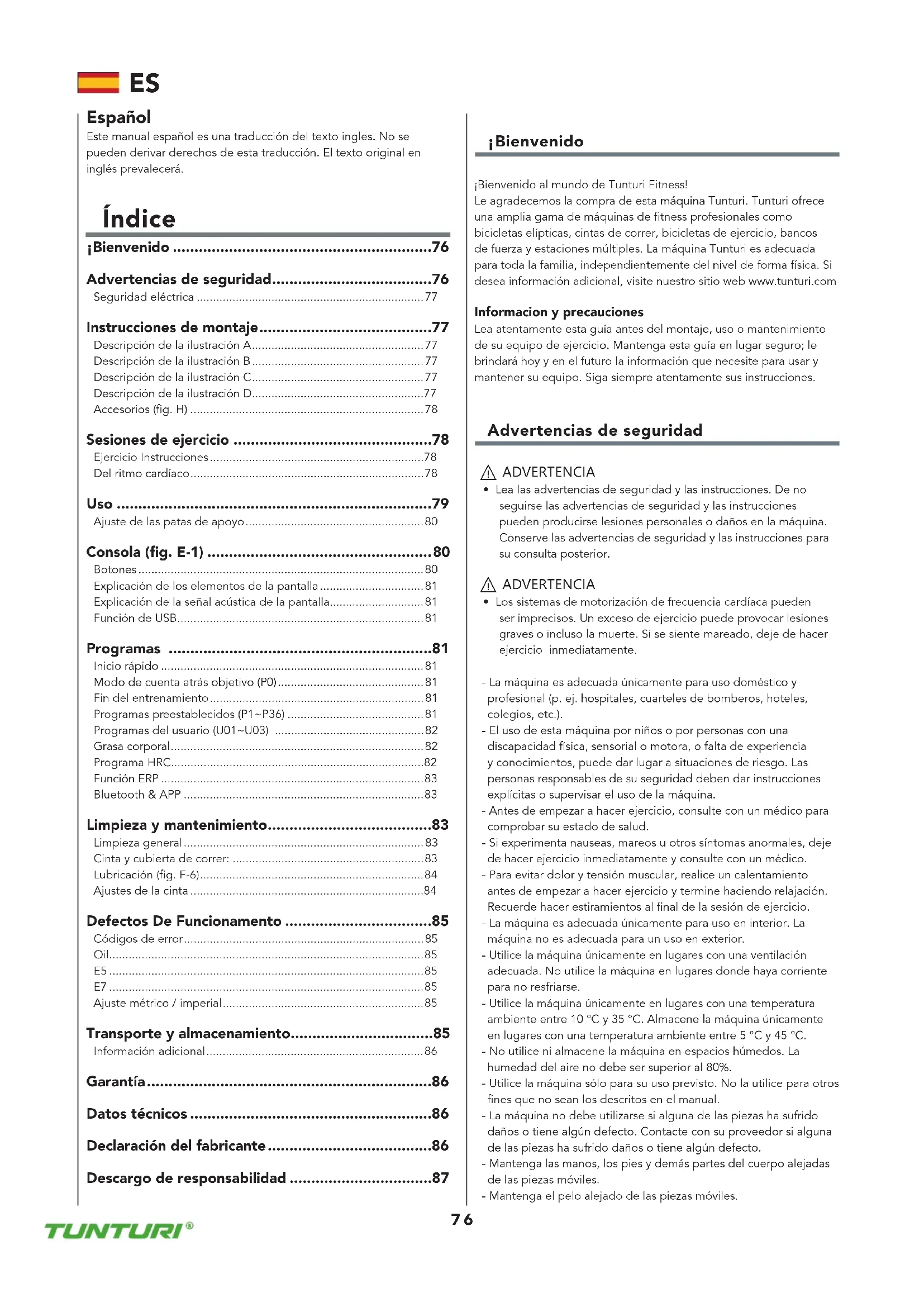 - Transporte y almacenamiento 85 Información adicional Garantía 86 Datos técnicos 86 Declaración del fabricante 86 Descargo de responsabilidad 87 ¡Bienvenido ¡Bienvenido al mundo de Tunturi Fitness!Le agradecemos la compra de esta máquina Tunturi. Tunturi ofrece una amplia gama de máquinas de fitness profesionales como bicicletas elípticas, cintas de correr, bicicletas de ejercicio, bancos de fuerza y estaciones múltiples. La máquina Tunturi es adecuada para toda la familia, independientemente del nivel de forma física. Si desea información adicional, visite nuestro sitio web www.tunturi.comInformacion y precaucionesLea atentamente esta guía antes del montaje, uso o mantenimiento de su equipo de ejercicio. Mantenga esta guía en lugar seguro; le brindará hoy y en el futuro la información que necesite para usar y mantener su equipo. Siga siempre atentamente sus instrucciones. Advertencias de seguridad ⚠ ADVERTENCIA p. 86