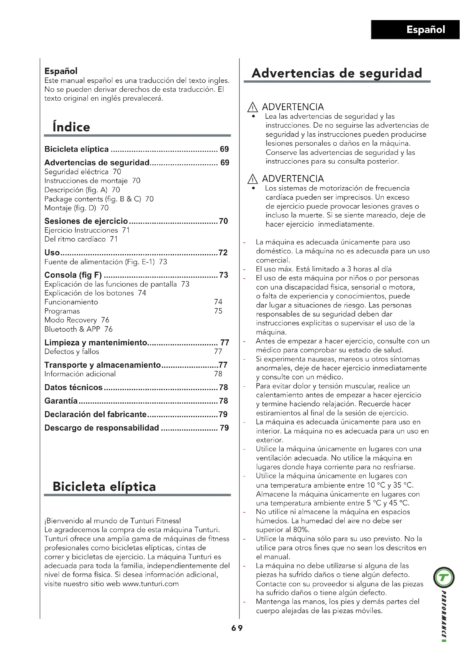 - Garanzia Garanzia dell’attrezzo sportivo Tunturi Condizioni di garanzia Il consumatore è tutelato da tutti i diritti previsti dalla legislazione nazionale e riguardanti l’acquisto di beni di consumo. Questi diritti fondamentali non sono limitati dalle condizioni di garanzia. La garanzia entra in vigore solo se l’attrezzo in questione prodotto dall’azienda Tunturi Ltd. viene utilizzato in linea con le condizioni ambientali d’uso specificate dal fabbricante. Le condizioni ambientali d’uso degli attrezzi son Condizioni per la garanzia La garanzia entra in vigore dalla data dell’acquisto dell’attrezzo. Le condizioni per la garanzia possono variare in funzione del paese. Rivolgersi al rivenditore di zona per maggiori informazioni sulle condizioni per la garanzia. Copertura della garanzia L’azienda Tunturi Ltd ed i suoi rappresentanti non rispondono per nessun motivo dei danni indiretti causati all’acquirente dall’attrezzo. Per danni indiretti s’intendono quelli relativi al mandato sfruttamento dell’attrezzo, mancato guadagno o altri danni di natura economica. Limiti di garanzia La garanzia copre i difetti di materiale e fabbrica dell’attrezzo che si manifestano subito dopo l’acquisto. La garanzia copre solo i difetti che si manifestano durante l’uso normale e conforme alle istruzioni del manuale di installazione, manutenzione ed uso fornito da Tunturi. L’azienda Tunturi Ltd ed i suoi rivenditori non rispondono dei danni causati da eventi al di fuori del loro controllo. La garanzia riguarda solo il proprietario originario dell’attrezzo ed è in vigore solo in quei paesi in cui Tunturi Ltd dispone di un proprio rappresentante autorizzato. La garanzia non copre i difetti di quegli attrezzi o componenti che sono stati modificati senza l’espressa autorizzazione del fabbricante Tunturi Ltd. La garanzia non copre i difetti causati dalla normale usura, da un uso in condizioni non previste, dalla corrosione, dalla movimentazione e dal trasporto. La garanzia non copre rumori o suoni emessi durante l’uso a meno che non impediscano l’uso dell’attrezzo e che non siano causati da un guasto all’attrezzo stesso. La garanzia non comprende nemmeno i normali interventi di servizio dell’attrezzo, come per esempio la pulizia, lubrificazione, controllo periodico dei componenti né le piccole installazioni che può effettuare il cliente stesso e che non richiedono lo smontaggio/montaggio dell’attrezzo. Questi interventi sono, per esempio, la sostituzione del pannello, dei pedali o di altri componenti analoghi. La garanzia non copre gli interventi di riparazione previsti, se non vengono eseguiti da un rappresentante autorizzato Tunturi. Se sbagliate a seguire le istruzioni del manuale d’uso, decade subito la garanzia sul prodotto. Dichiarazione del fabbricante Tunturi New Fitness BV dichiara che questo prodotto è conforme ai seguenti standard e direttive: EN 957 (HB), 89/336/CEE. Pertanto sul prodotto è apposto il marchio CE. 01-2017 Tunturi New Fitness BV Purmerweg 1 1311 XE Almere Paesi Bassi Clausola di esonero della responsabilità © 2017 Tunturi New Fitness BV Tutti i diritti riservati. Il prodotto e il manuale sono soggetti a modifiche. Le specifiche tecniche possono essere modificate senza preavviso.69 Español Español Este manual español es una traducción del texto ingles. No se pueden derivar derechos de esta traducción. El texto original en inglés prevalecerá. Índice Bicicleta elíptica ¡Bienvenido al mundo de Tunturi Fitness!Le agradecemos la compra de esta máquina Tunturi. Tunturi ofrece una amplia gama de máquinas de fitness profesionales como bicicletas elípticas, cintas de correr y bicicletas de ejercicio. La máquina Tunturi es adecuada para toda la familia, independientemente del nivel de forma física. Si desea información adicional, visite nuestro sitio web www.tunturi.com Bicicleta elíptica p. 69