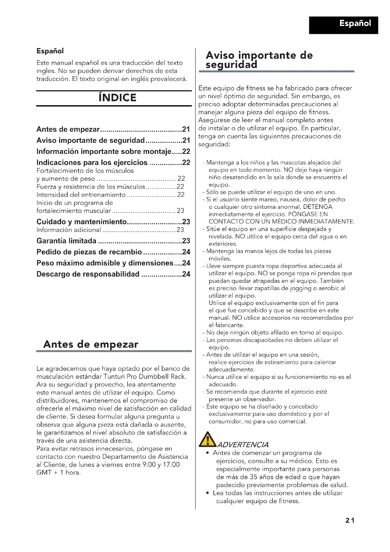- Descargo de responsabilidad Antes de empezar Le agradecemos que haya optado por el banco de musculación estándar Tunturi Pro Dumbbell Rack. Ara su seguridad y provecho, lea atentamente este manual antes de utilizar el equipo. Como distribuidores, mantenemos el compromiso de ofrecerle el máximo nivel de satisfacción en calidad de cliente. Si desea formular alguna pregunta u observa que alguna pieza está dañada o ausente, le garantizamos el nivel absoluto de satisfacción a través de una asistencia directa. Para evitar retrasos innecesarios, póngase en contacto con nuestro Departamento de Asistencia al Cliente, de lunes a viernes entre 9:00 y 17:00 GMT + 1 hora. Aviso importante de seguridad Este equipo de fitness se ha fabricado para ofrecer un nivel óptimo de seguridad. Sin embargo, es preciso adoptar determinadas precauciones al manejar alguna pieza del equipo de fitness. Asegúrese de leer el manual completo antes de instalar o de utilizar el equipo. En particular, tenga en cuenta las siguientes precauciones de seguridad: - Mantenga a los niños y las mascotas alejados del equipo en todo momento. NO deje haya ningún niño desatendido en la sala donde se encuentra el equipo. - Sólo se puede utilizar el equipo de uno en uno. - Si el usuario siente mareo, nausea, dolor de pecho o cualquier otro síntoma anormal, DETENGA inmediatamente el ejercicio. PÓNGASE EN CONTACTO CON UN MÉDICO INMEDIATAMENTE. - Sitúe el equipo en una superficie despejada y nivelada. NO utilice el equipo cerca del agua o en exteriores. - Mantenga las manos lejos de todas las piezas móviles. - Lleve siempre puesta ropa deportiva adecuada al utilizar el equipo. NO se ponga ropa ni prendas que puedan quedar atrapadas en el equipo. También es preciso llevar zapatillas de jogging o aerobic al utilizar el equipo. Utilice el equipo exclusivamente con el fin para el que fue concebido y que se describe en este manual. NO utilice accesorios no recomendados por el fabricante. - No deje ningún objeto afilado en torno al equipo. - Las personas discapacitadas no deben utilizar el equipo. - Antes de utilizar el equipo en una sesión, realice ejercicios de estiramiento para calentar adecuadamente. - Nunca utilice el equipo si su funcionamiento no es el adecuado. - Se recomienda que durante el ejercicio esté presente un observador. - Este equipo se ha diseñado y concebido exclusivamente para uso doméstico y por el consumidor, no para uso comercial. ADVERTENCIA p. 24