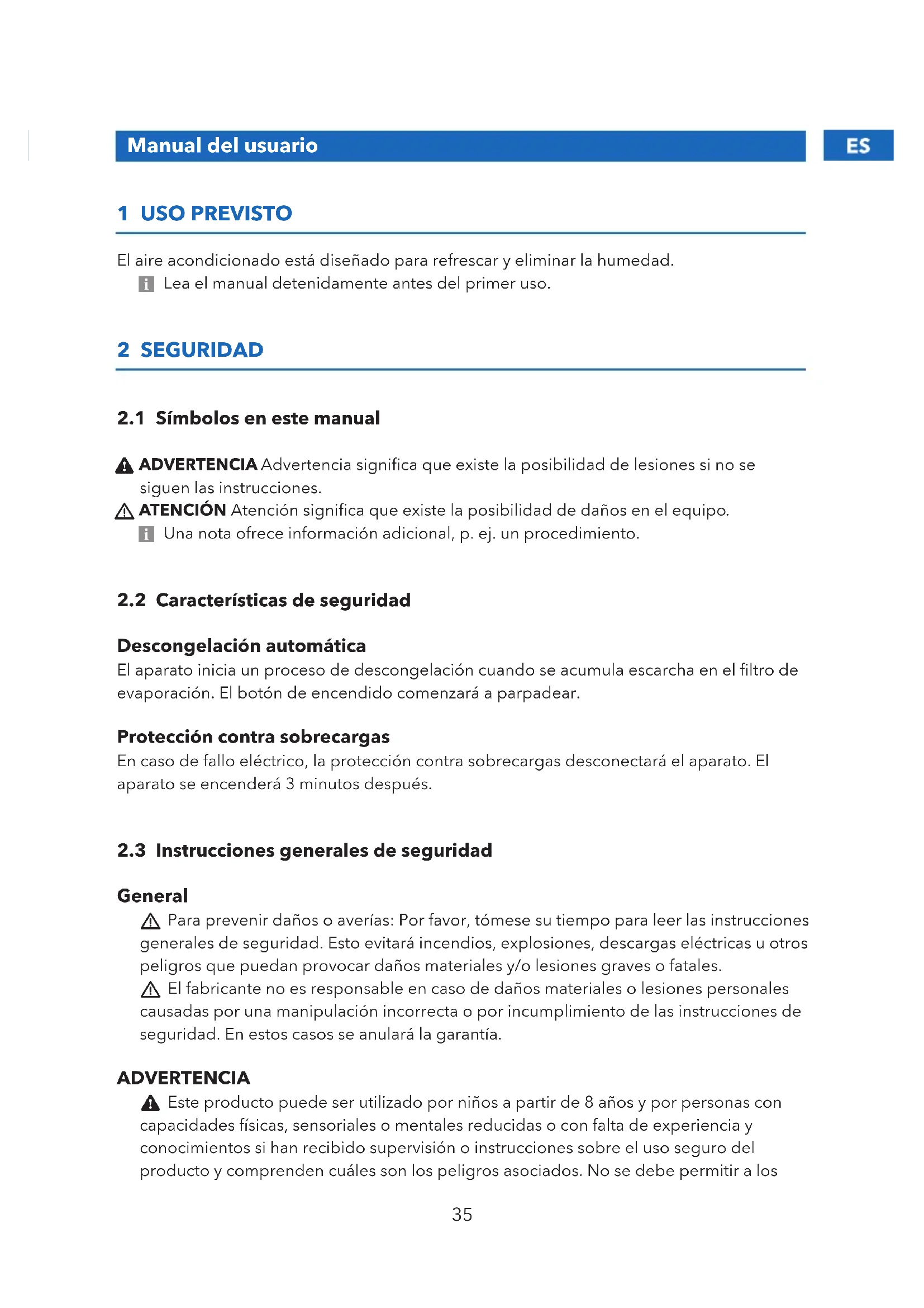 General 1 Para prevenir daños o averías: Por favor, tómese su tiempo para leer las instrucciones generales de seguridad. Esto evitará incendios, explosiones, descargas eléctricas u otros peligros que puedan provocar daños materiales y/o lesiones graves o fatales. 1 El fabricante no es responsable en caso de daños materiales o lesiones personales causadas por una manipulación incorrecta o por incumplimiento de las instrucciones de seguridad. En estos casos se anulará la garantía. ADVERTENCIA 6 Este producto puede ser utilizado por niños a partir de 8 años y por personas con capacidades físicas, sensoriales o mentales reducidas o con falta de experiencia y conocimientos si han recibido supervisión o instrucciones sobre el uso seguro del producto y comprenden cuáles son los peligros asociados. No se debe permitir a los36 niños jugar con este producto. No se debe permitir a los niños limpiar o realizar un mantenimiento de usuario sin supervisión. 6 No abra el circuito del refrigerante. 6 Si se produce una fuga de refrigerante, evacúe inmediatamente a todas las personas que se encuentren en la habitación. Ventile la habitación y póngase en contacto con los bomberos locales para informarles sobre la fuga de propano. No entre en la sala hasta que un técnico cualificado declare que es seguro hacerlo. No utilice mecheros, cigarrillos ni otros objetos inflamables cerca de la habitación. 6 Utilice únicamente gas R-290 (propano) como refrigerante. 6 Evite el contacto del refrigerante con los ojos, la piel y la ropa. 6 No ejercer fuerza sobre el aparato. 6 Compruebe siempre que la tensión de red se corresponda con la tensión indicada en la placa de características. 6 Utilice solamente accesorios originales del fabricante. 6 No derrame líquidos sobre el aparato. 6 Nunca deje a los niños sin supervisión con el material de embalaje. El material de embalaje representa un peligro de asfixia. Los niños subestiman el peligro con frecuencia. Mantenga siempre a los niños alejados de los materiales de embalaje. 6 No está permitido abrir o reparar el producto personalmente ni dejar que otros lo hagan. En tal caso, la garantía perderá su validez. El mantenimiento debe ser realizado por personal técnico certificado. 6 No bloquear los orificios de ventilación. 6 No introducir ningún objeto en los orificios de ventilación. 6 Los cables de alimentación deben colocarse de tal manera que no se puedan pisar fácilmente y que no se enreden en objetos cercanos a ellos. Preste especial atención a los cables en los enchufes y en puntos en los que los cables salen del producto. 6 Desconecte el aparato de la fuente de alimentación durante su reparación o cuando no se esté utilizando. 6 No utilice el aparato con las manos mojadas. 6 No deje el aparato desatendido. 6 No desenchufe el aparato mientras esté funcionando. 6 No utilice el aparato si está dañado. ATENCIÓN 1 No poner el aparato cerca de una fuente de calor. Esto podría dañar el aparato. 1 Coloque el aparato sobre una superficie plana horizontal. Observaciones 5 Le recomendamos guardar el cartón y los materiales de embalaje originales en caso de que sea necesario devolver el producto para su reparación. Es la única manera de proteger con seguridad el producto frente a daños durante el transporte. Si tira el cartón y los materiales de embalaje, recuerde reciclarlos con el debido respeto al medio ambiente.37