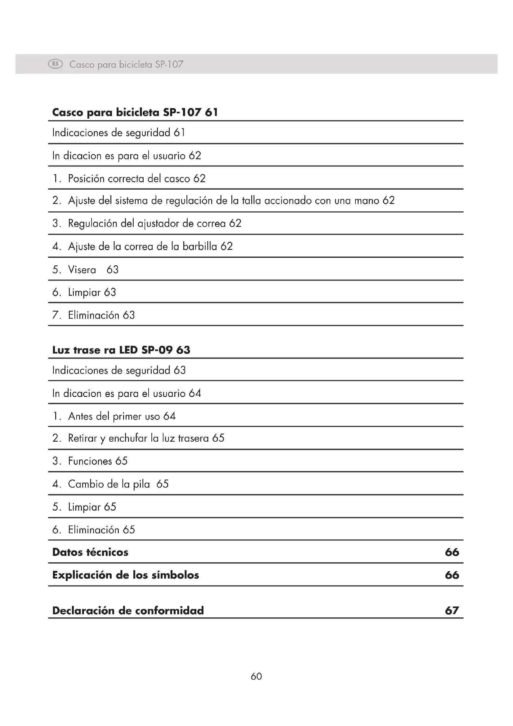 Datos técnicos 66 Explicación de los símbolos 66 Declaración de conformidad 67 Casco para bicicleta SP-10761 Casco para bicicleta SP-107