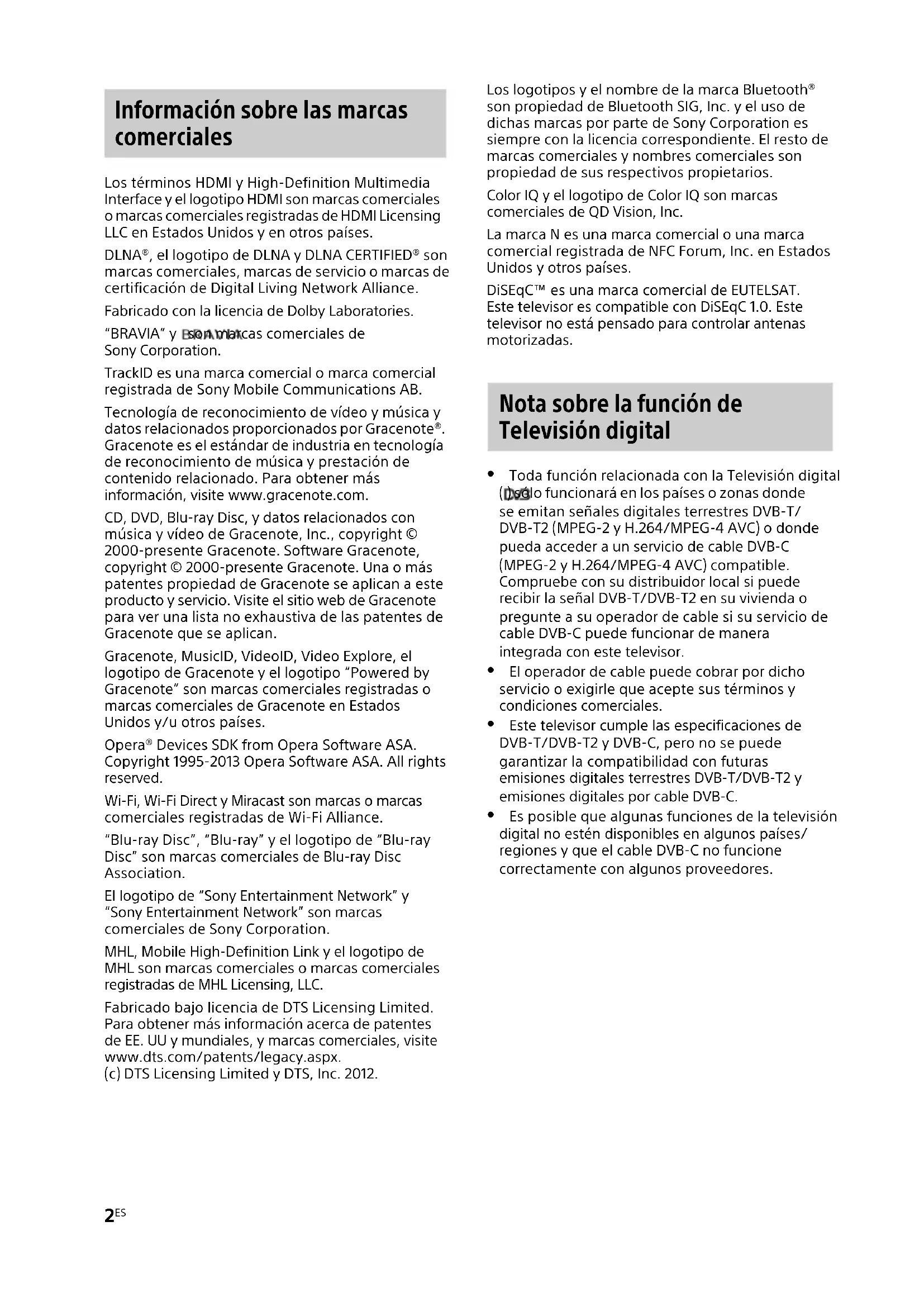 Los términos HDMI y High-Definition Multimedia Interface y el logotipo HDMI son marcas comerciales o marcas comerciales registradas de HDMI Licensing LLC en Estados Unidos y en otros países. DLNA®, el logotipo de DLNA y DLNA CERTIFIED® son marcas comerciales, marcas de servicio o marcas de certificación de Digital Living Network Alliance. Fabricado con la licencia de Dolby Laboratories. “BRAVIA” y son marcas comerciales de Sony Corporation. TrackID es una marca comercial o marca comercial registrada de Sony Mobile Communications AB. Tecnología de reconocimiento de vídeo y música y datos relacionados proporcionados por Gracenote®. Gracenote es el estándar de industria en tecnología de reconocimiento de música y prestación de contenido relacionado. Para obtener más información, visite www.gracenote.com. CD, DVD, Blu-ray Disc, y datos relacionados con música y vídeo de Gracenote, Inc., copyright © 2000-presente Gracenote. Software Gracenote, copyright © 2000-presente Gracenote. Una o más patentes propiedad de Gracenote se aplican a este producto y servicio. Visite el sitio web de Gracenote para ver una lista no exhaustiva de las patentes de Gracenote que se aplican. Gracenote, MusicID, VideoID, Video Explore, el logotipo de Gracenote y el logotipo “Powered by Gracenote” son marcas comerciales registradas o marcas comerciales de Gracenote en Estados Unidos y/u otros países. Opera® Devices SDK from Opera Software ASA. Copyright 1995-2013 Opera Software ASA. All rights reserved. Wi-Fi, Wi-Fi Direct y Miracast son marcas o marcas comerciales registradas de Wi-Fi Alliance. “Blu-ray Disc”, “Blu-ray” y el logotipo de “Blu-ray Disc” son marcas comerciales de Blu-ray Disc Association. El logotipo de “Sony Entertainment Network” y “Sony Entertainment Network” son marcas comerciales de Sony Corporation. MHL, Mobile High-Definition Link y el logotipo de MHL son marcas comerciales o marcas comerciales registradas de MHL Licensing, LLC. Fabricado bajo licencia de DTS Licensing Limited. Para obtener más información acerca de patentes de EE. UU y mundiales, y marcas comerciales, visite www.dts.com/patents/legacy.aspx. (c) DTS Licensing Limited y DTS, Inc. 2012. Los logotipos y el nombre de la marca Bluetooth® son propiedad de Bluetooth SIG, Inc. y el uso de dichas marcas por parte de Sony Corporation es siempre con la licencia correspondiente. El resto de marcas comerciales y nombres comerciales son propiedad de sus respectivos propietarios. Color IQ y el logotipo de Color IQ son marcas comerciales de QD Vision, Inc. La marca N es una marca comercial o una marca comercial registrada de NFC Forum, Inc. en Estados Unidos y otros países. DiSEqC™ es una marca comercial de EUTELSAT. Este televisor es compatible con DiSEqC 1.0. Este televisor no está pensado para controlar antenas motorizadas. Toda función relacionada con la Televisión digital ( ) sólo funcionará en los países o zonas donde se emitan señales digitales terrestres DVB-T/ DVB-T2 (MPEG-2 y H.264/MPEG-4 AVC) o donde pueda acceder a un servicio de cable DVB-C (MPEG-2 y H.264/MPEG-4 AVC) compatible. Compruebe con su distribuidor local si puede recibir la señal DVB-T/DVB-T2 en su vivienda o pregunte a su operador de cable si su servicio de cable DVB-C puede funcionar de manera integrada con este televisor. El operador de cable puede cobrar por dicho servicio o exigirle que acepte sus términos y condiciones comerciales. Este televisor cumple las especificaciones de DVB-T/DVB-T2 y DVB-C, pero no se puede garantizar la compatibilidad con futuras emisiones digitales terrestres DVB-T/DVB-T2 y emisiones digitales por cable DVB-C. Es posible que algunas funciones de la televisión digital no estén disponibles en algunos países/ regiones y que el cable DVB-C no funcione correctamente con algunos proveedores. Información sobre las marcas comerciales Nota sobre la función de Televisión digital3
