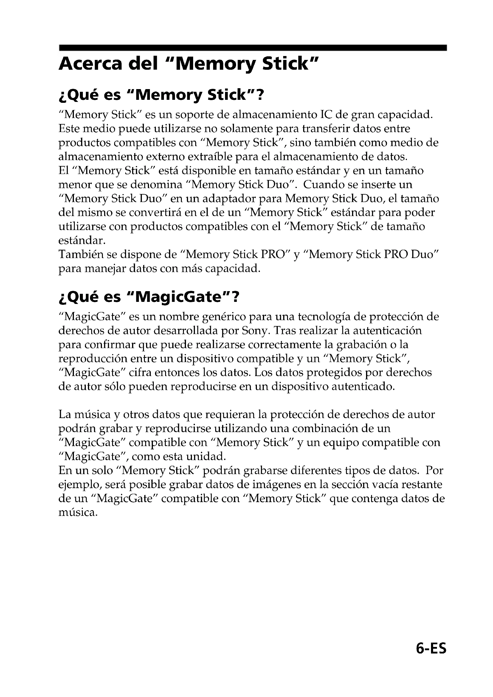 - Para desenchufar el cable USB, no tire del cable sino del conector.5-ES Índice Precauciones de uso ............................................................................................. 4 Acerca del “Memory Stick”................................................................................. 6 Requisitos del sistema .......................................................................................... 9 Comprobación de los elementos incluidos ..................................................... 13 Aplicaciones suministradas para Windows ................................................... 14 Utilización del manual de instrucciones y la ayuda...................................... 16 Instalación del software en su PC (Cuando utilice Windows) .................... 18 Instalación del software “SonicStage” en su PC ............................................ 21 Conexión de esta unidad a su PC..................................................................... 22 Confirmación de las conexiones ....................................................................... 24 Cuando no se indique el disco extraíble (icono de Memory Stick) ............. 25 Copia en su PC de los datos de imágenes grabados en un “Memory Stick” .................................................................................................. 28 Desconexión de la unidad de su PC ................................................................ 29 Forma de utilización (Cuando utilice Macintosh) ......................................... 31 Acerca de “SonicStage” ..................................................................................... 33 Antes de utilizar “SonicStage” (Lea sin falta) ................................................ 35 Inicio de “SonicStage”........................................................................................ 37 Formateo (inicialización) de un “Memory Stick” .......................................... 38 Precauciones para la utilización de “Memory Stick” .................................... 40 Desinstalación (Borrado) del software ............................................................ 42 Solución de problemas ....................................................................................... 44 Restricciones impuestas por la protección de los derechos de autor .......... 45 Especificaciones .................................................................................................. 466-ES Acerca del “Memory Stick” ¿Qué es “Memory Stick”? “Memory Stick” es un soporte de almacenamiento IC de gran capacidad. Este medio puede utilizarse no solamente para transferir datos entre productos compatibles con “Memory Stick”, sino también como medio de almacenamiento externo extraíble para el almacenamiento de datos. El “Memory Stick” está disponible en tamaño estándar y en un tamaño menor que se denomina “Memory Stick Duo”. Cuando se inserte un “Memory Stick Duo” en un adaptador para Memory Stick Duo, el tamaño del mismo se convertirá en el de un “Memory Stick” estándar para poder utilizarse con productos compatibles con el “Memory Stick” de tamaño estándar. También se dispone de “Memory Stick PRO” y “Memory Stick PRO Duo” para manejar datos con más capacidad. ¿Qué es “MagicGate”? “MagicGate” es un nombre genérico para una tecnología de protección de derechos de autor desarrollada por Sony. Tras realizar la autenticación para confirmar que puede realizarse correctamente la grabación o la reproducción entre un dispositivo compatible y un “Memory Stick”, “MagicGate” cifra entonces los datos. Los datos protegidos por derechos de autor sólo pueden reproducirse en un dispositivo autenticado. La música y otros datos que requieran la protección de derechos de autor podrán grabar y reproducirse utilizando una combinación de un “MagicGate” compatible con “Memory Stick” y un equipo compatible con “MagicGate”, como esta unidad. En un solo “Memory Stick” podrán grabarse diferentes tipos de datos. Por ejemplo, será posible grabar datos de imágenes en la sección vacía restante de un “MagicGate” compatible con “Memory Stick” que contenga datos de música.7-ES Tipos de “Memory Stick” que pueden utilizarse con esta unidad
