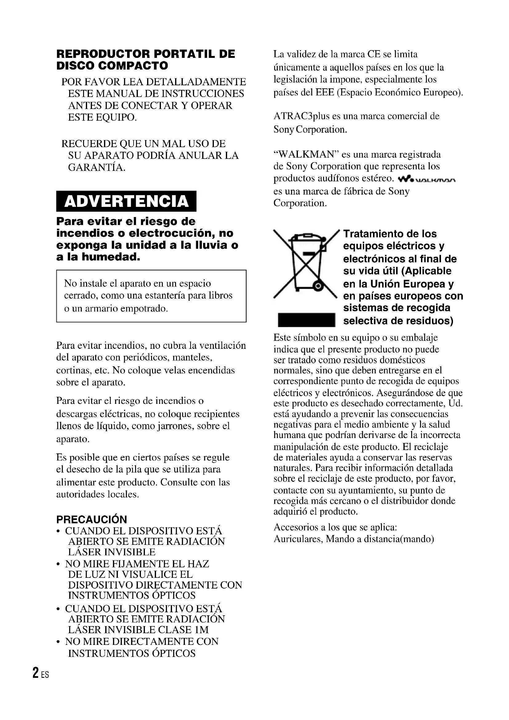 - NO MIRE DIRECTAMENTE CON INSTRUMENTOS ÓPTICOS La validez de la marca CE se limita únicamente a aquellos países en los que la legislación la impone, especialmente los países del EEE (Espacio Económico Europeo). ATRAC3plus es una marca comercial de Sony Corporation. “WALKMAN” es una marca registrada de Sony Corporation que representa los productos audífonos estéreo. es una marca de fábrica de Sony Corporation. Tratamiento de los equipos eléctricos y electrónicos al final de su vida útil (Aplicable en la Unión Europea y en países europeos con sistemas de recogida selectiva de residuos) Este símbolo en su equipo o su embalaje indica que el presente producto no puede ser tratado como residuos domésticos normales, sino que deben entregarse en el correspondiente punto de recogida de equipos eléctricos y electrónicos. Asegurándose de que este producto es desechado correctamente, Ud. está ayudando a prevenir las consecuencias negativas para el medio ambiente y la salud humana que podrían derivarse de la incorrecta manipulación de este producto. El reciclaje de materiales ayuda a conservar las reservas naturales. Para recibir información detallada sobre el reciclaje de este producto, por favor, contacte con su ayuntamiento, su punto de recogida más cercano o el distribuidor donde adquirió el producto. Accesorios a los que se aplica: Auriculares, Mando a distancia(mando) D-NE720/NE720LS.ES.2-541-637-32(1) 2 ESEn este manual se explica cómo utilizar el reproductor de CD. Consulte la “Guía de instalación/funcionamiento” para obtener información acerca del software SonicStage suministrado. Aviso para usuarios Sobre el software suministradoEn función del tipo de texto y los caracteres, es posible que el texto de SonicStage no se muestre correctamente en el dispositivo. Esto se debe a:– Las limitaciones del reproductor conectado.– Que el reproductor no funcione normalmente.Las instrucciones de este manual describen principalmente los controles del mando a distancia.En función de la región en la que se utilice el reproductor, las indicaciones mostradas en el mando a distancia pueden diferir ligeramente de las que aparecen en el Manual de instrucciones.