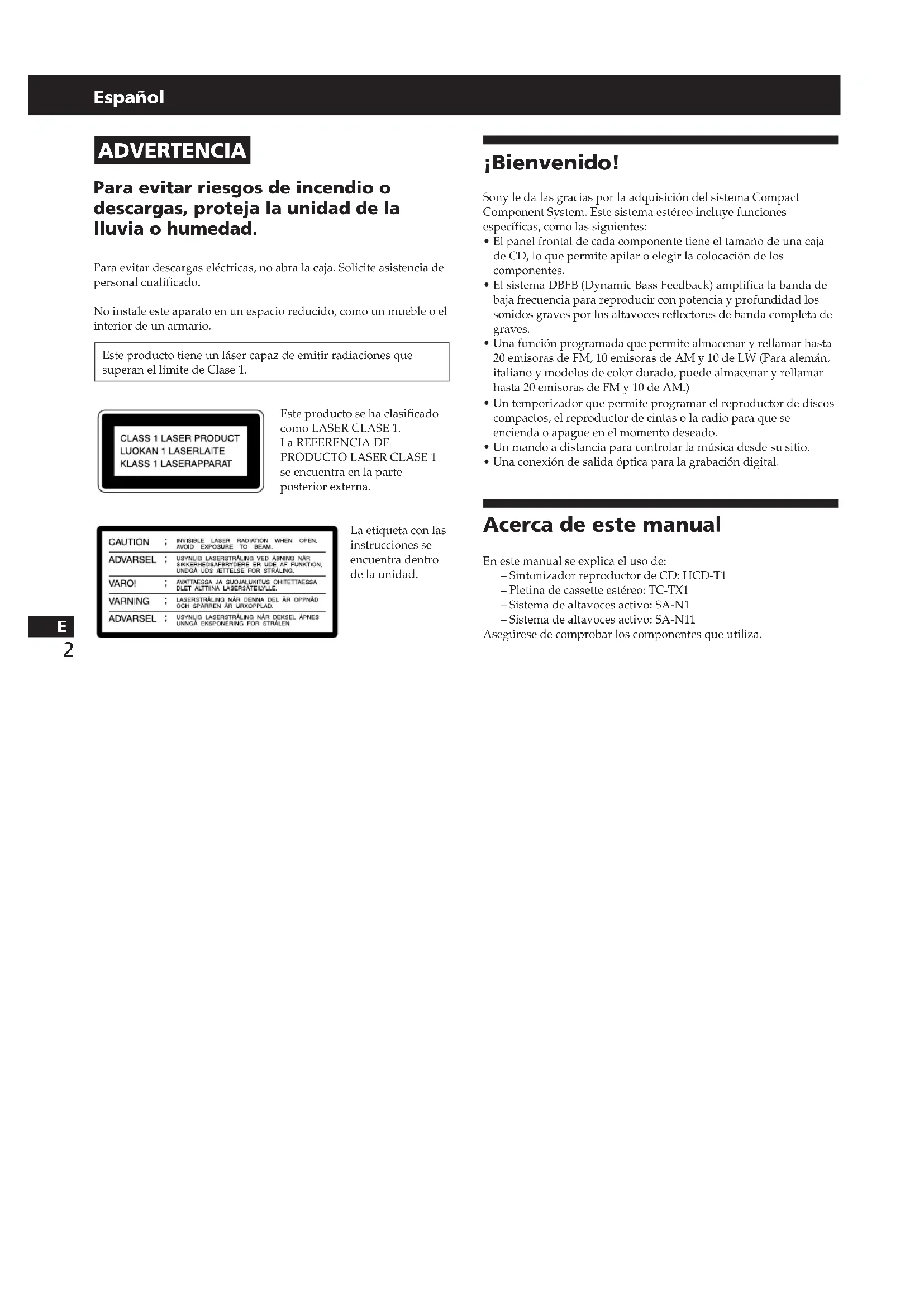 se encuentra en la parte posterior externa. La etiqueta con las instrucciones se encuentra dentro de la unidad. ¡Bienvenido! Sony le da las gracias por la adquisición del sistema Compact Component System. Este sistema estéreo incluye funciones específicas, como las siguientes: