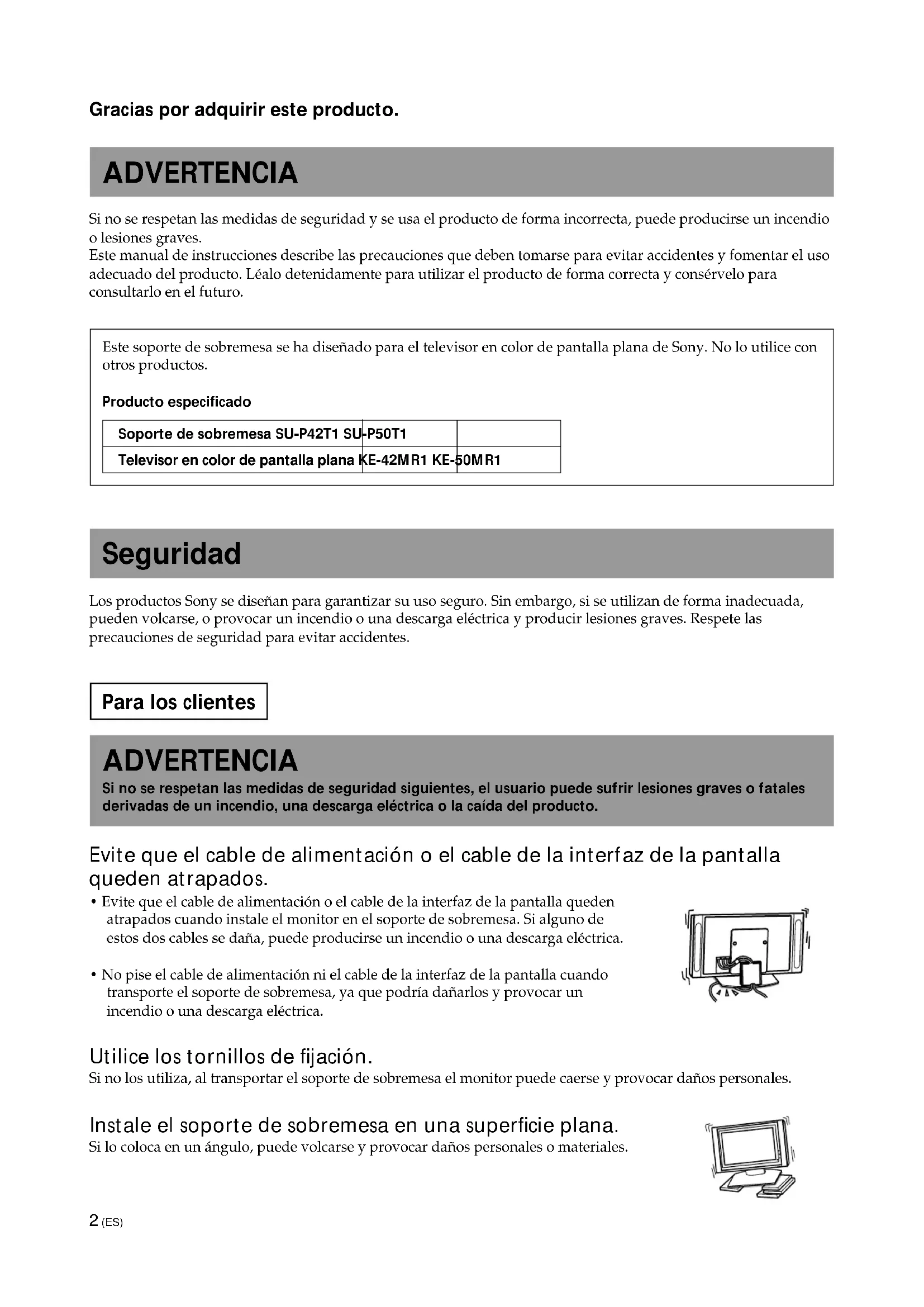 - No pise el cable de alimentación ni el cable de la interfaz de la pantalla cuando transporte el soporte de sobremesa, ya que podría dañarlos y provocar un incendio o una descarga eléctrica. Utilice los tornillos de fijación. Si no los utiliza, al transportar el soporte de sobremesa el monitor puede caerse y provocar daños personales. Instale el soporte de sobremesa en una superficie plana. Si lo coloca en un ángulo, puede volcarse y provocar daños personales o materiales.3 (ES) Instale el soporte de sobremesa en una superficie estable. Si lo instala en una superficie inestable, puede desequilibrarse o caerse y provocardaños personales o materiales. Tome las debidas precauciones para evitar que el soporte vuelque. De lo contrario, puede desequilibrarse durante un terremoto y provocar daños personales o materiales. Pase unalambre o similar a través de los orificios de fijación de seguridad situados en la parte superior de la abrazaderaprincipal y fije los otros extremos de dichos alambres a la pared para sujetar el soporte de sobremesa y evitar que secaiga. No se apoye en el soporte de sobremesa ni se agarre a él, ya que puede caerse y provocar daños personales. No obstruya los orificios de ventilación del monitor. Si cubre la parte superior del soporte de sobremesa con un paño o similar yobstruye los orificios de ventilación del monitor, éste puede sobrecalentarse yprovocar un incendio. Transporte el soporte siguiendo las indicaciones de este manual. Si lo transporta de forma incorrecta, puede volcarse y provocar daños personales. No tropiece con el cable de alimentación ni el cable de la interfaz de la pantalla, ya que el soporte de sobremesa puede volcarse y provocar daños personales. No transporte el soporte de sobremesa con el monitor instalado encima. Antes de transportar el soporte de sobremesa, retire el monitor. De lo contrario,éste puede caerse y causar daños personales. PRECAUCIÓN Si no se respetan las precauciones siguientes, el usuario puede sufrir daños personales o el productopuede resultar dañado. No instale ningún equipo distinto al producto especificado. Sony ha diseñado este soporte de sobremesa para utilizarlo con el producto especificado. Si lo utiliza con otrosproductos, puede caerse y provocar daños personales o materiales. Español ES4 (ES) Precauciones Para mantener el soporte limpio, utilice un paño suave y seco. Las manchas difíciles pueden eliminarse limpiando la zona afectada con un paño ligeramente humedecido con lavavajillas diluido y, posteriormente, secándola con un paño suave y seco. No utilice ningún producto químico, como diluyentes o bencina, ya que pueden dañar el acabado del soporte. Montaje del soporte de sobremesa Para distribuidores Sony Las instrucciones siguientes van destinadas únicamente a distribuidores Sony. Procure leer las instrucciones de seguridad descritas anteriormente y poner especial atención a la seguridad durante la instalación, mantenimiento y comprobación del producto. Se recomienda que sean dos o más las personas que lleven a cabo la instalación de la unidad. Asegúrese de que al menos dos personas realicen la instalación del monitor en el soporte de sobremesa. Si lo hace sólo una persona, puede producirse un accidente o daños personales. Monte el soporte de sobremesa correctamente siguiendo las instrucciones de este manual. Si algún tornillo queda flojo o se cae, el soporte de sobremesa puede decantarse y volcarse, o el monitor puede caerse y provocar daños personales o materiales. Instale el monitor firmemente siguiendo el procedimiento adecuado. Apriete los tornillos con firmeza. De lo contrario, el monitor puede caerse y provocar daños personales. Tenga cuidado de no pillarse las manos o los dedos cuando monte el soporte de sobremesa. Tenga cuidado de no pillarse las manos o los dedos cuando monte el soporte de sobremesa o instale el monitor. Precauciones a tener en cuenta durante la instalación