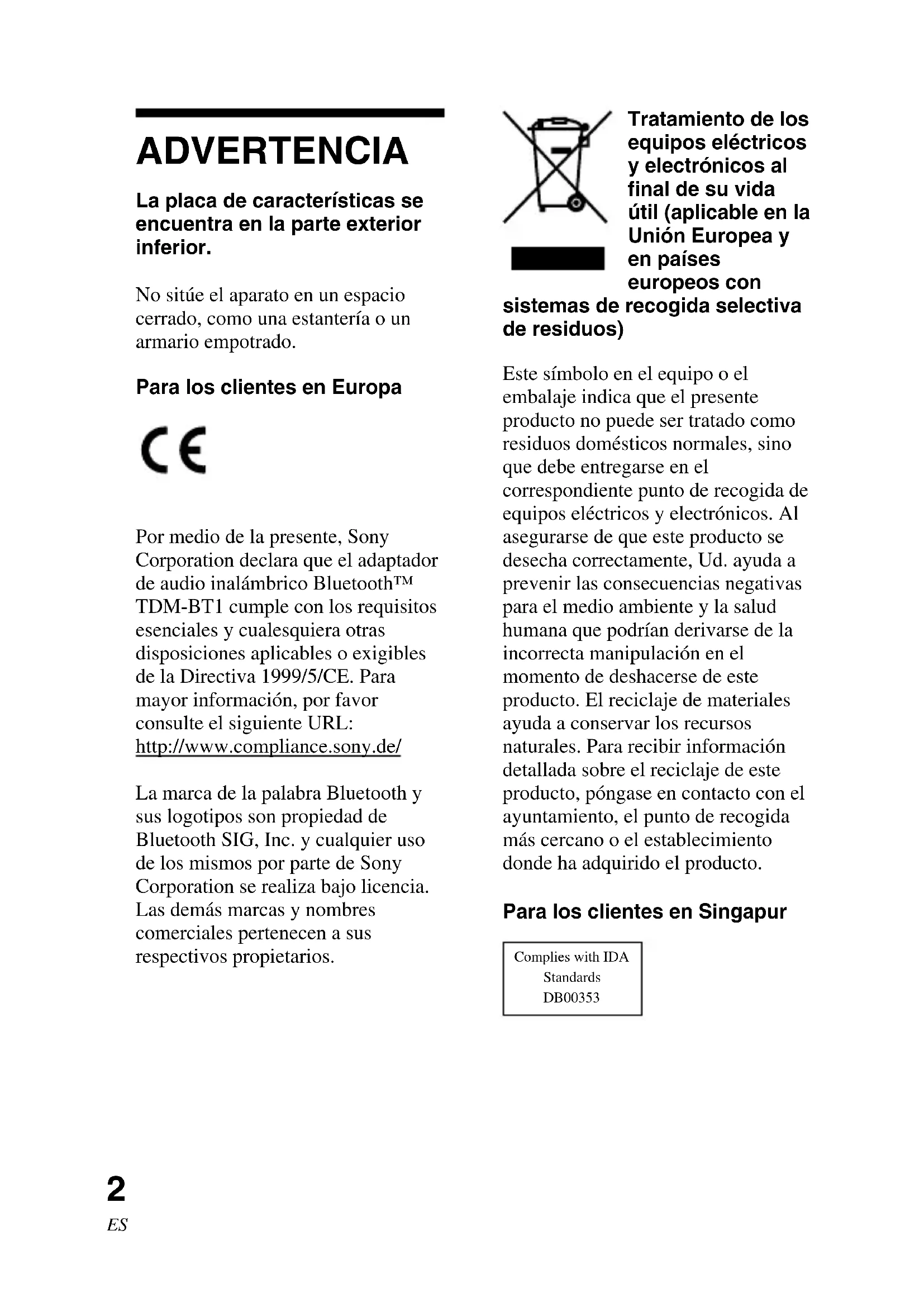 La placa de características se encuentra en la parte exterior inferior. No sitúe el aparato en un espacio cerrado, como una estantería o un armario empotrado. Para los clientes en Europa ADVERTENCIA Por medio de la presente, Sony Corporation declara que el adaptador de audio inalámbrico Bluetooth™ TDM-BT1 cumple con los requisitos esenciales y cualesquiera otras disposiciones aplicables o exigibles de la Directiva 1999/5/CE. Para mayor información, por favor consulte el siguiente URL: http://www.compliance.sony.de/ La marca de la palabra Bluetooth y sus logotipos son propiedad de Bluetooth SIG, Inc. y cualquier uso de los mismos por parte de Sony Corporation se realiza bajo licencia. Las demás marcas y nombres comerciales pertenecen a sus respectivos propietarios. Tratamiento de los equipos eléctricos y electrónicos al final de su vida útil (aplicable en la Unión Europea y en países europeos con sistemas de recogida selectiva de residuos) Este símbolo en el equipo o el embalaje indica que el presente producto no puede ser tratado como residuos domésticos normales, sino que debe entregarse en el correspondiente punto de recogida de equipos eléctricos y electrónicos. Al asegurarse de que este producto se desecha correctamente, Ud. ayuda a prevenir las consecuencias negativas para el medio ambiente y la salud humana que podrían derivarse de la incorrecta manipulación en el momento de deshacerse de este producto. El reciclaje de materiales ayuda a conservar los recursos naturales. Para recibir información detallada sobre el reciclaje de este producto, póngase en contacto con el ayuntamiento, el punto de recogida más cercano o el establecimiento donde ha adquirido el producto. Para los clientes en Singapur Complies with IDA Standards DB00353TDM-BT1 [ES] 3-095-404-11(1)