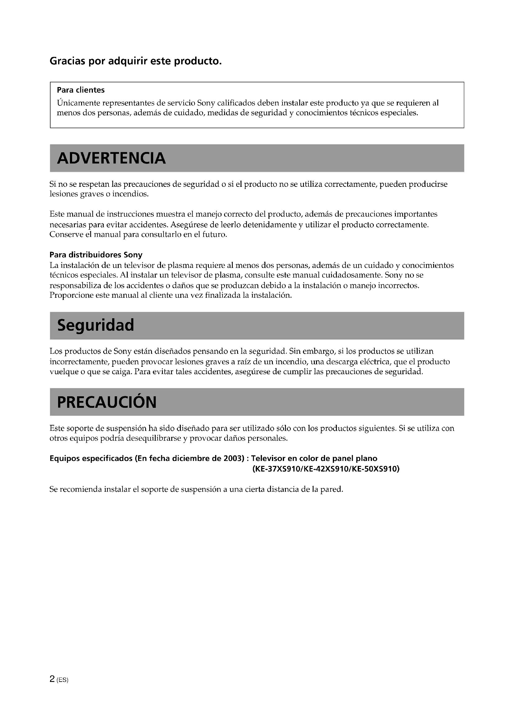 (1)2 (ES) Gracias por adquirir este producto. Para clientes Únicamente representantes de servicio Sony calificados deben instalar este producto ya que se requieren al menos dos personas, además de cuidado, medidas de seguridad y conocimientos técnicos especiales. ADVERTENCIA Si no se respetan las precauciones de seguridad o si el producto no se utiliza correctamente, pueden producirse lesiones graves o incendios. Este manual de instrucciones muestra el manejo correcto del producto, además de precauciones importantes necesarias para evitar accidentes. Asegúrese de leerlo detenidamente y utilizar el producto correctamente. Conserve el manual para consultarlo en el futuro. Para distribuidores Sony La instalación de un televisor de plasma requiere al menos dos personas, además de un cuidado y conocimientos técnicos especiales. Al instalar un televisor de plasma, consulte este manual cuidadosamente. Sony no se responsabiliza de los accidentes o daños que se produzcan debido a la instalación o manejo incorrectos. Proporcione este manual al cliente una vez finalizada la instalación. Seguridad Los productos de Sony están diseñados pensando en la seguridad. Sin embargo, si los productos se utilizan incorrectamente, pueden provocar lesiones graves a raíz de un incendio, una descarga eléctrica, que el producto vuelque o que se caiga. Para evitar tales accidentes, asegúrese de cumplir las precauciones de seguridad. PRECAUCIÓN Este soporte de suspensión ha sido diseñado para ser utilizado sólo con los productos siguientes. Si se utiliza con otros equipos podría desequilibrarse y provocar daños personales. Equipos especificados (En fecha diciembre de 2003) : Televisor en color de panel plano (KE-37XS910/KE-42XS910/KE-50XS910) Se recomienda instalar el soporte de suspensión a una cierta distancia de la pared.3 (ES) Español