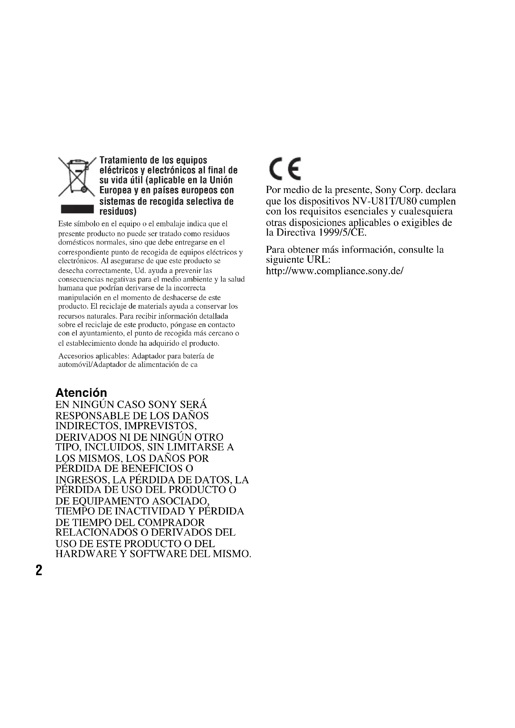 HARDWARE Y SOFTWARE DEL MISMO. Por medio de la presente, Sony Corp. declara que los dispositivos NV-U81T/U80 cumplen con los requisitos esenciales y cualesquiera otras disposiciones aplicables o exigibles de la Directiva 1999/5/CE. Para obtener más información, consulte la siguiente URL: http://www.compliance.sony.de/ Tratamiento de los equipos eléctricos y electrónicos al final de su vida útil (aplicable en la Unión Europea y en países europeos con sistemas de recogida selectiva de residuos) Este símbolo en el equipo o el embalaje indica que el presente producto no puede ser tratado como residuos domésticos normales, sino que debe entregarse en el correspondiente punto de recogida de equipos eléctricos y electrónicos. Al asegurarse de que este producto se desecha correctamente, Ud. ayuda a prevenir las consecuencias negativas para el medio ambiente y la salud humana que podrían derivarse de la incorrecta manipulación en el momento de deshacerse de este producto. El reciclaje de materials ayuda a conservar los recursos naturales. Para recibir información detallada sobre el reciclaje de este producto, póngase en contacto con el ayuntamiento, el punto de recogida más cercano o el establecimiento donde ha adquirido el producto. Accesorios aplicables: Adaptador para batería de automóvil/Adaptador de alimentación de caTabla de contenido