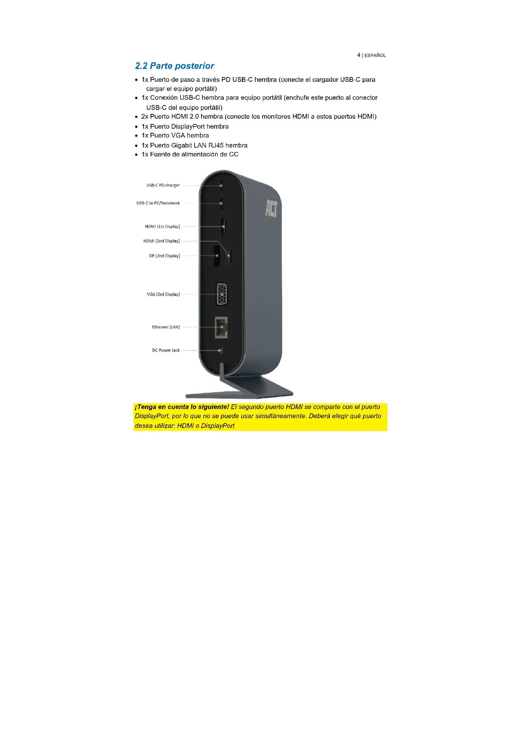 1x Puerto de paso a través PD USB-C hembra (conecte el cargador USB-C para cargar el equipo portátil) 1x Conexión USB-C hembra para equipo portátil (enchufe este puerto al conector USB-C del equipo portátil) 2x Puerto HDMI 2.0 hembra (conecte los monitores HDMI a estos puertos HDMI) 1x Puerto DisplayPort hembra 1x Puerto VGA hembra 1x Puerto Gigabit LAN RJ45 hembra 1x Fuente de alimentación de CC