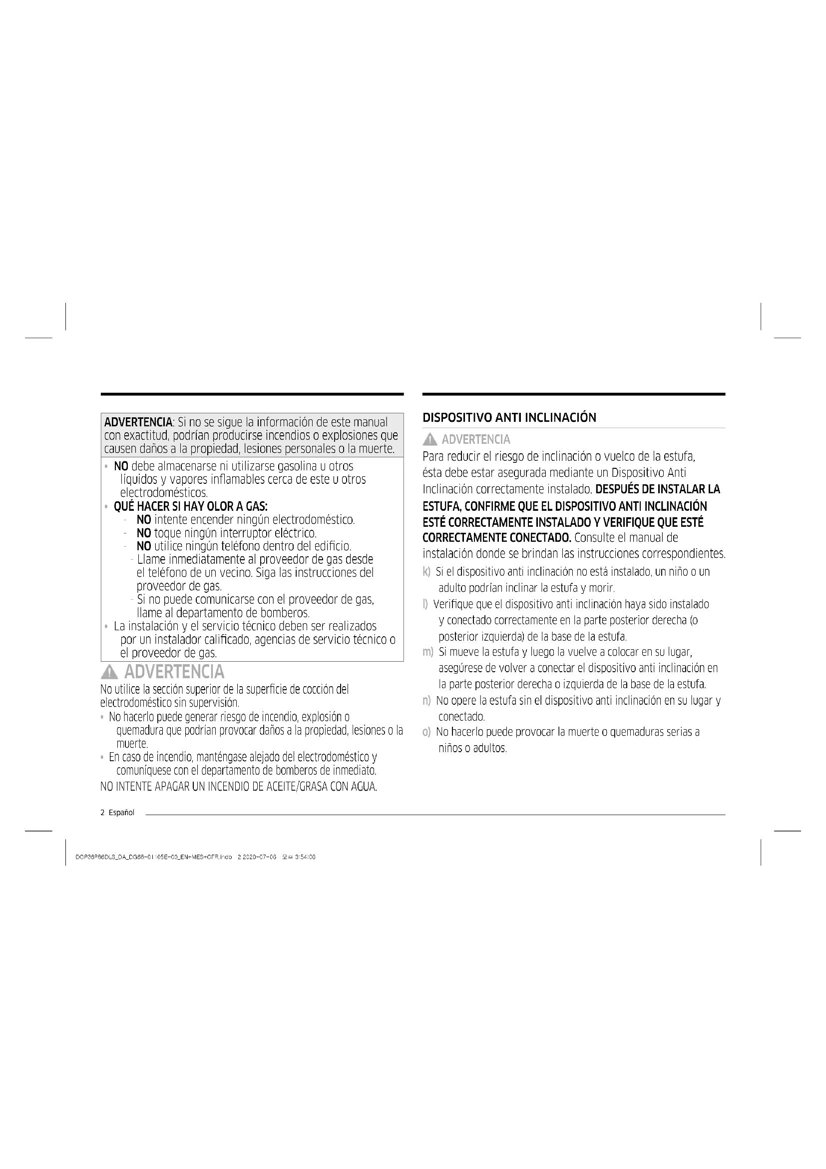 - En caso de incendio, manténgase alejado del electrodoméstico y comuníquese con el departamento de bomberos de inmediato. NO INTENTE APAGAR UN INCENDIO DE ACEITE/GRASA CON AGUA. DOP36P86DLS_DA_DG68-01105E-00_EN+MES+CFR.indb 2 2020-07-06 오후 3:54:00Español 3 ADVERTENCIA No se pare sobre la puerta del horno de la estufa, ni se apoye o siente sobre ella. Puede causar que la estufa se incline o vuelque, produciendo quemaduras o lesiones severas. Conrme que el dispositivo anti inclinación se encuentre instalado correctamente. Luego, para vericar que dicho dispositivo esté conectado, tome el borde superior trasero de la estufa y cuidadosamente intente inclinarla hacia adelante. El dispositivo anti inclinación debería prevenir que la estufa se incline hacia adelante más de unas pocas pulgadas. Si, por cualquier razón, hala la estufa alejándola de la pared, asegúrese de que el dispositivo anti inclinación encaje correctamente cuando empuje la estufa a su lugar contra la pared. Si no se encuentra encajado, hay riesgo de que la estufa se incline o vuelque y cause lesiones si usted o un niño se parasen, sentasen o apoyasen sobre una puerta abierta. Nunca retire completamente las patas niveladoras. Si las retira, la estufa no quedará sujeta correctamente al dispositivo anti inclinación. Aviso sobre regulaciones