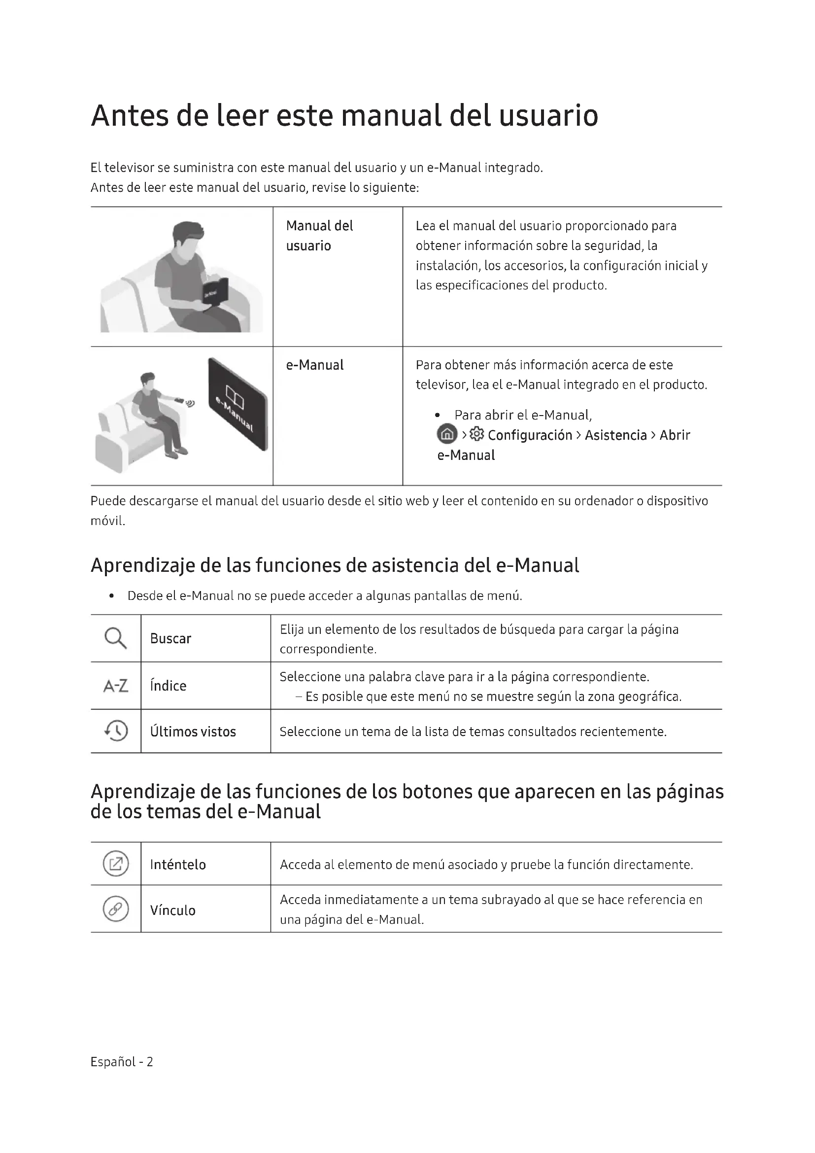 - Para abrir el e-Manual, > Configuración > Asistencia > Abrir e-Manual Puede descargarse el manual del usuario desde el sitio web y leer el contenido en su ordenador o dispositivo móvil. Aprendizaje de las funciones de asistencia del e-Manual