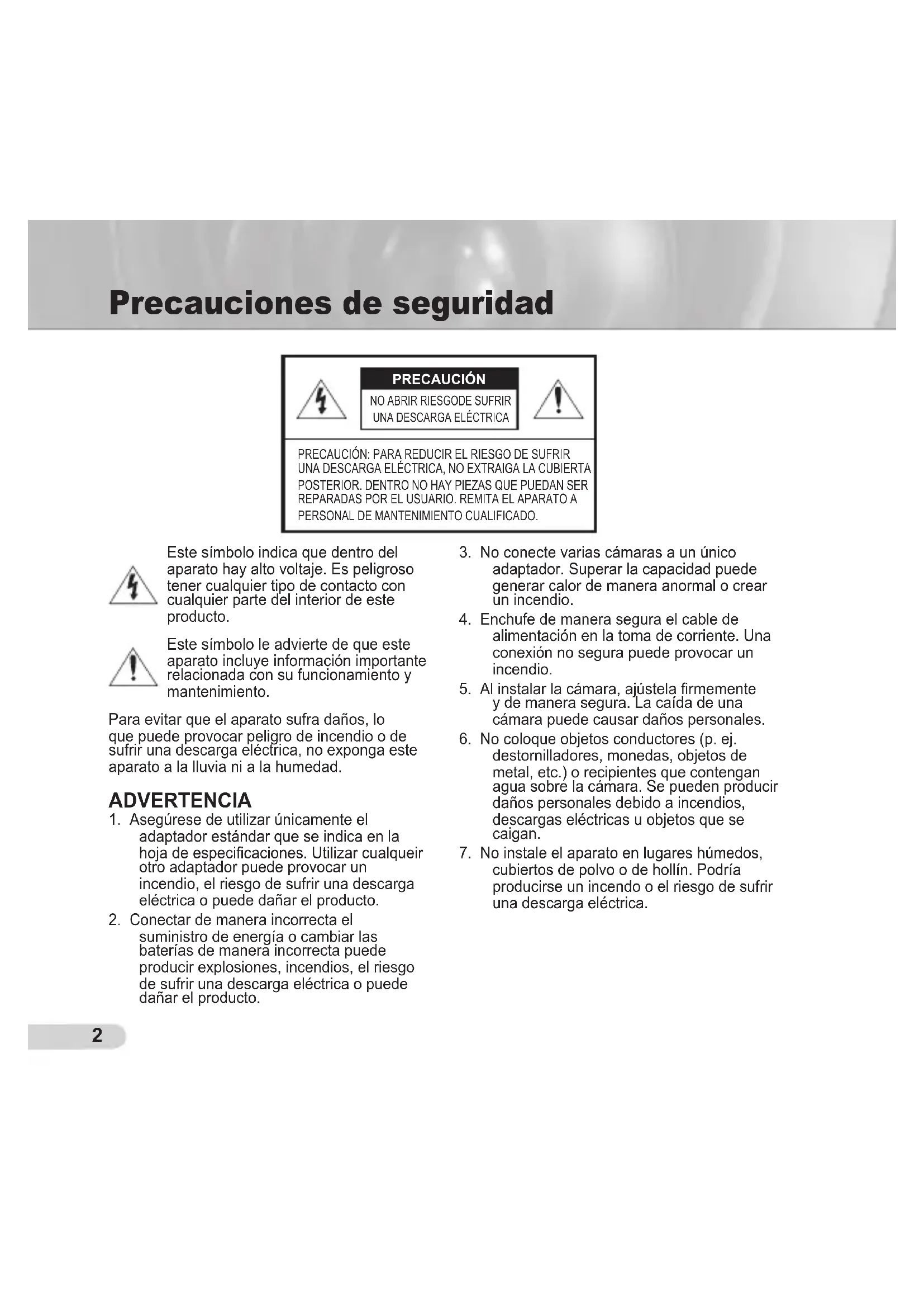 8. Si la unidad desprende un olor u humo inusual, deje de utilizar el aparato. En caso de que esto ocurra, desconecte inmediatamente la fuente de energía y póngase en contacto con el servicio técnico. El uso continuado del aparato en esas condiciones puede provocar un incendio o el riesgo de sufrir una descarga eléctrica.9. Si este producto deja de funcionar con normalidad, póngase en contacto con el servicio técnico más cercano. Nunca intente desmontar o modificar este producto de ninguna manera. (SAMSUNG no se hace responsable de los problemas producidos por modificaciones no autorizadas o por intentos de reparaciones.)10. Al limpiar el producto, no rocíe sus piezas directamente con agua. Podría producirse un incendo o el riesgo de sufrir una descarga eléctrica. PRECAUCIÓN 1. No deje objetos sobre el producto ni aplique una fuerte presión sobre él. Manténgalo lejos de lugares sujetos una demasiadas vibraciones o a interferencias magnéticas. 2. No lo instale en lugares con temperaturas elevadas (más de 50°C), temperaturas bajas (menos de -10°C) o humedad elevada. Podría producirse un incendo o el riesgo de sufrir una descarga eléctrica. 3. Si desea cambiar de ubicación el aparato ya instalado, asegúrese de desconectar el suministro de energía. Una vez esté desconectado, mueva el aparato o vuelva a instalarlo. 4. Desconecte el enchufe de la toma de corriente cuando hay rayos. Si no lo hace, puede producirse un incendio o el aparato puede dañarse.5. Mantenga el aparato alejado de la luz solar directa y de las fuentes que irradien calor. Se puede producir un incendio.6. Instale el aparato en un lugar bien ventilado.7. Evite dirigir la cámara directamente hacia objetos extremadamente brillantes como, por ejemplo, el sol, puesto que puede dañar el sensor de imagen CCD. Declaración de la Comisión Federal de Comunicaciones de Estados Unidos de América (FCC) Este aparato cumple con la parte 15 de la normativa de la FCC. El funcionamiento está sujeto a las dos condiciones siguientes:1) Este aparato no puede producir interferencias perjudiciales y2) Este aparato debe aceptar cualquier interferencia recibida, incluidas las interferencias que puedan provocar un funcionamiento incorrecto. Nota Este aparato ha sido probado y se ha determinado que se encuentra dentro de los límites para ser clasificado como un aparato digital de Clase A, de conformidad a la parte 15 de la normativa de la FCC. Estos límites se han fijado para ofrecer protección suficiente contra las interferencias perjudiciales cuando el equipo está en funcionamiento en un entorno comercial. Este aparato genera, utiliza y puede irradiar energía por radiofrecuencias y si no es instalado y utilizado siguiendoel manual de instrucciones, puede producir interferencias perjudiciales para las comunicaciones por radio. Es probable que el funcionamiento de este equipo en una zona residencial provoque interferencias perjudiciales. En ese caso, el usuario tendrá que hacerse cargo de los gastos que conlleve corregir la emisión de interferencias. AB68-00648C(01)Spa.indd 3 2007-03-19 ¿ÀÀü 10:47:114