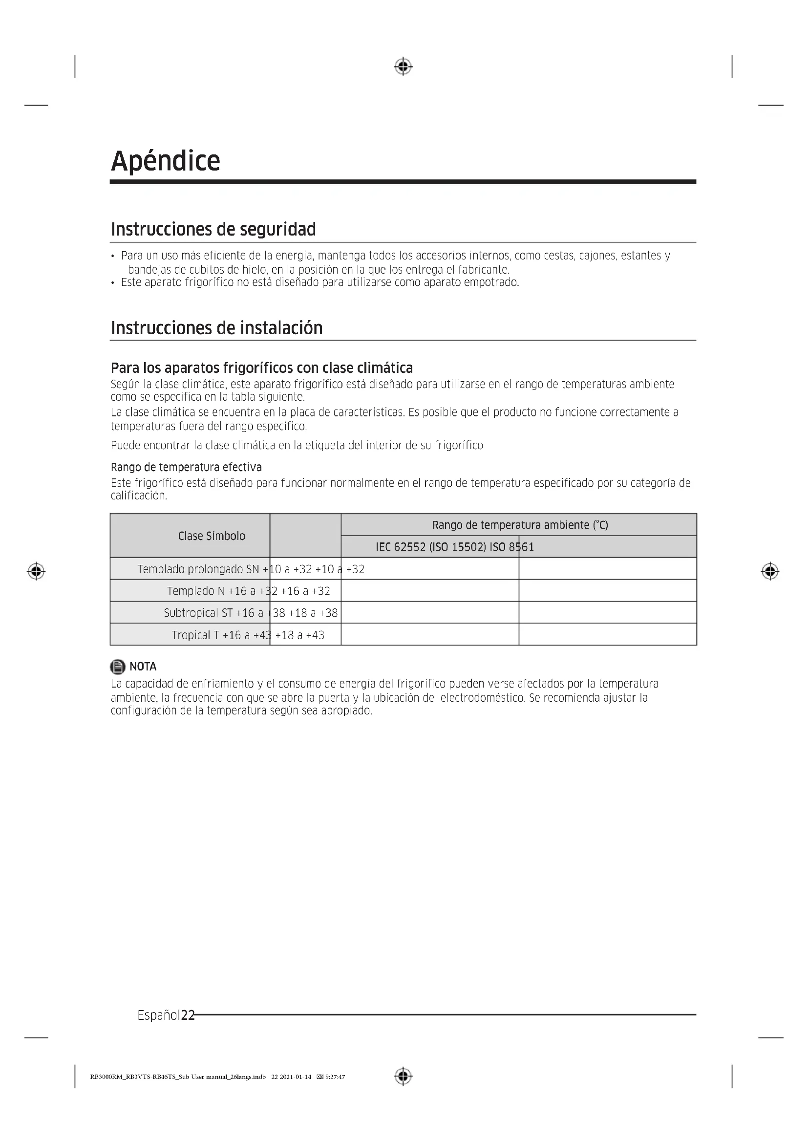 Templado prolongado SN +10 a +32 +10 a +32 Templado N +16 a +32 +16 a +32 Subtropical ST +16 a +38 +18 a +38 Tropical T +16 a +43 +18 a +43 NOTA La capacidad de enfriamiento y el consumo de energía del frigorífico pueden verse afectados por la temperatura ambiente, la frecuencia con que se abre la puerta y la ubicación del electrodoméstico. Se recomienda ajustar la configuración de la temperatura según sea apropiado. RB3000RM_RB3VTS-RB46TS_Sub User manual_26langs.indb 22 2021-01-14 9:27:47Español 23 Instrucciones sobre la temperatura Temperatura recomendada Ajuste perfecto de temperatura para el almacenamiento de alimentos: